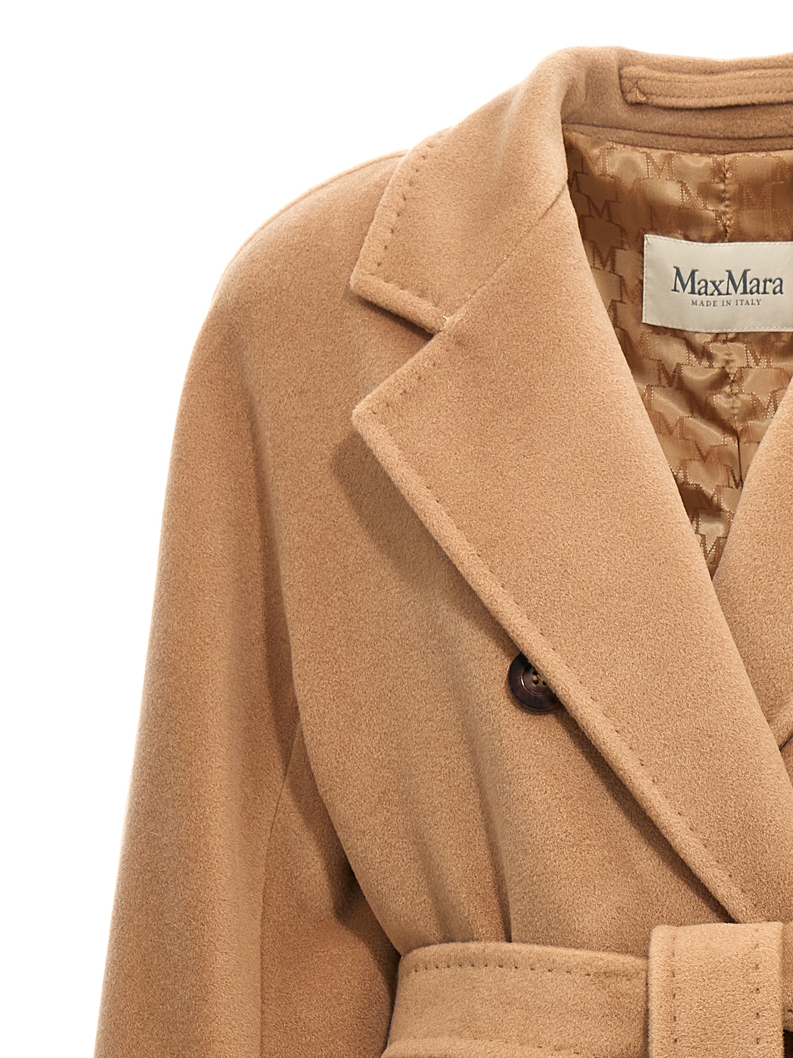 ‘Madame – 101801 Icon Coat’ wool and cashmere beaver coat finished with tailored dot, double-breasted style with front button closure, pockets, long kimono sleeves with fold-up cuffs, monogram cupro lining, removable belt.