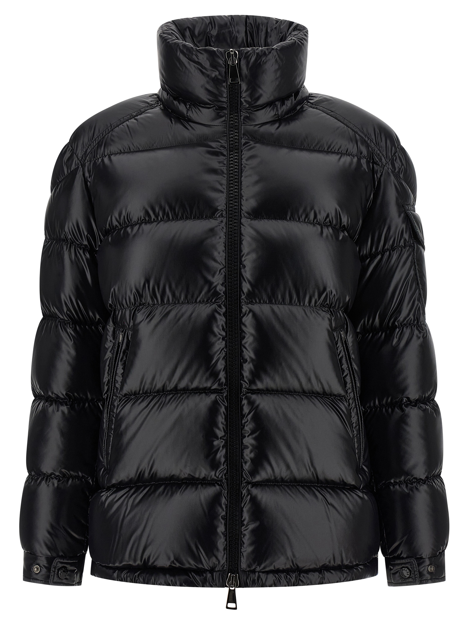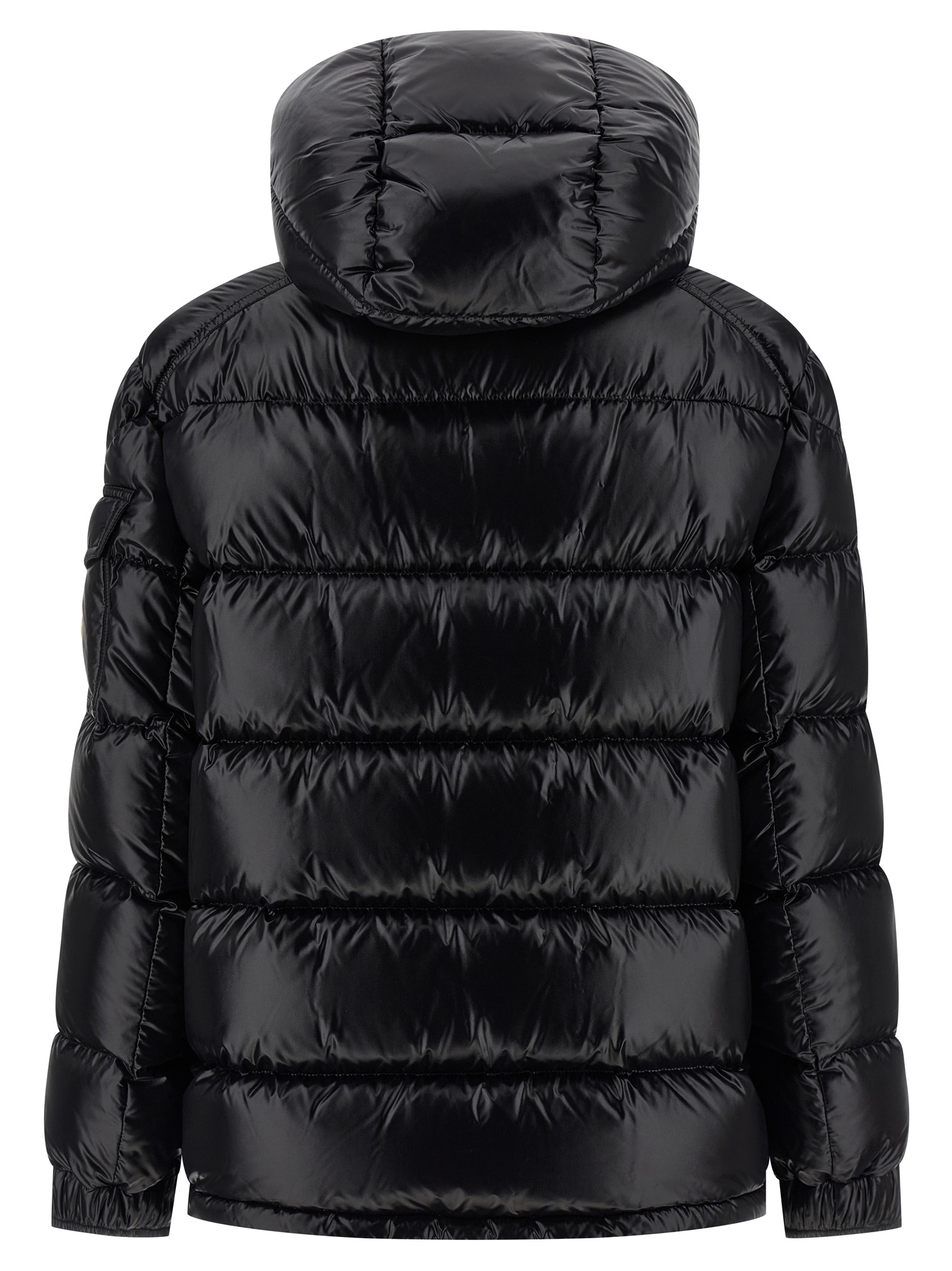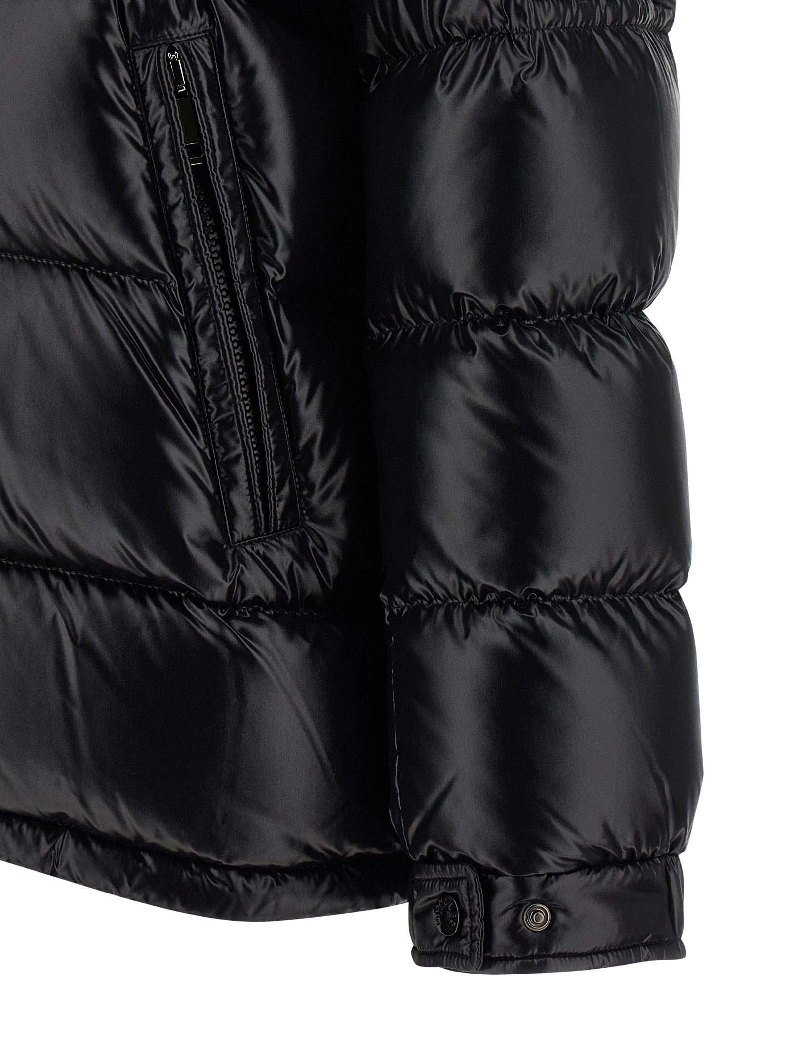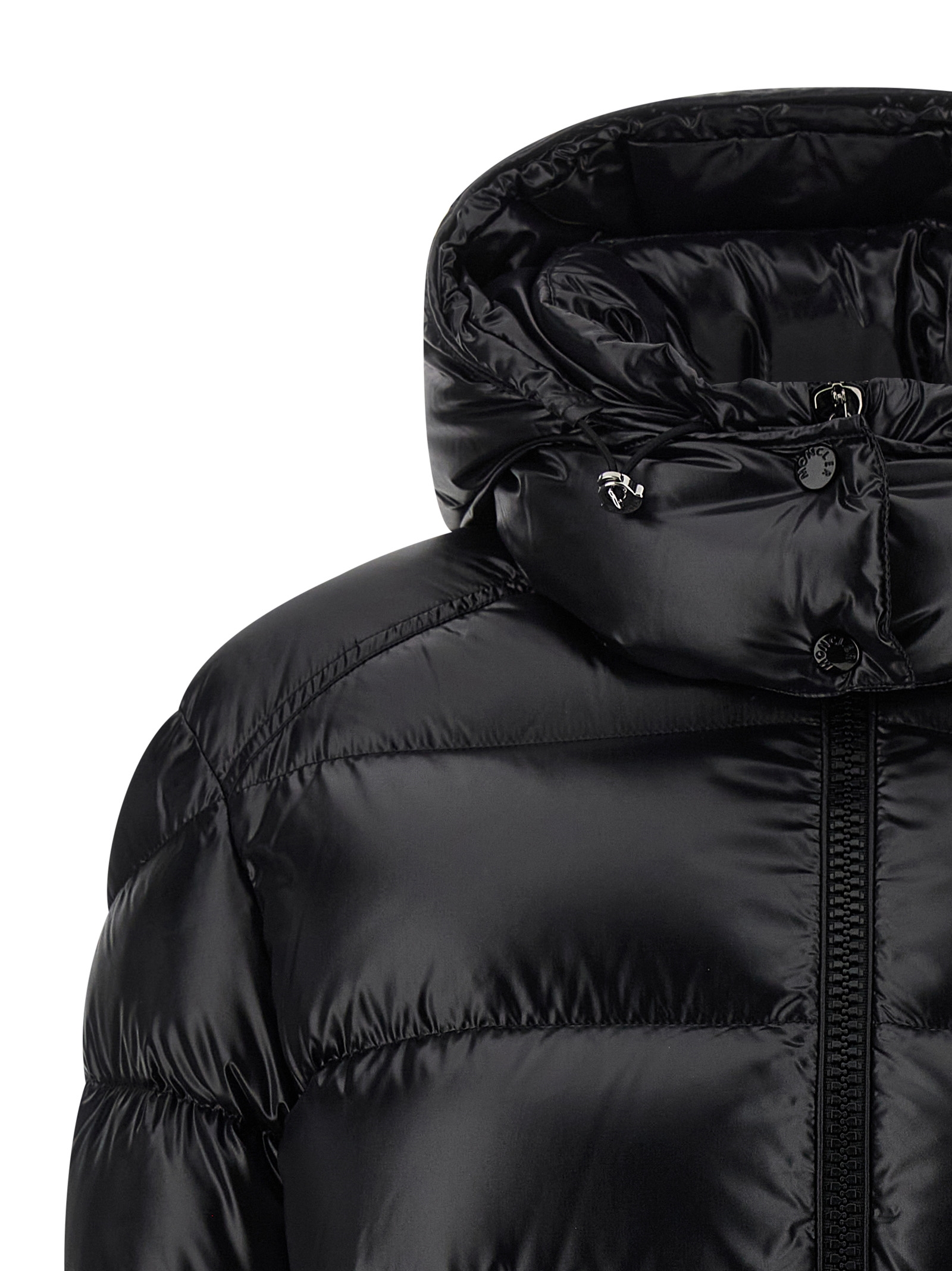 ‘Maire’ quilted nylon jacket with goose down padding, adjustable and removable hood, standing collar, front zip closure, pockets, long sleeves with elastic cuffs and felt logo patch, drawstring at the hem.