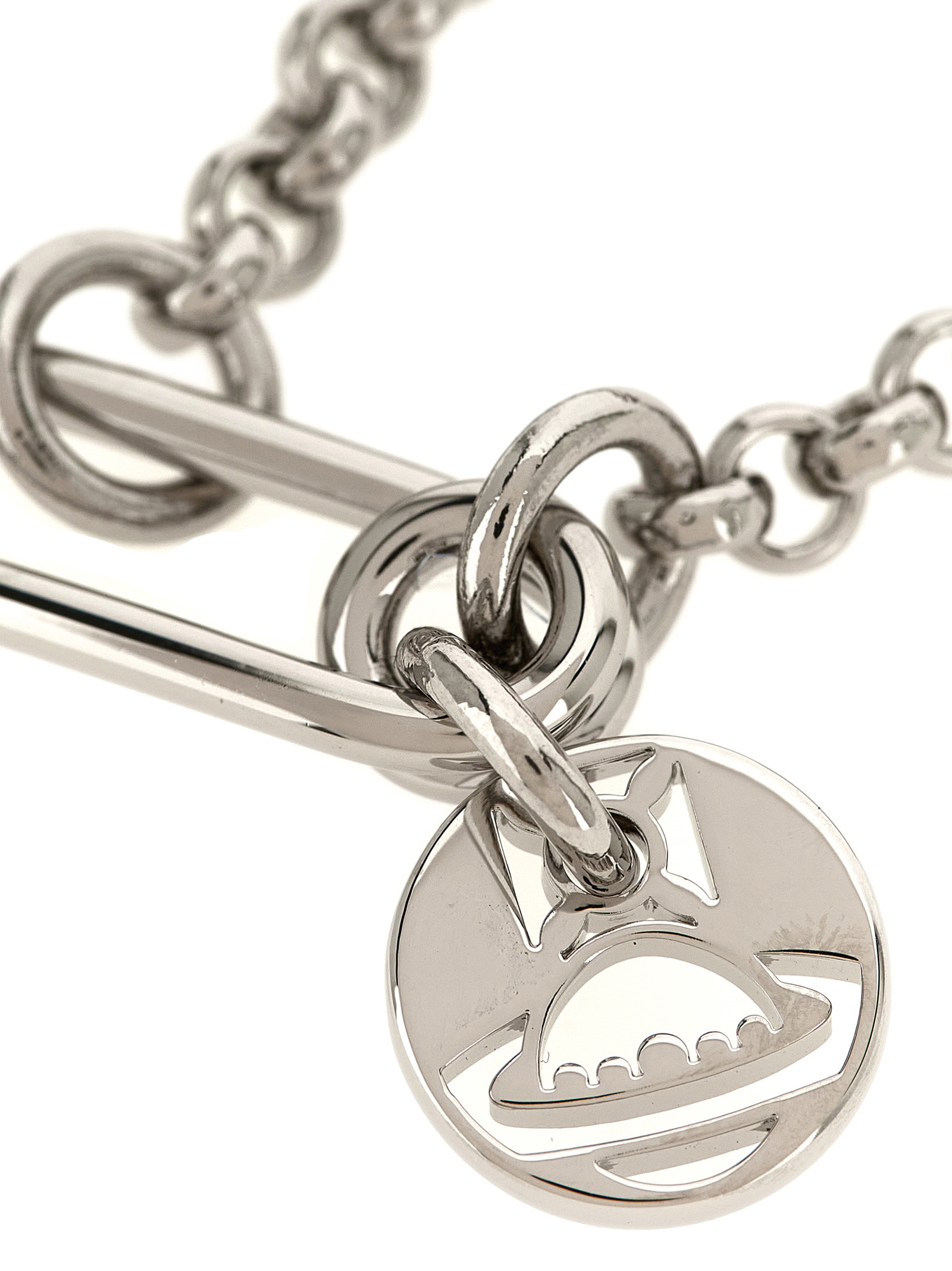 ‘Man Imogene’ metal chain necklace, safety pin with engraved logo and adjustable perforated ‘Orb’ pendant charm and snap hook closure.
