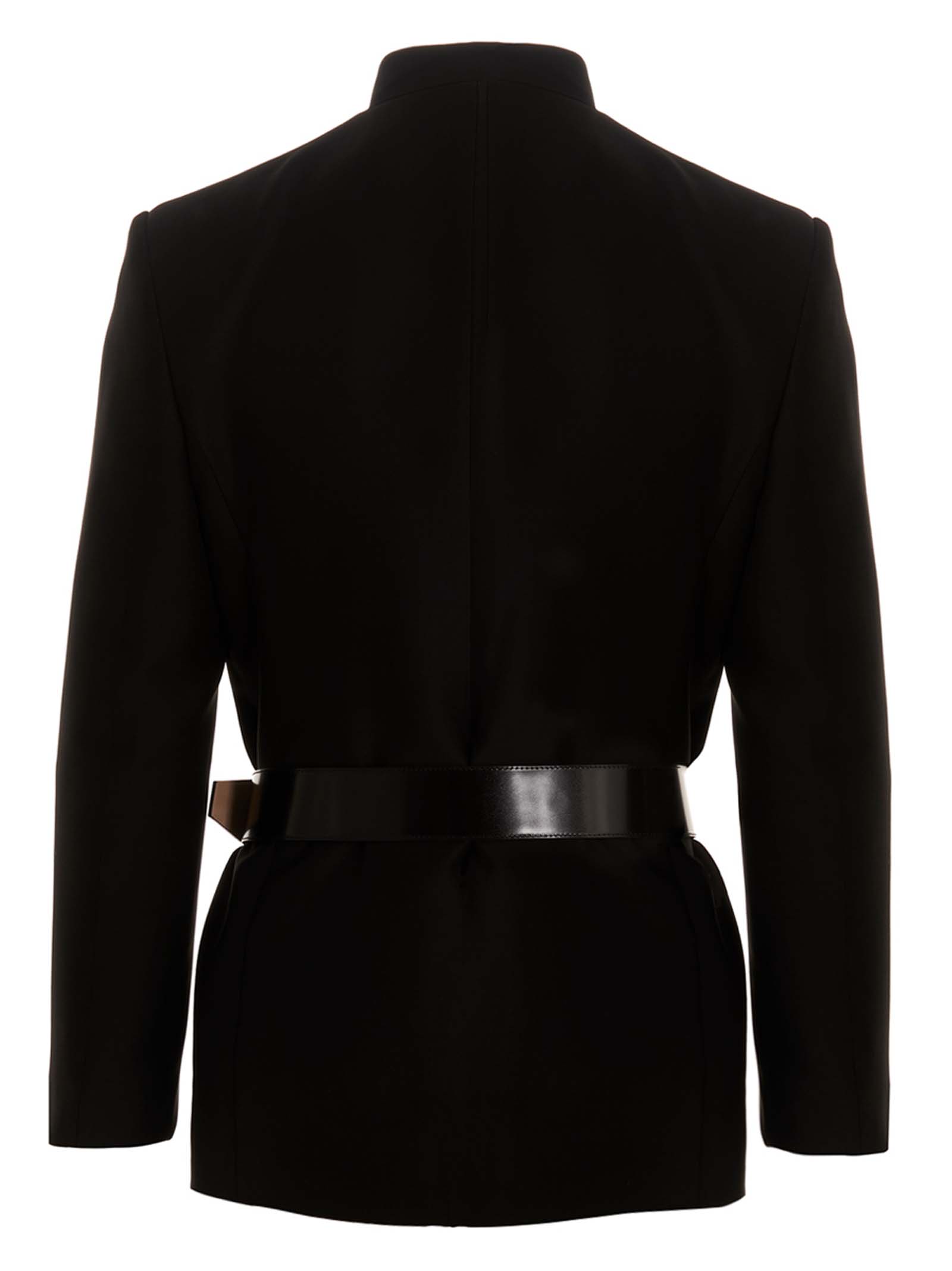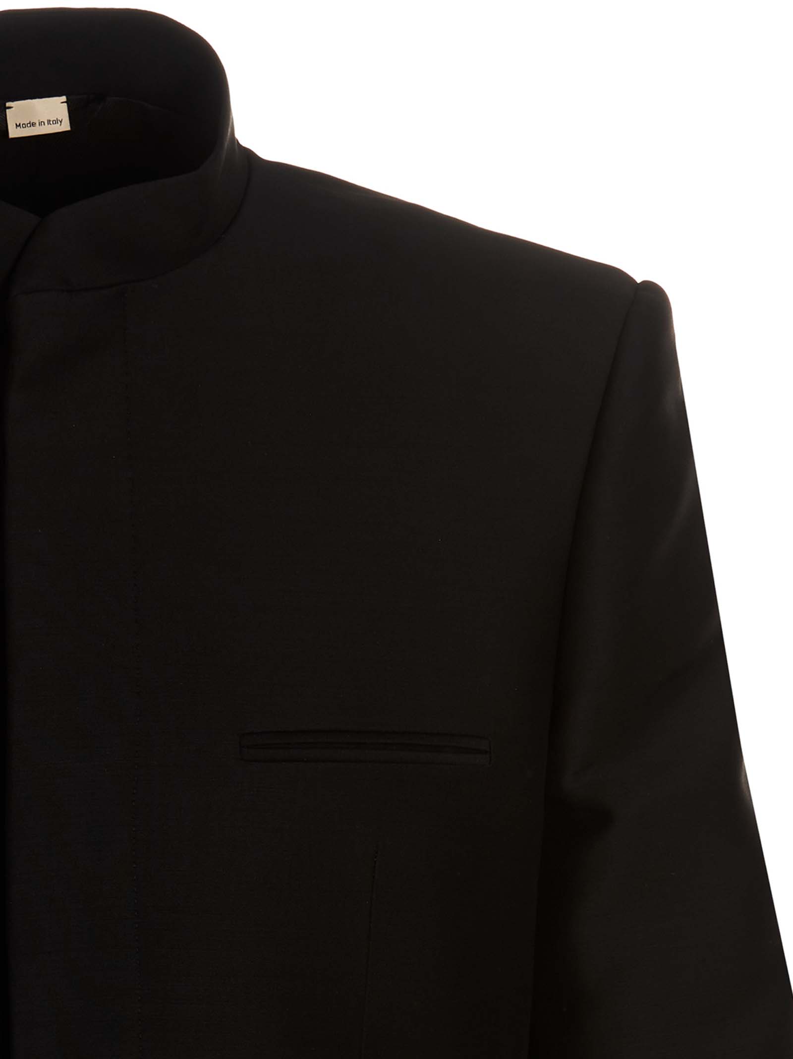 Wool and silk single breast blazer jacket with covered button closure and mandarin collar detail.