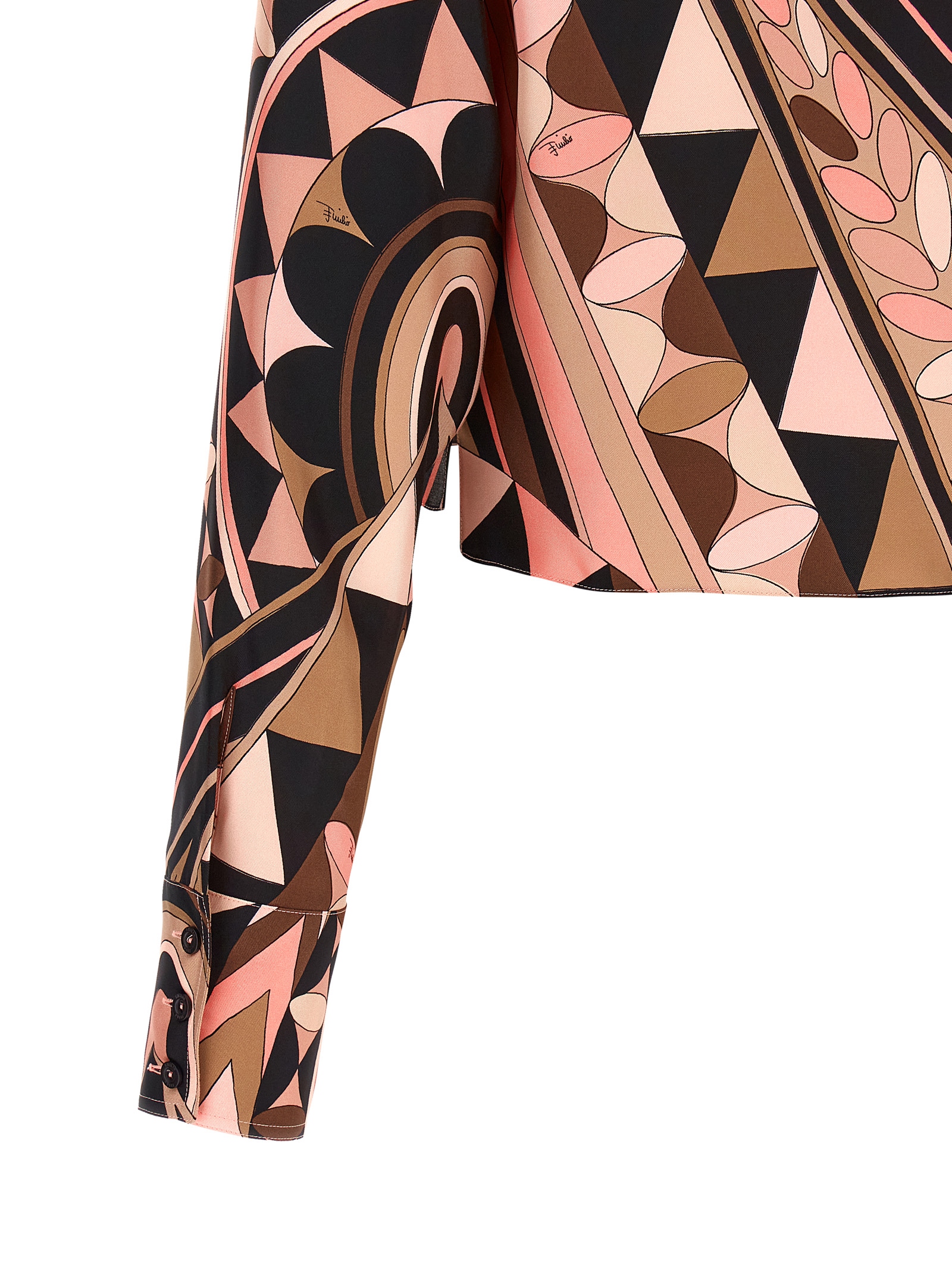 ‘Manuba’ print silk twill shirt, crop model, tailored construction, pointed collar with the possibility of tying it high with buttons, front button closure, long sleeves with cuffs, side slits on the hem.