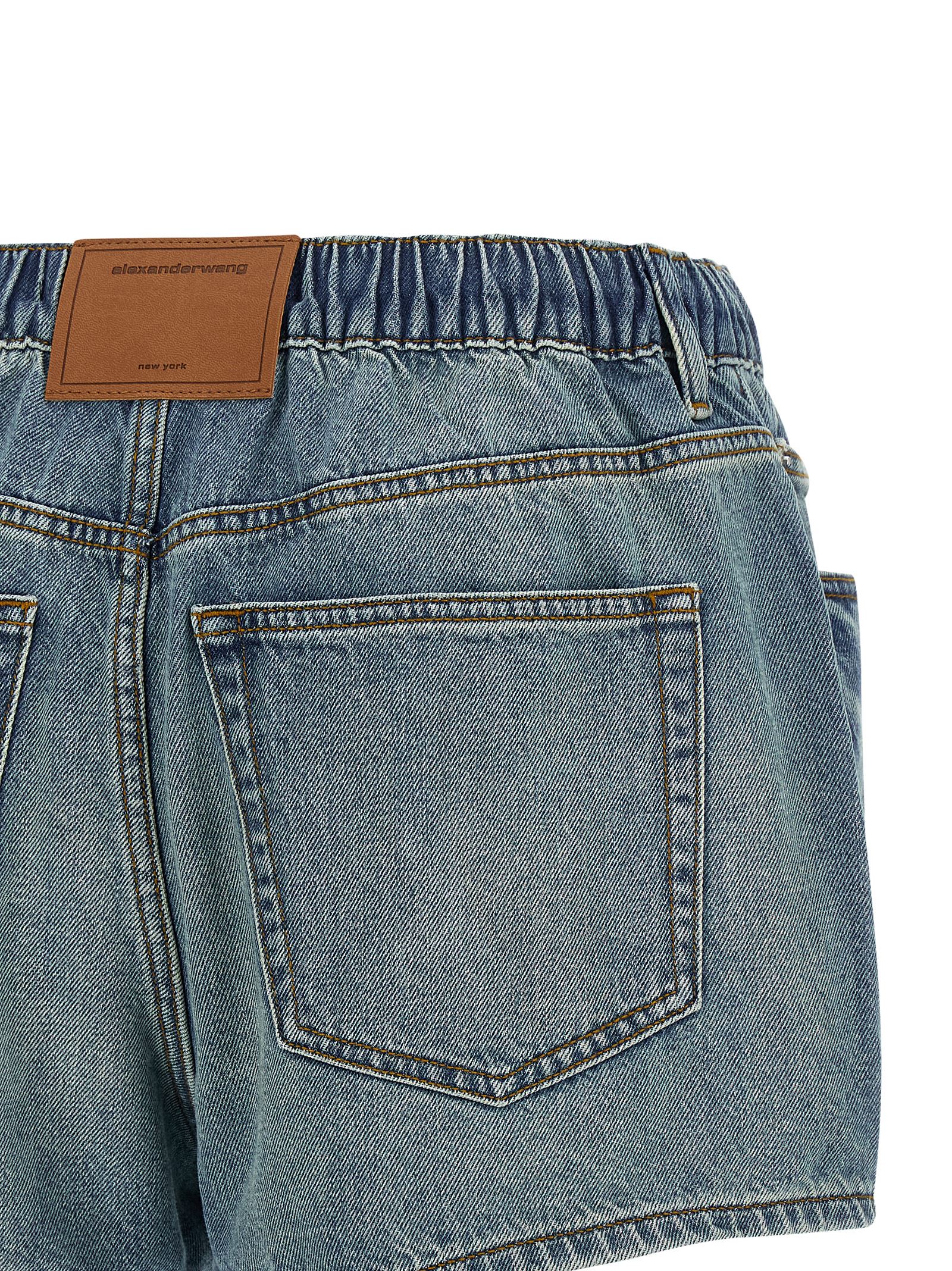 Marathon shorts in stone-washed cotton denim with contrast stitching, elastic with crystal drawstring at the waist, front zip and button closure, five pockets, and leather logo label at the back.