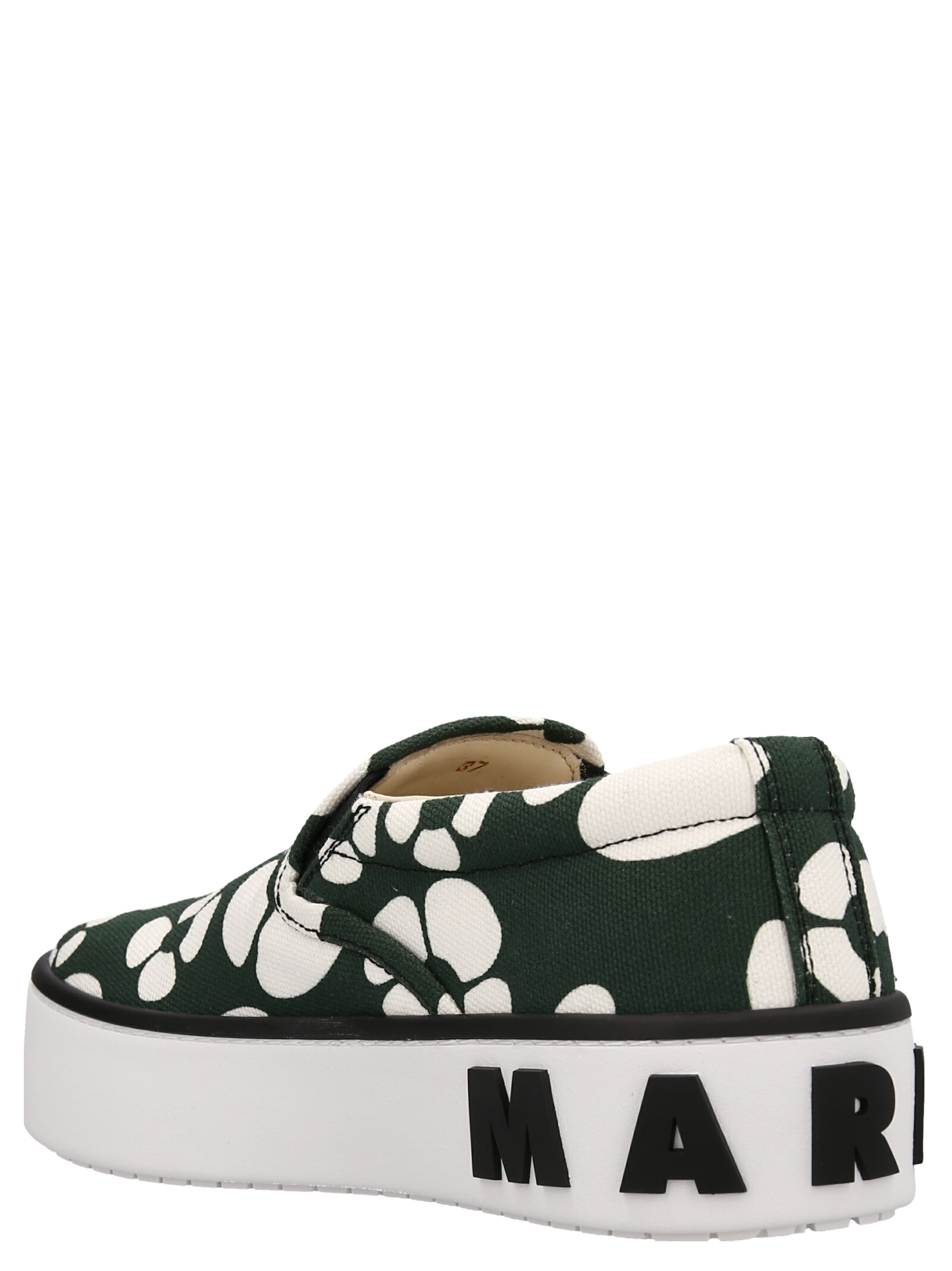 Marni x Car extension, with floareal print canvas slip on sneakers, logo patch, a rubber platform sole with maxi logo.