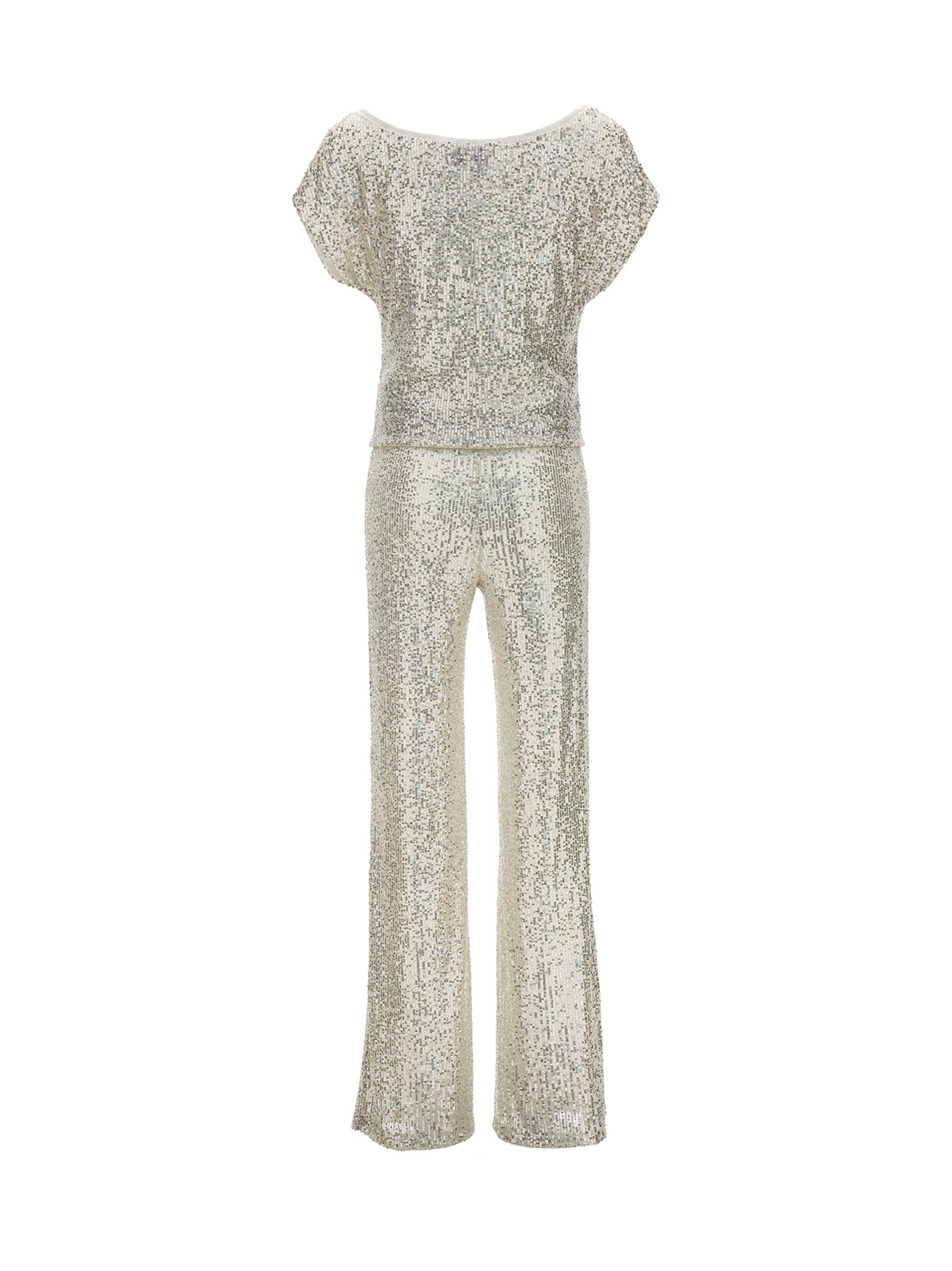 Mascia’ one-piece bodysuit in a stretch fabric with all-over sequin appliqués, round neckline, elastic waistband and a long leg.