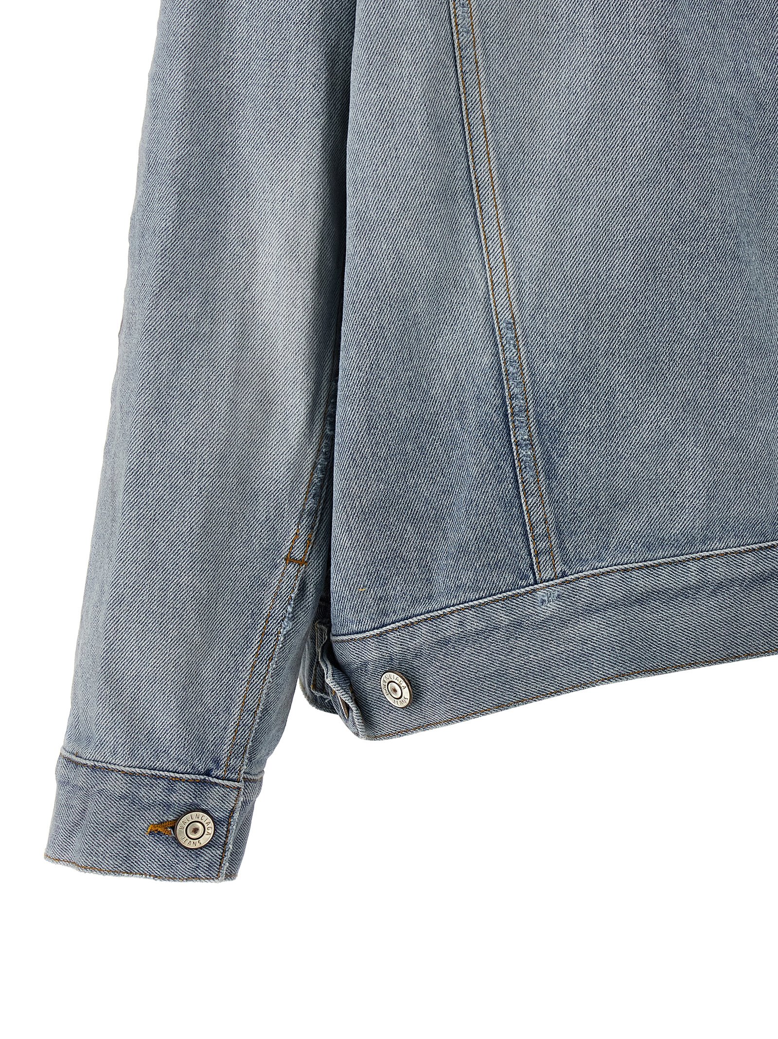Used-effect cotton denim jacket with contrast stitching, back ‘Masking Tape’ print, shirt collar, front button closure, pockets, long cuffed sleeves and dropped shoulders.