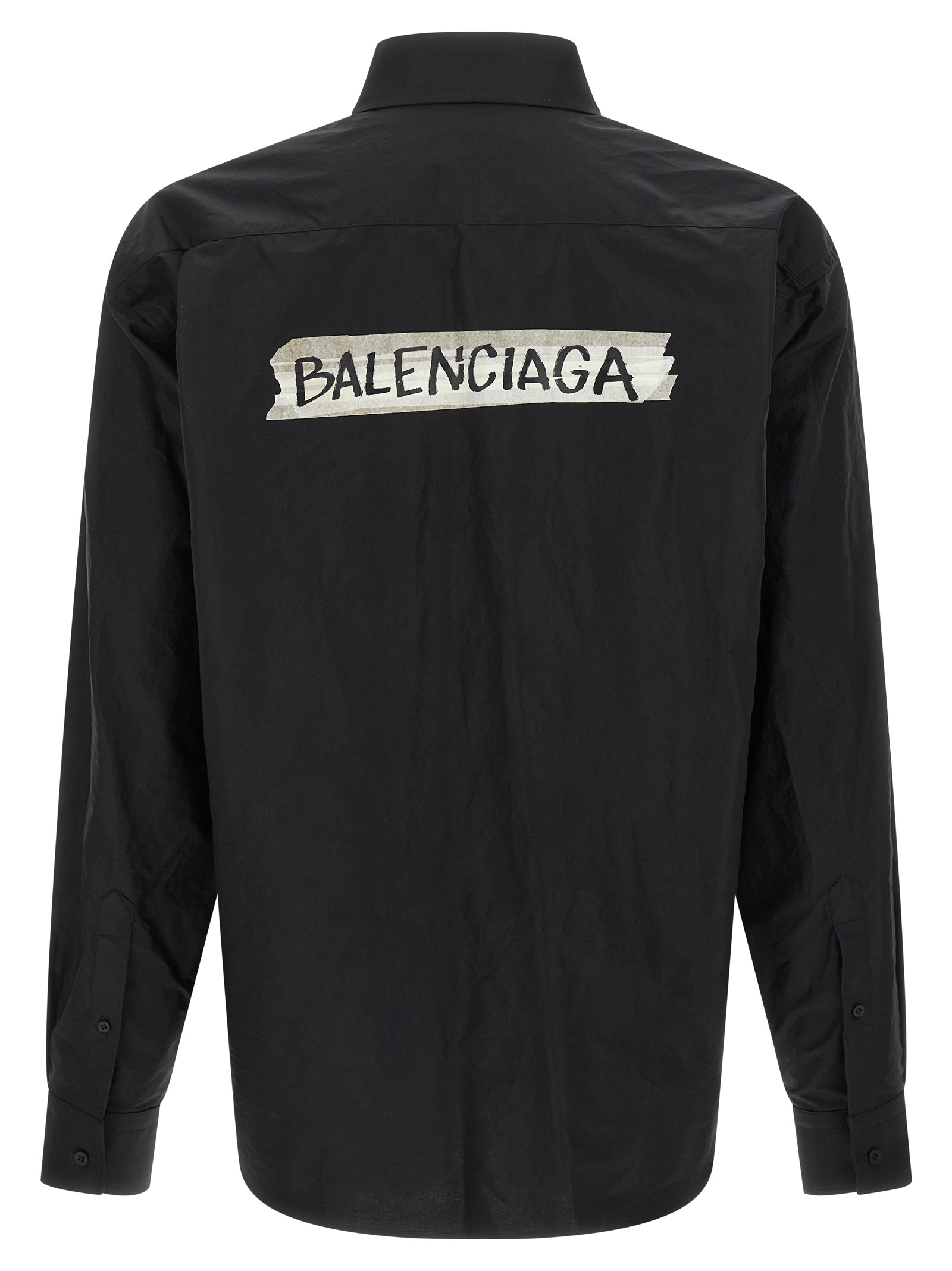 Button-down cotton poplin shirt with ‘Masking Tape’ print on the front and back, breast pocket, front button closure, long cuffed sleeves and dropped shoulders.