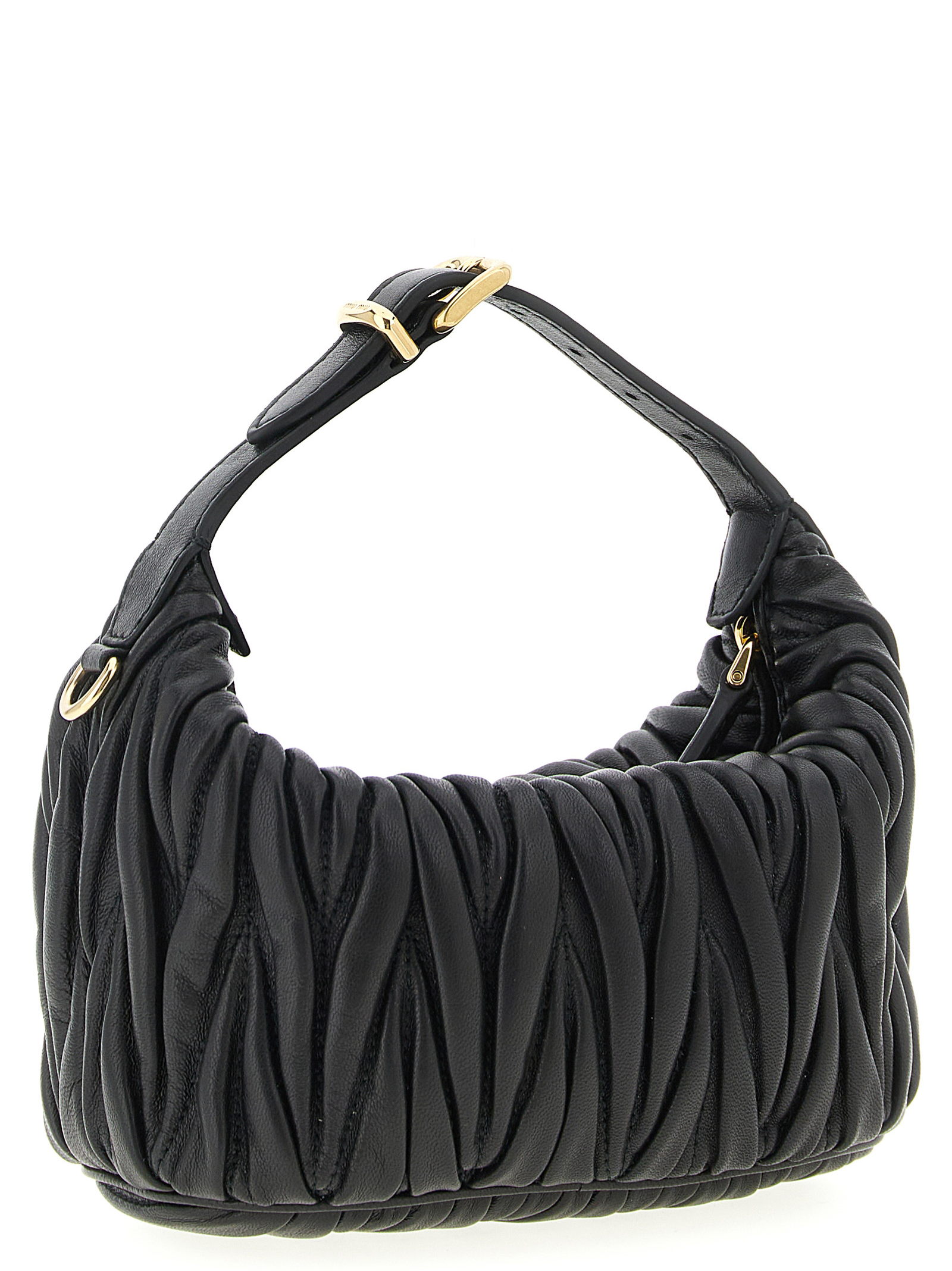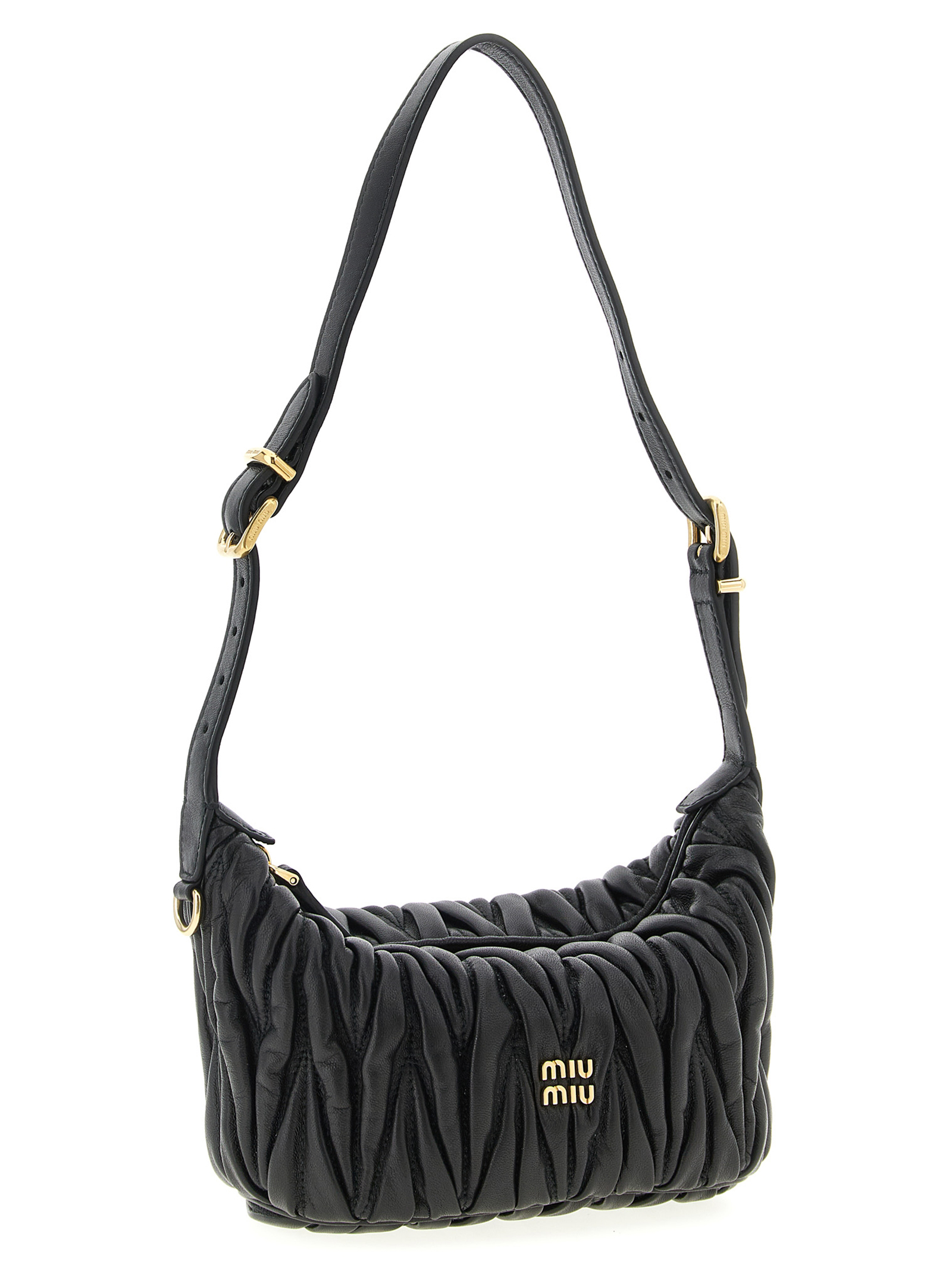 Matelassé nappa pouch, adjustable leather handle, zip closure, front metal lettering logo.