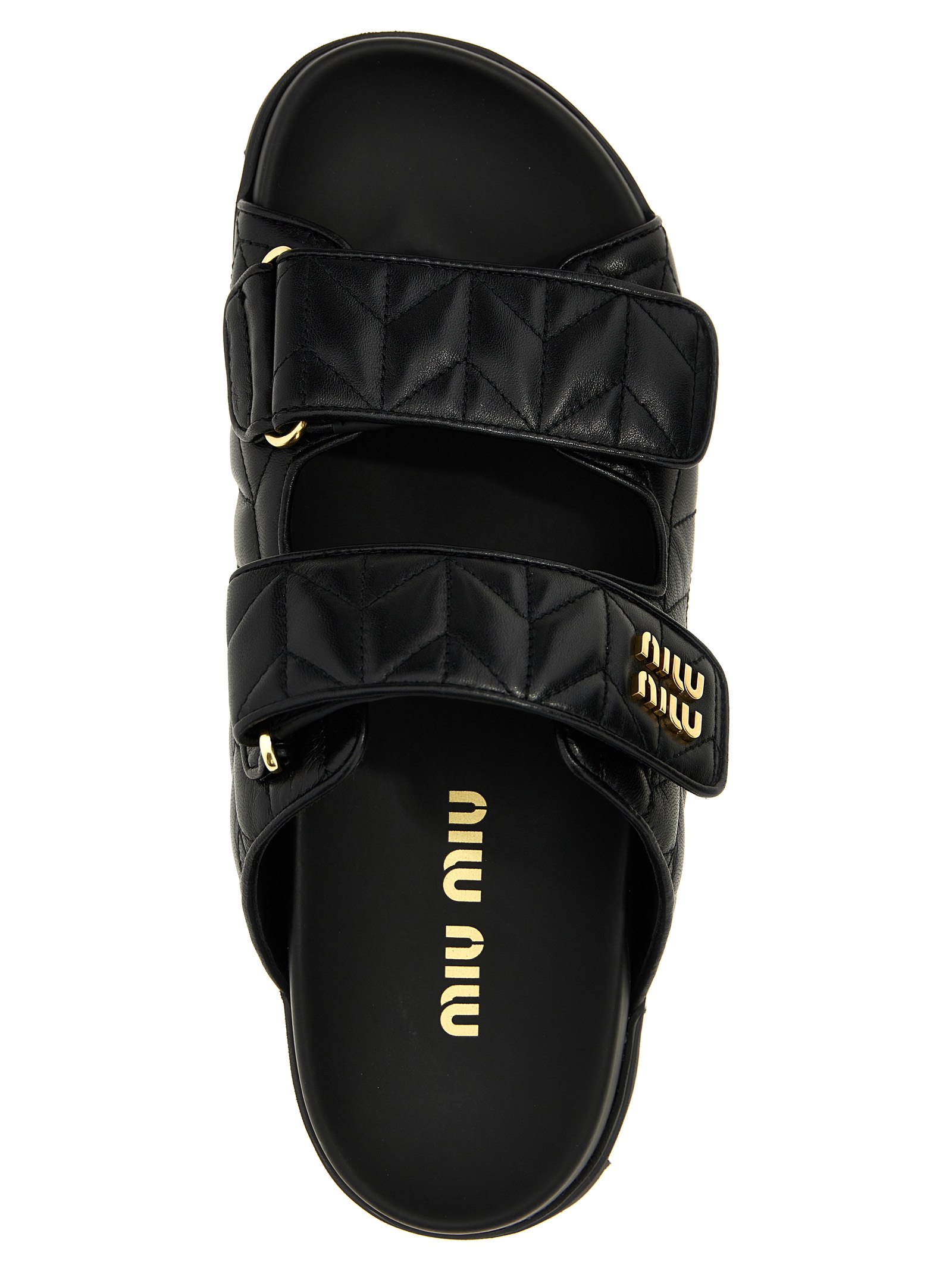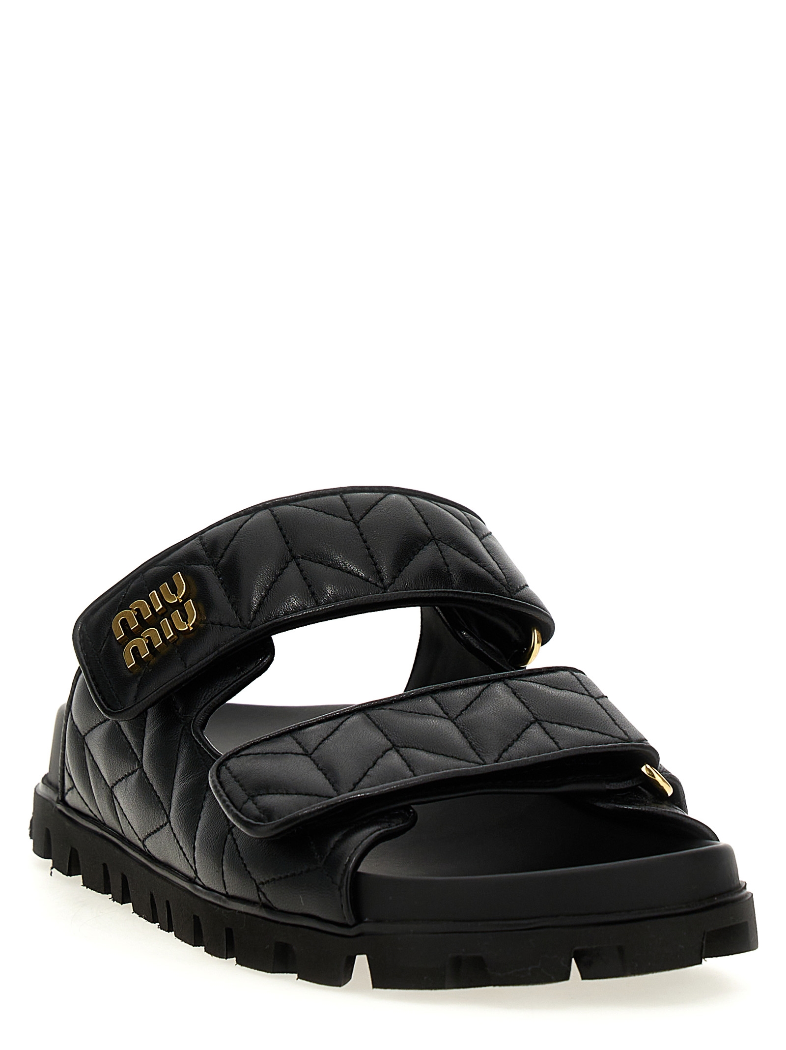 Matelassé nappa sandals, adjustable velcro bands with metal logo application, rubber sole.