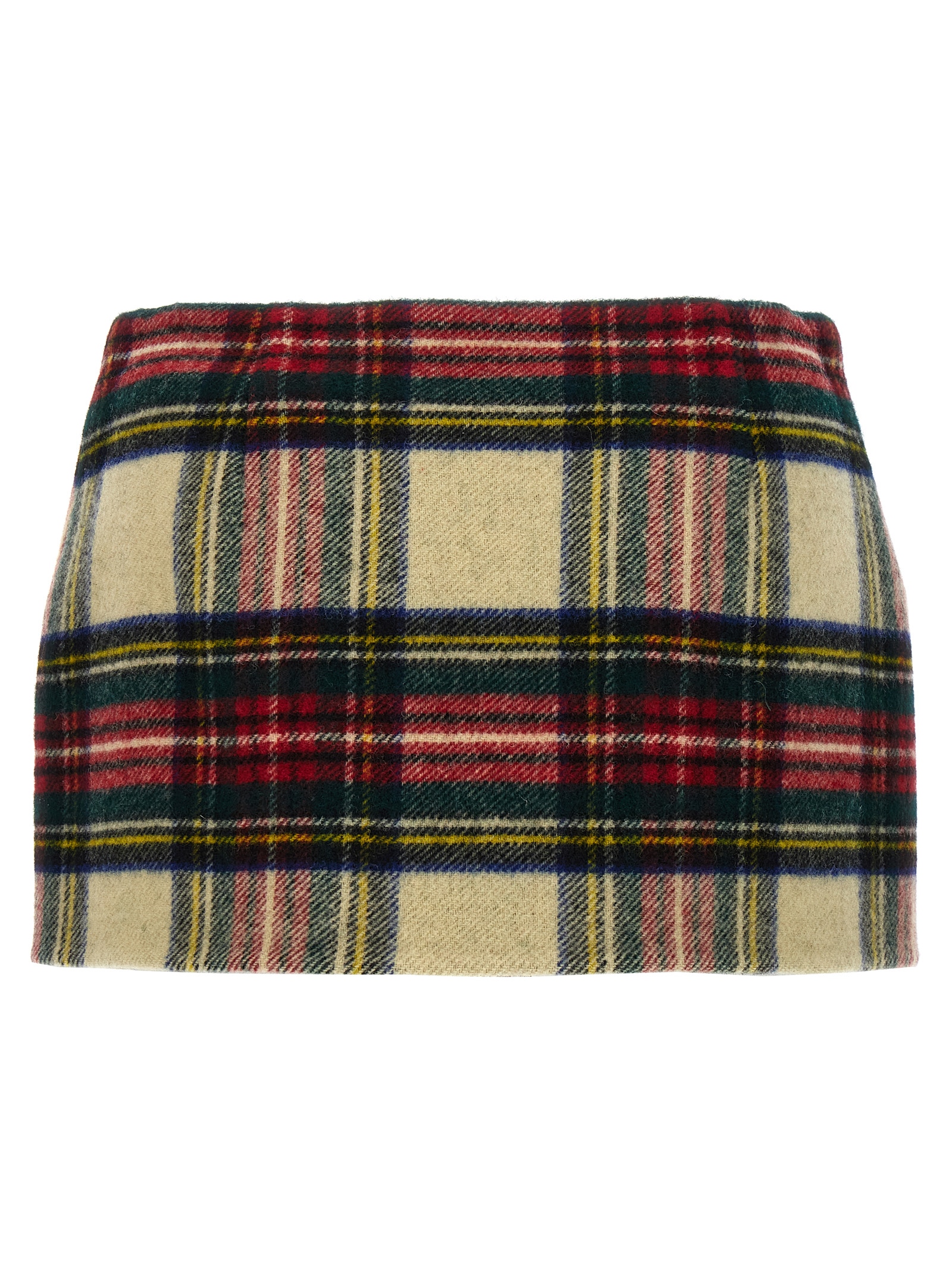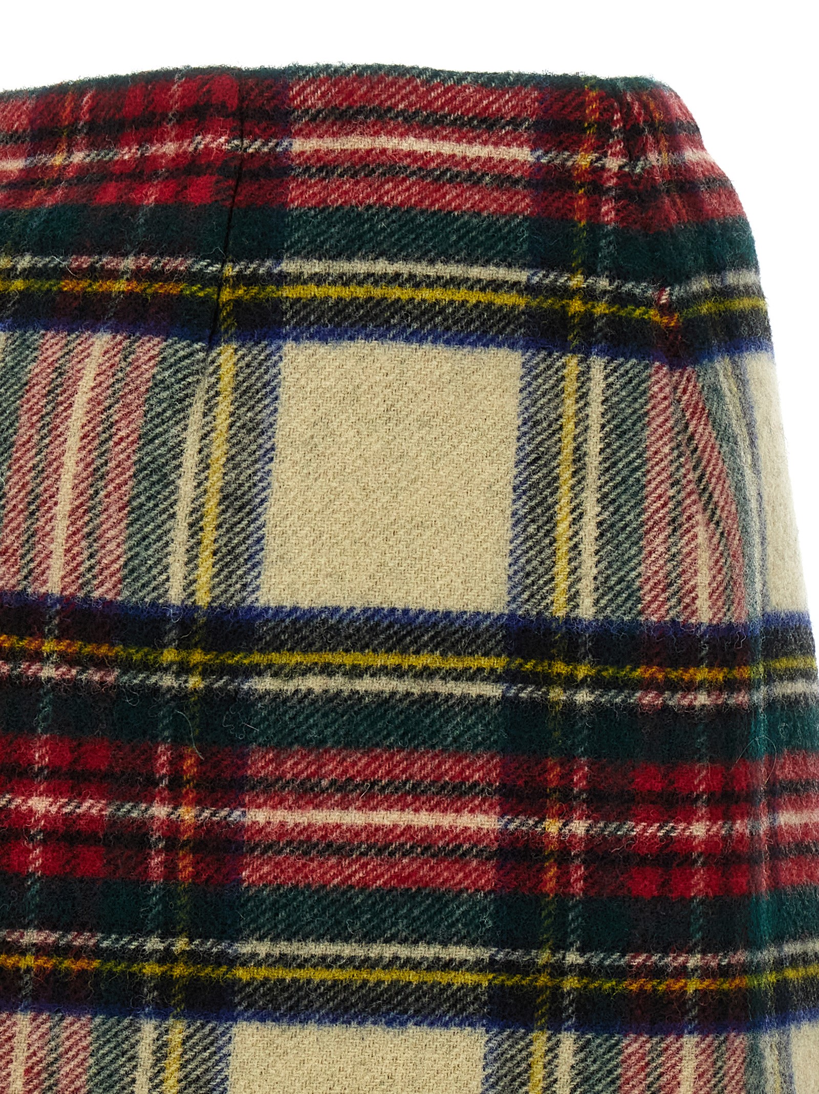 Tartan wool skirt with maxi front brooch appliqué, hook and button wallet closure, leather logo patch.