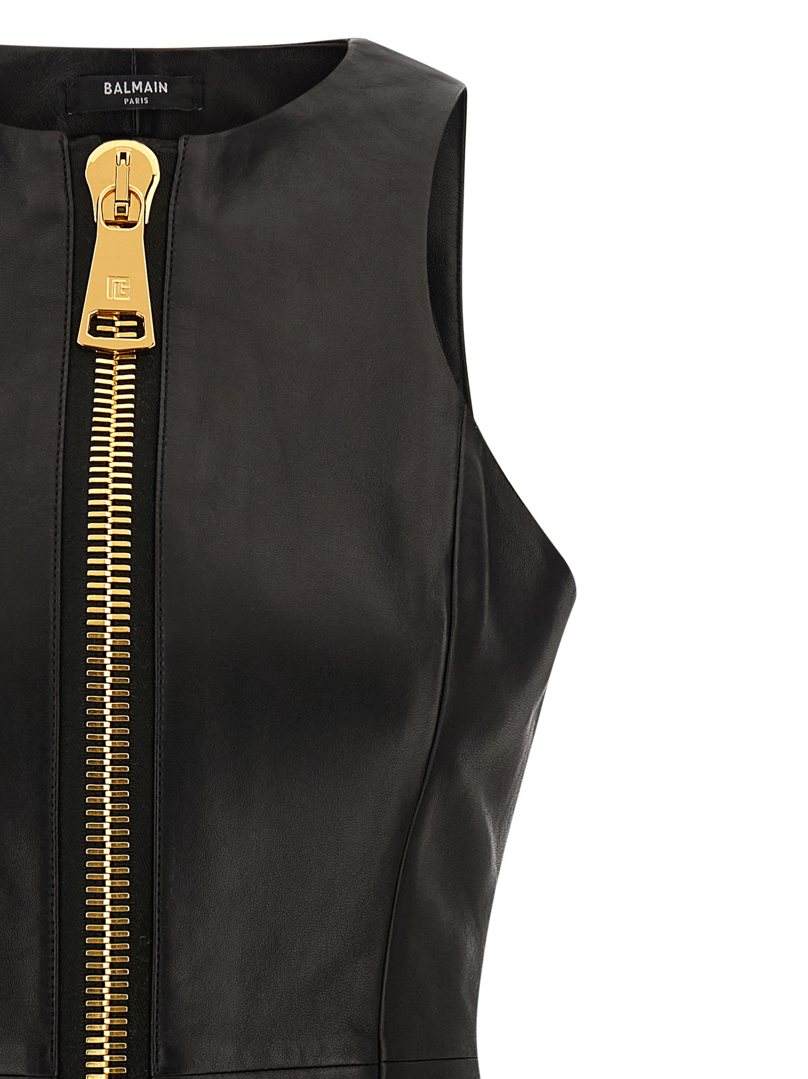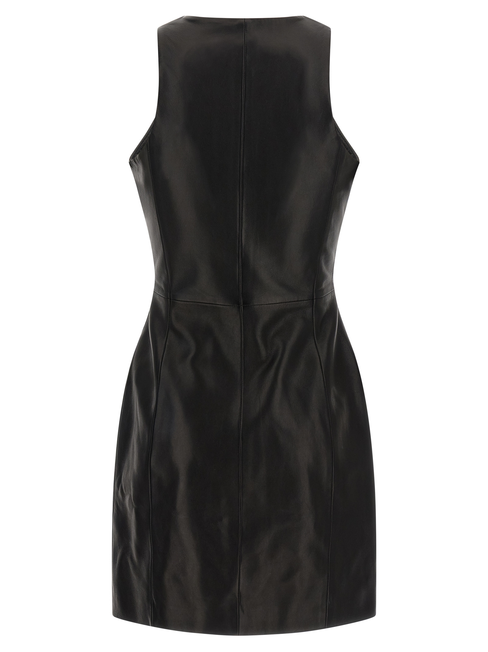 Lamb leather mini dress, panel construction, crew neck, maxi front zip closure, sleeveless, lining.