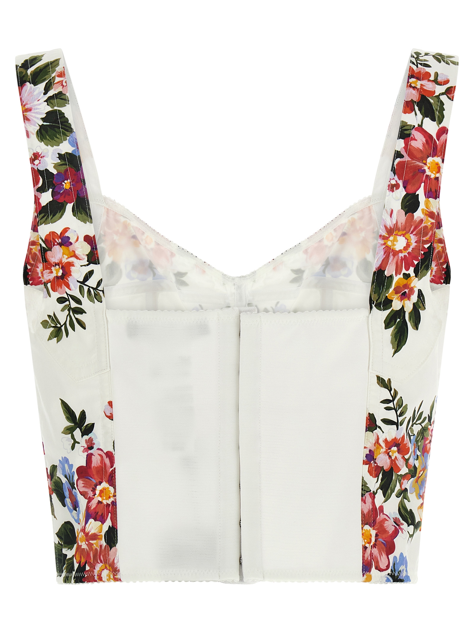 All over ‘Mazzo di fiori’ print cotton top with sleeveless bustier style, shoulder straps, back closure with elastic insert and hooks.