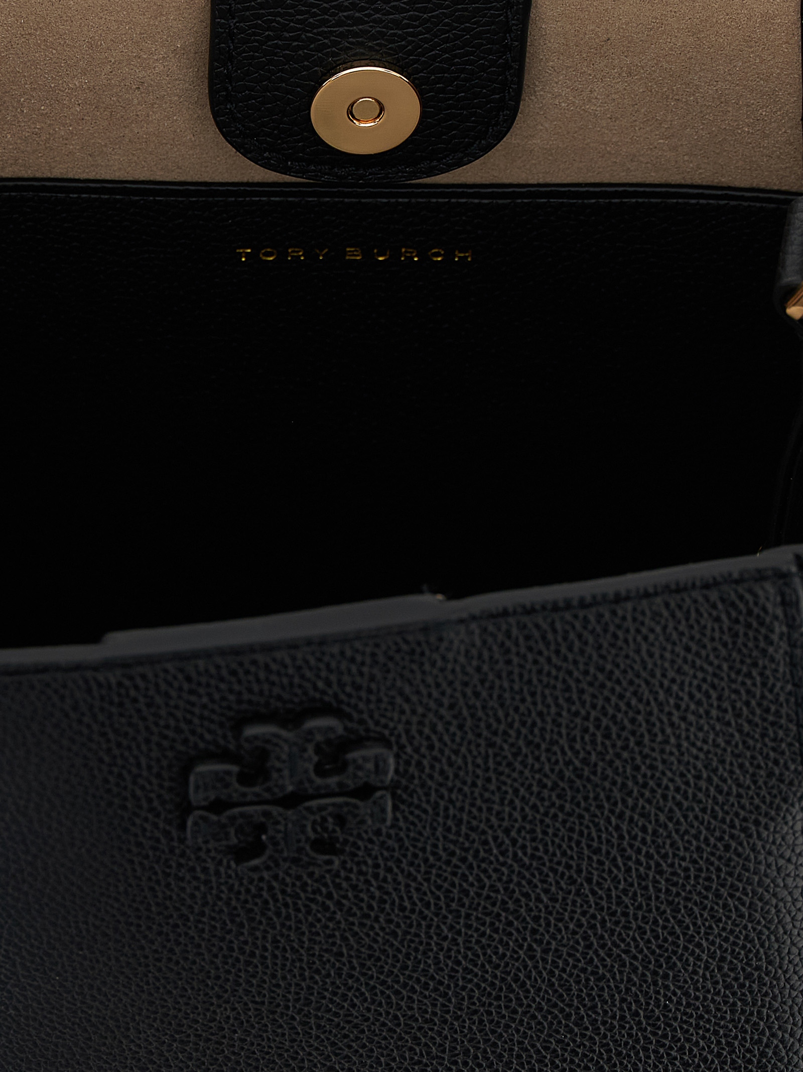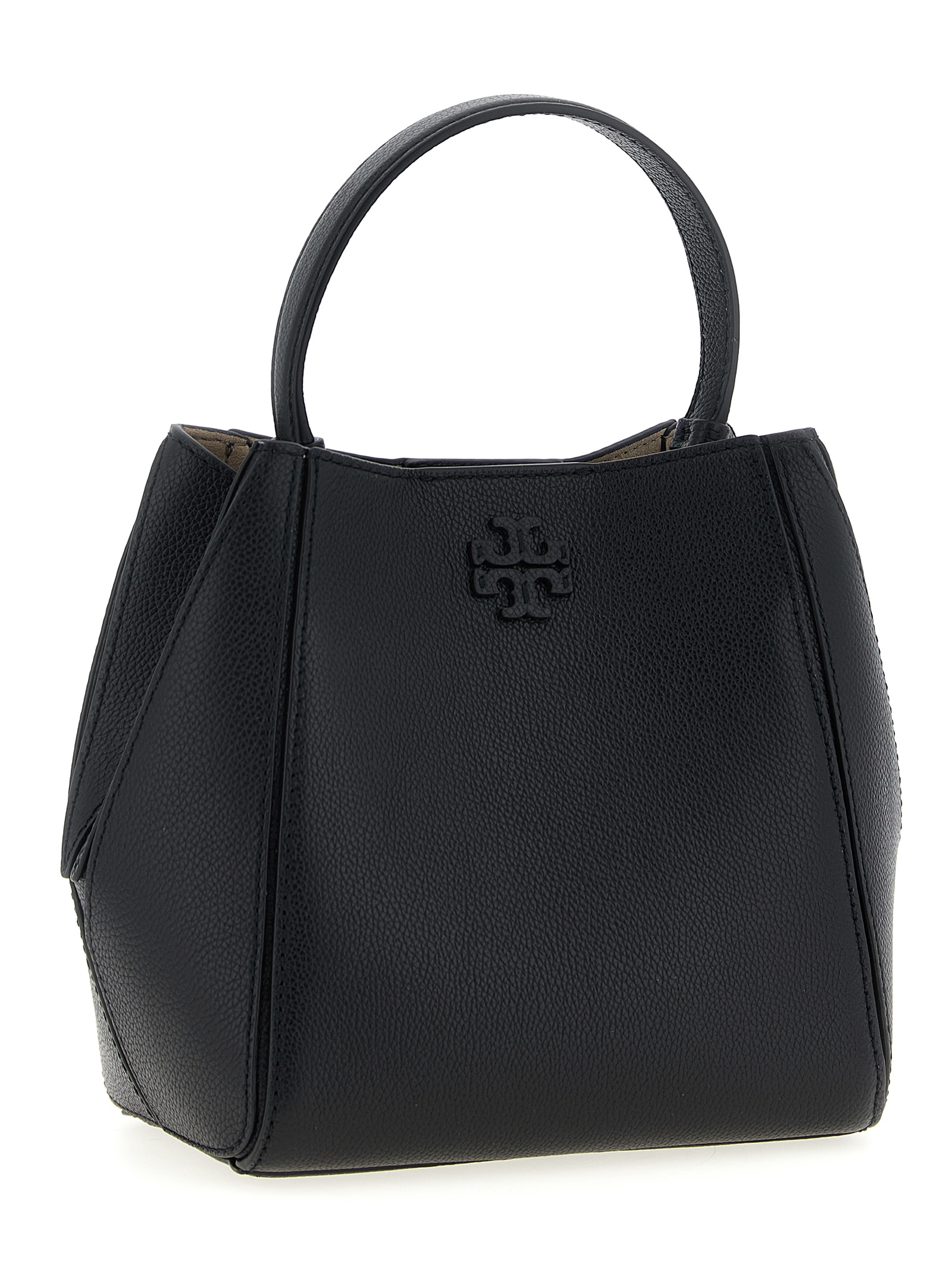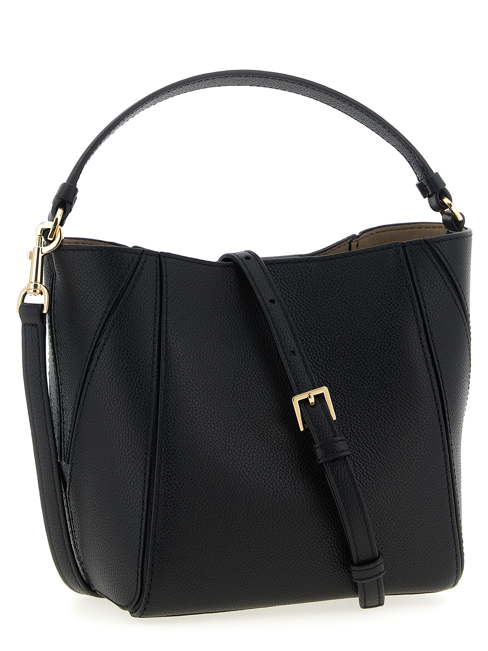 Small ‘McGraw’ bucket bag in grainy leather, tone-on-tone leather logo patch on the front, fixed handle, magnetic closure, adjustable and removable shoulder strap.