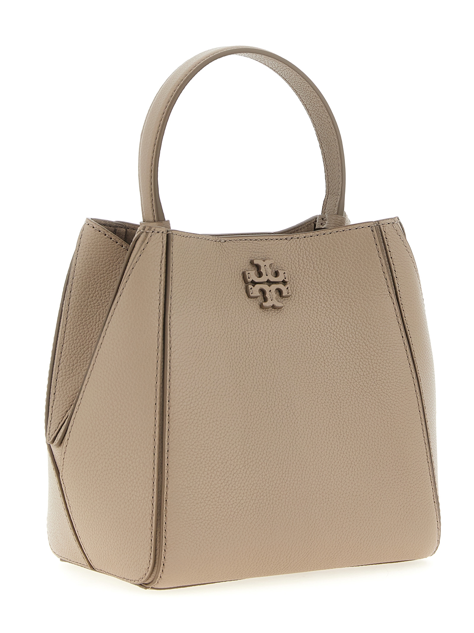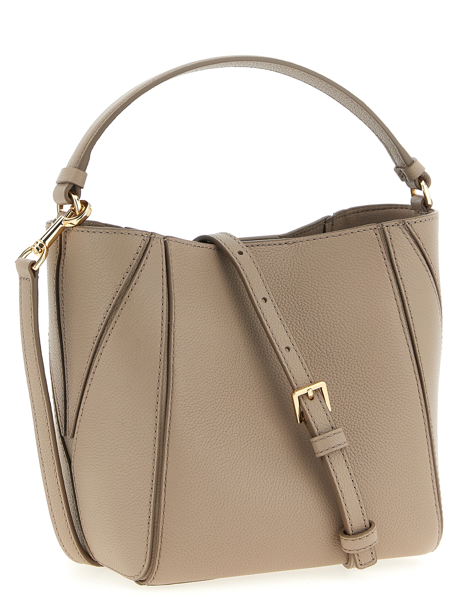 Small ‘McGraw’ bucket bag in grainy leather, tone-on-tone leather logo patch on the front, fixed handle, magnetic closure, adjustable and removable shoulder strap.