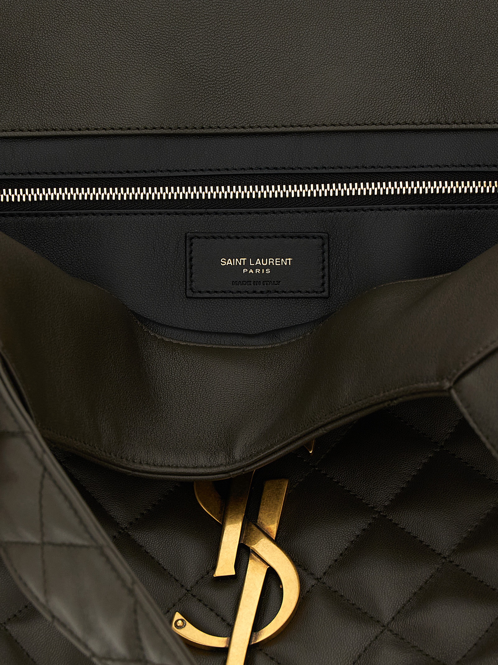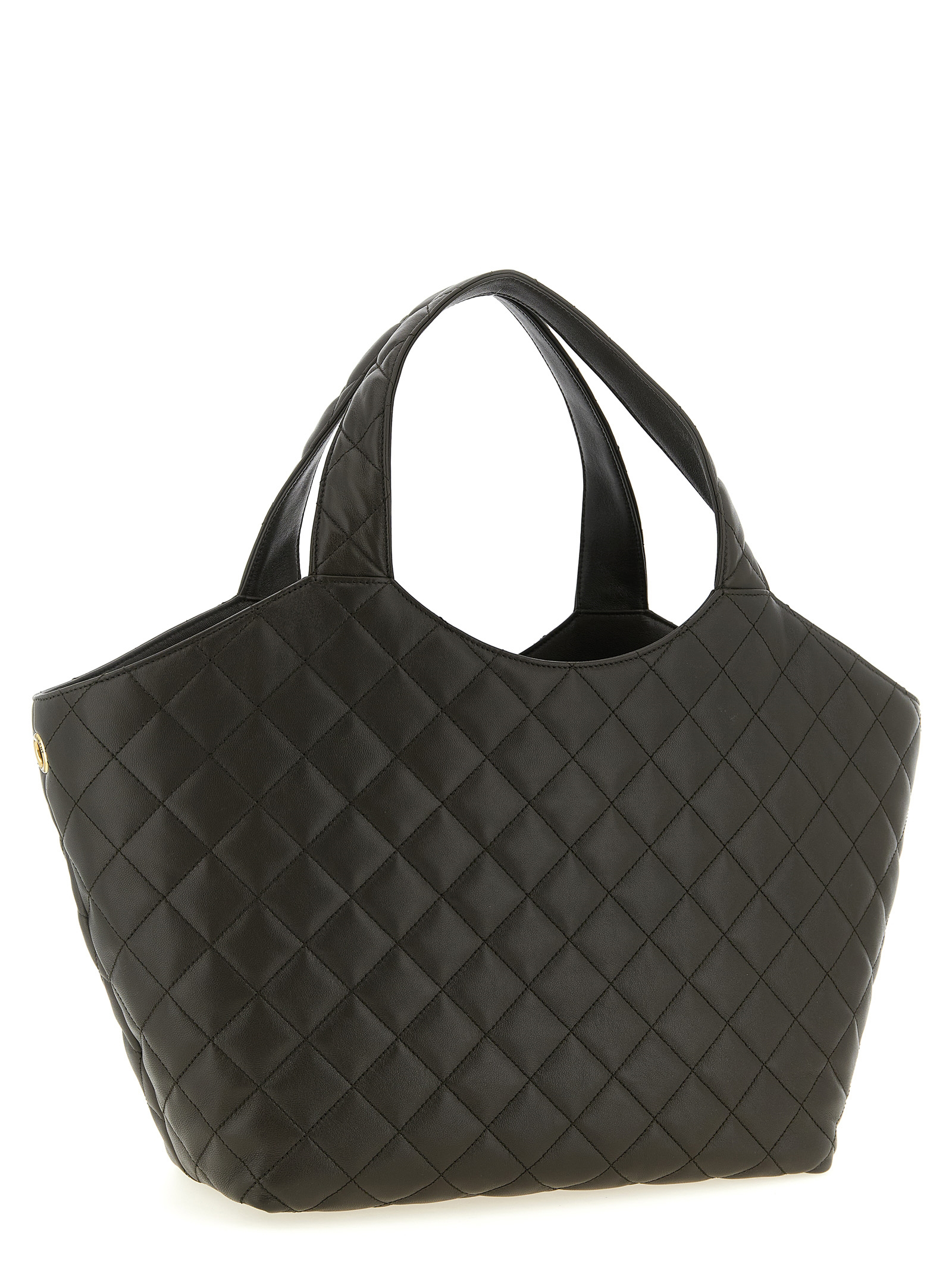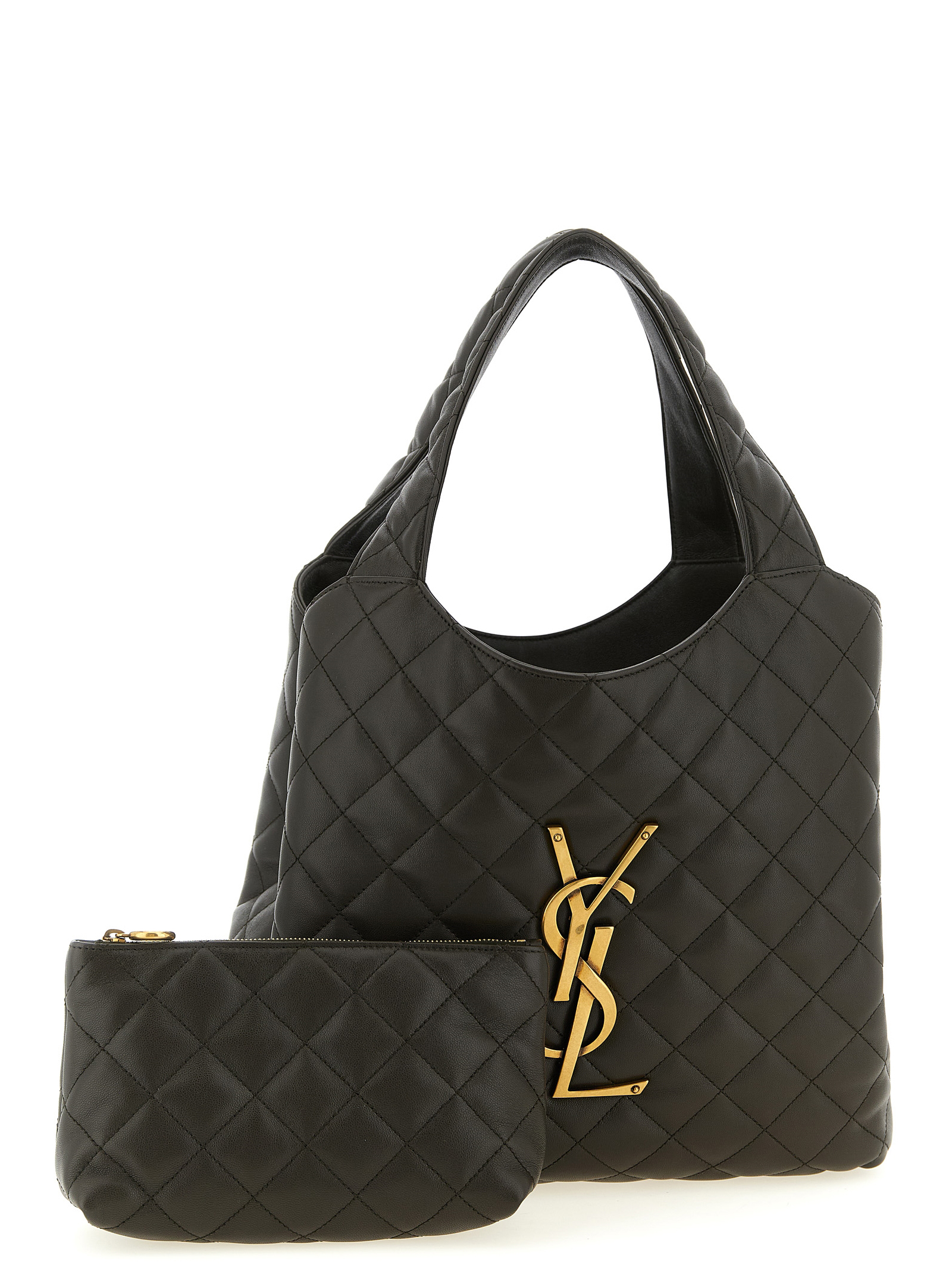 Medium ‘Icare’ shopping bag in lamb nappa leather with quilted check stitching, maxi metal ‘Cassandre’ logo with antiqued effect on the front, double fixed handle, leather lining, and removable clutch bag.