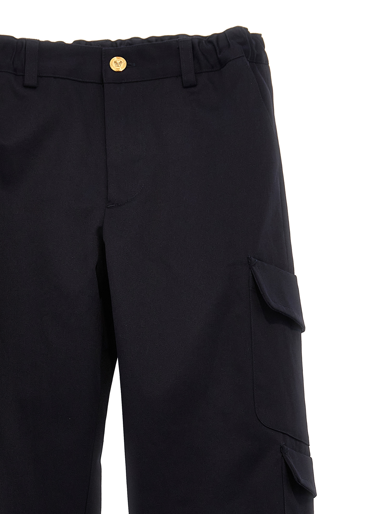 Cotton cargo pants, zip and ‘Medusa’ button closure, elastic waistband, pockets.