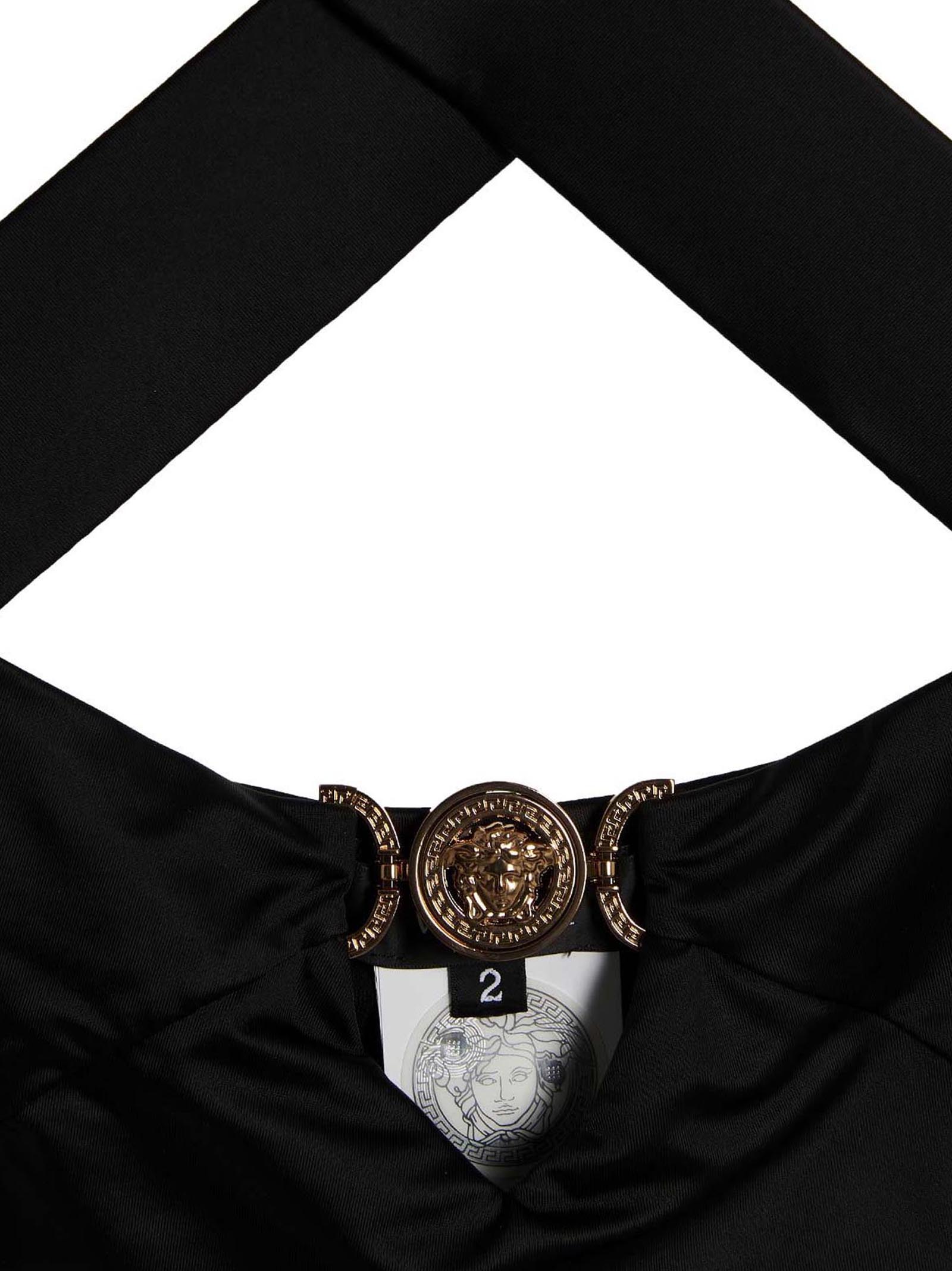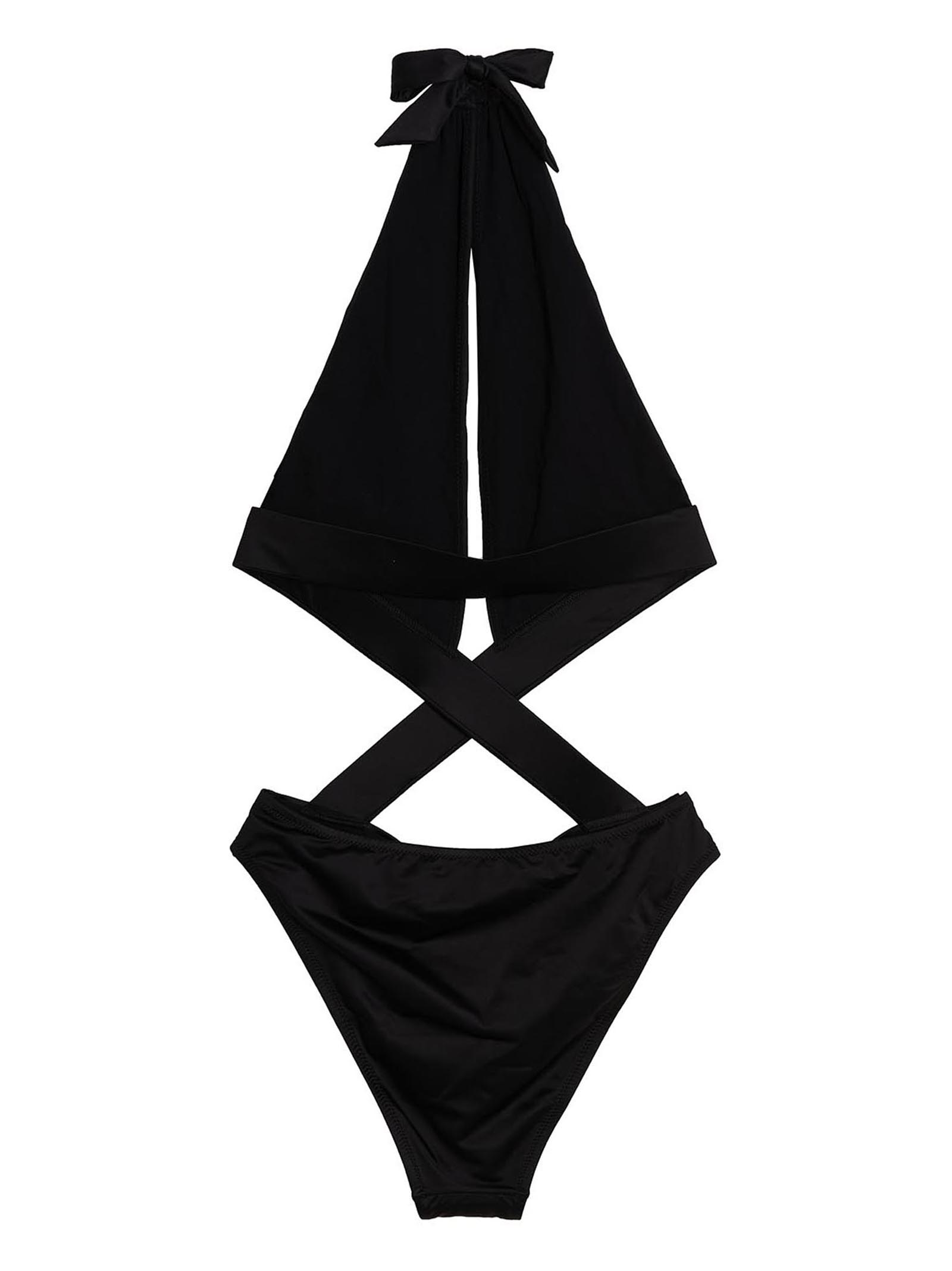Belize fabric one piece swimsuit featuring a front weave, fastening at the neck and a ‘Medusa’ gold metal detail.
