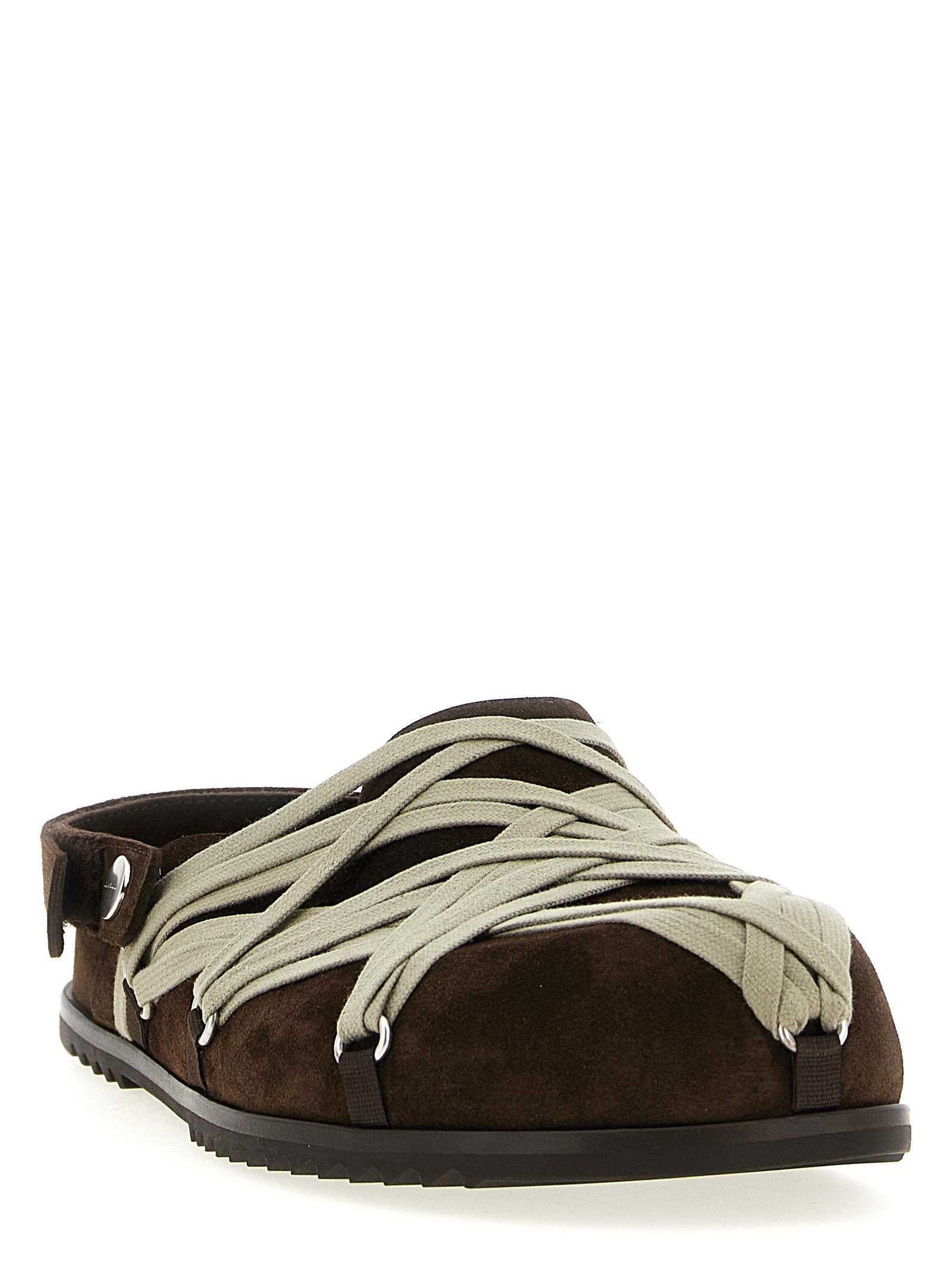 ‘Megalace Mule Granola’ suede mules with front lace detail, adjustable strap with velcro, rubber sole.