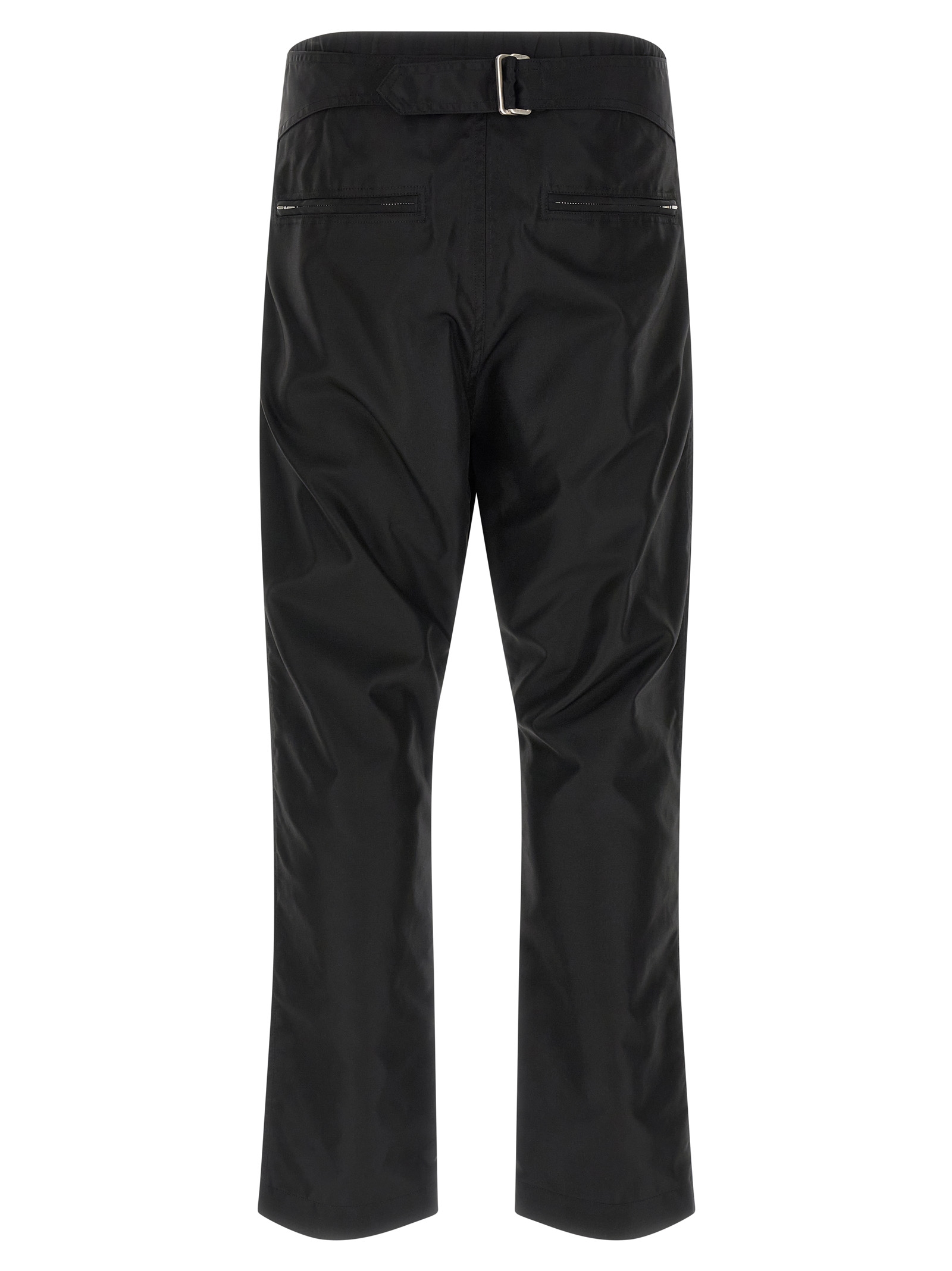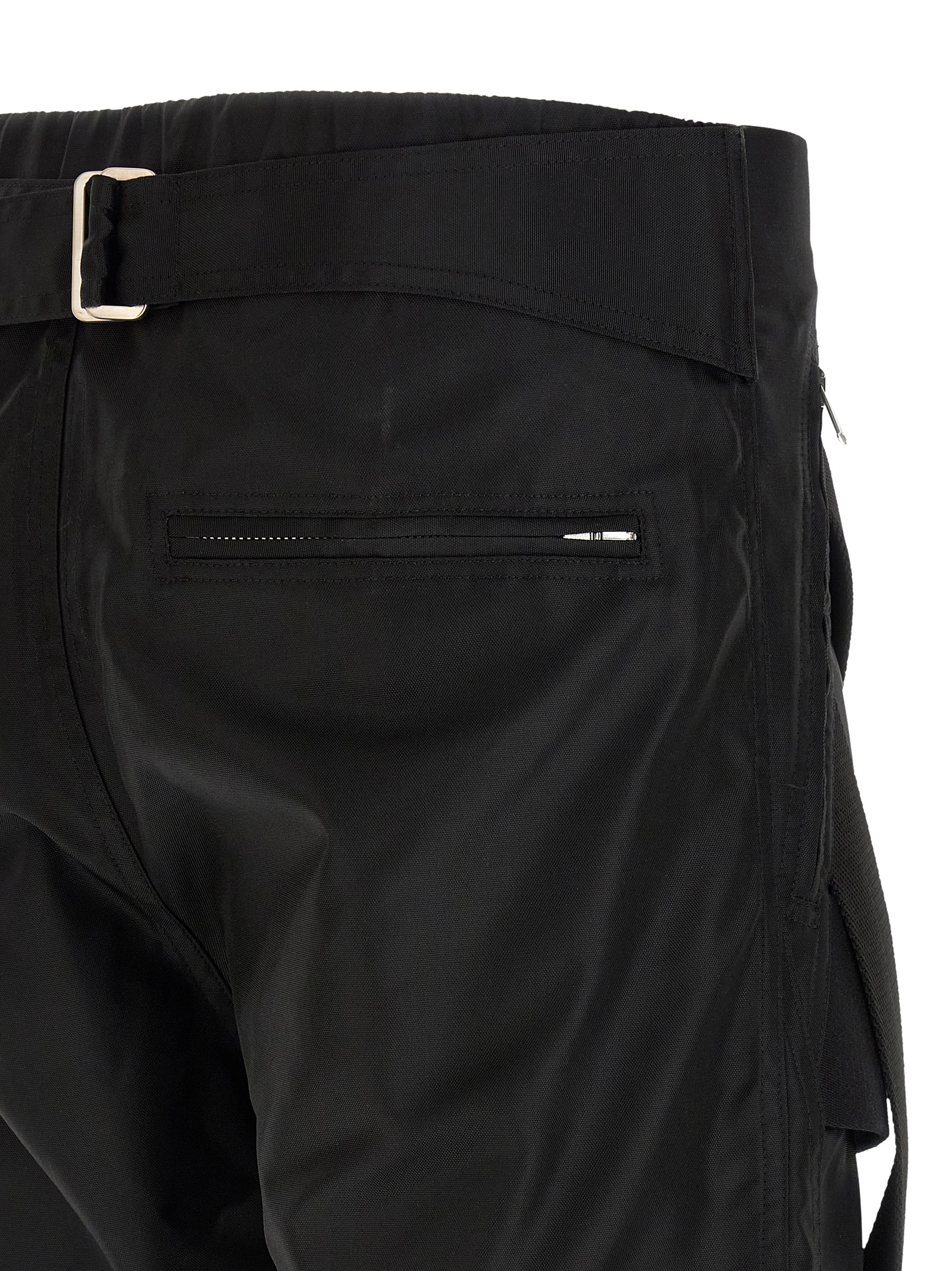 Compact medium-weight nylon canvas ‘Megastrapped Motopants’ pants with crunchy and compact texture, high waist, tapered leg, two straps on each thigh and a wide strap connecting both thighs just below the crotch, front zip and snap button closure, pockets, elastic waistband and adjustable strap at the back, zip and flap with snap buttons on the leg bottom.