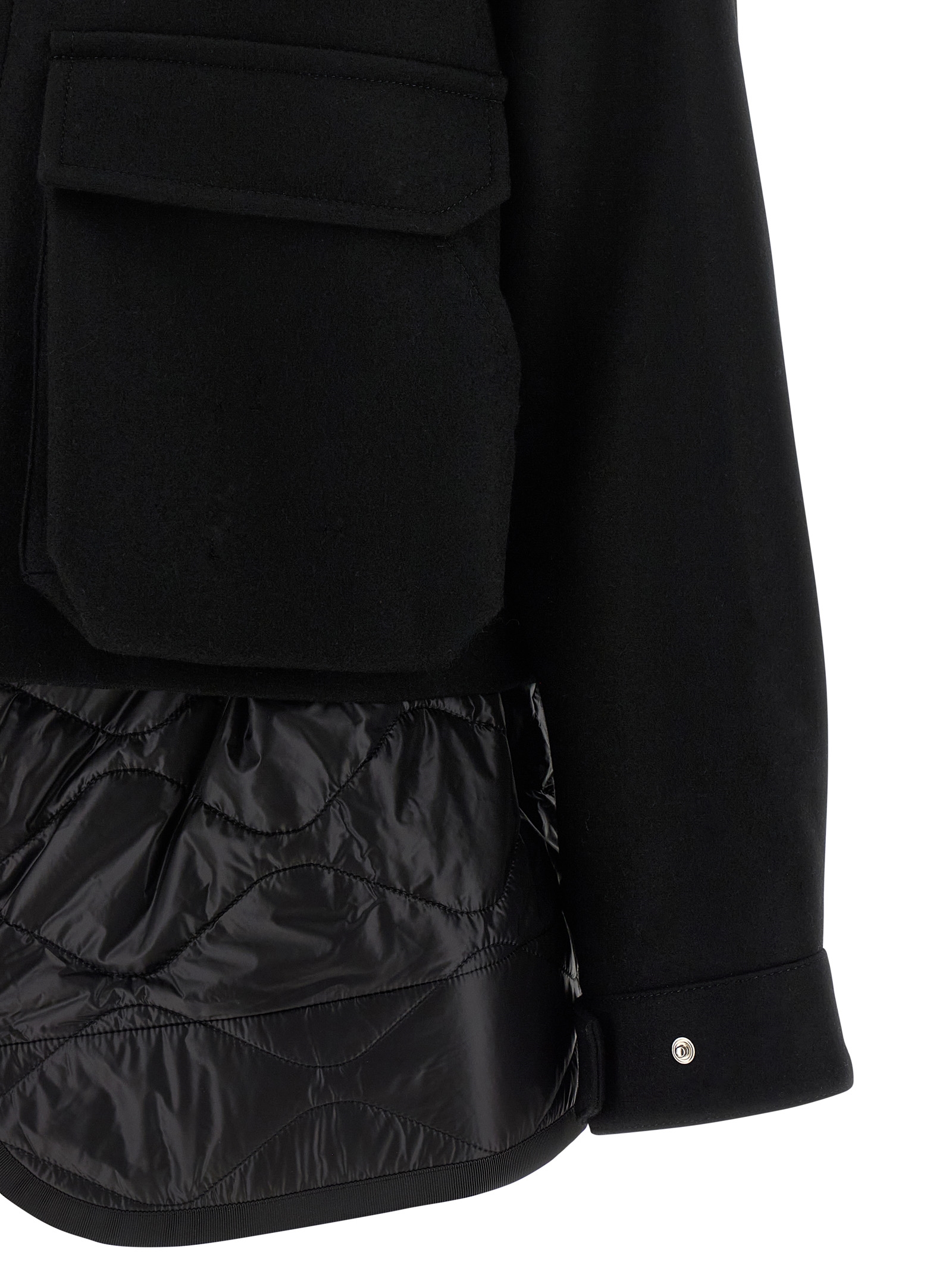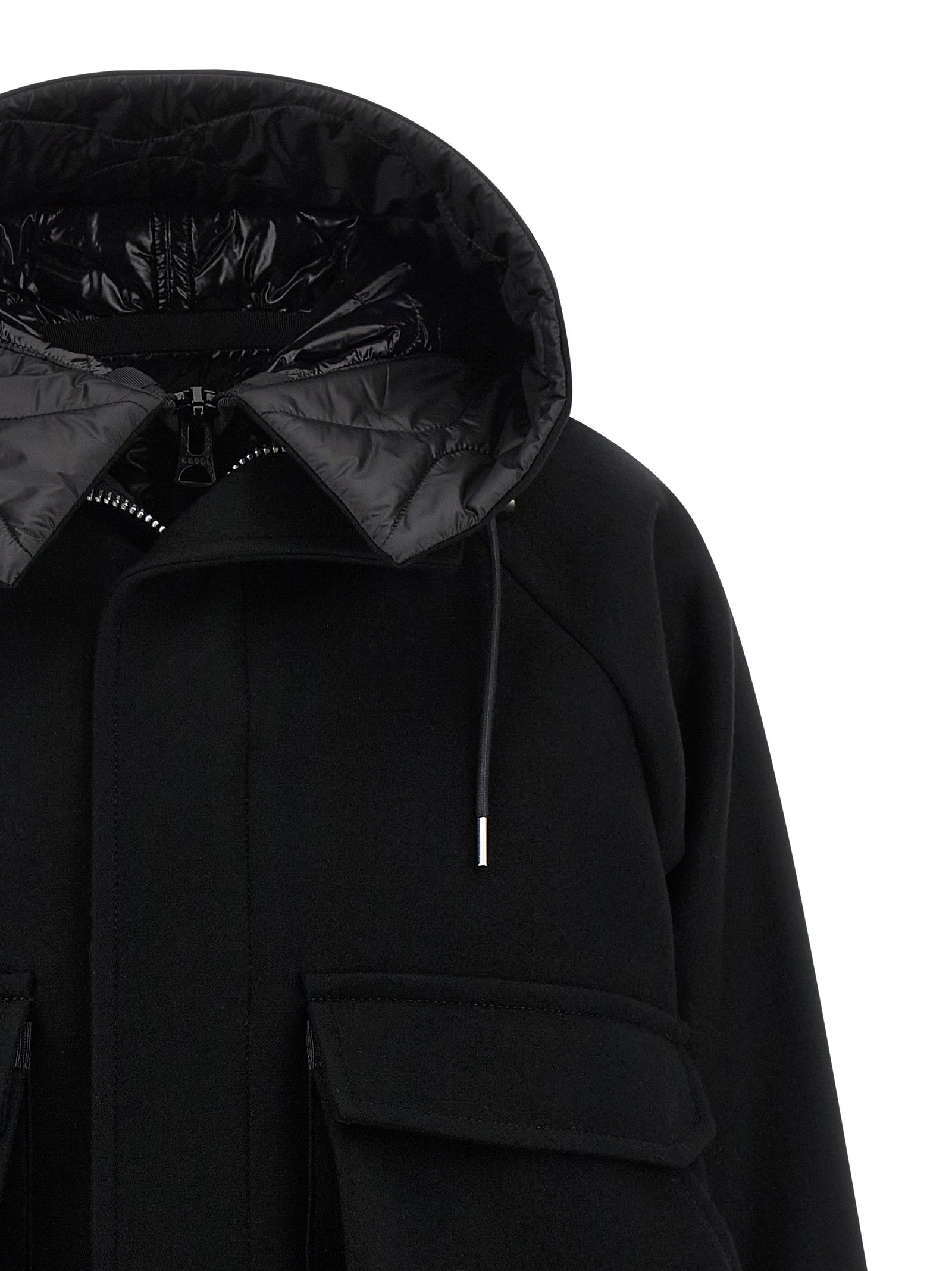‘Melton’ blouson consisting of wool outer part and quilted and slightly padded nylon inside, adjustable hood, front zip closure, pockets, long cuffed sleeves, asymmetrical hem.