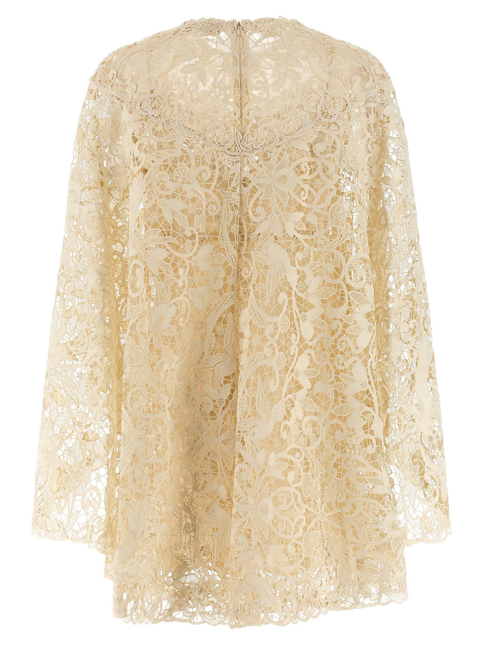 ‘Memento Bird Lace Mini’ lace dress with round neckline, sleeveless with overlapping cape, side and back zip closure, removable petticoat with thin straps.