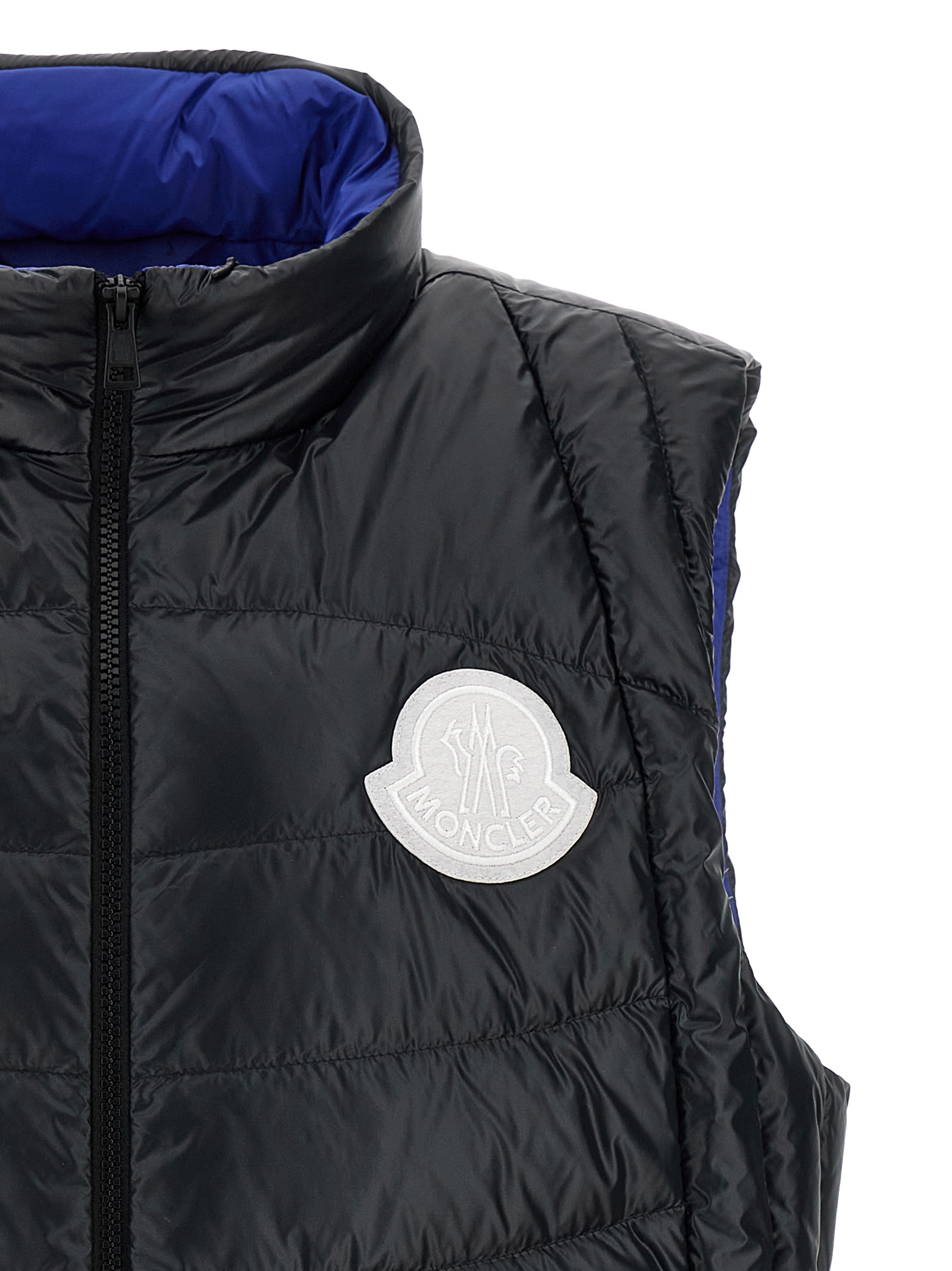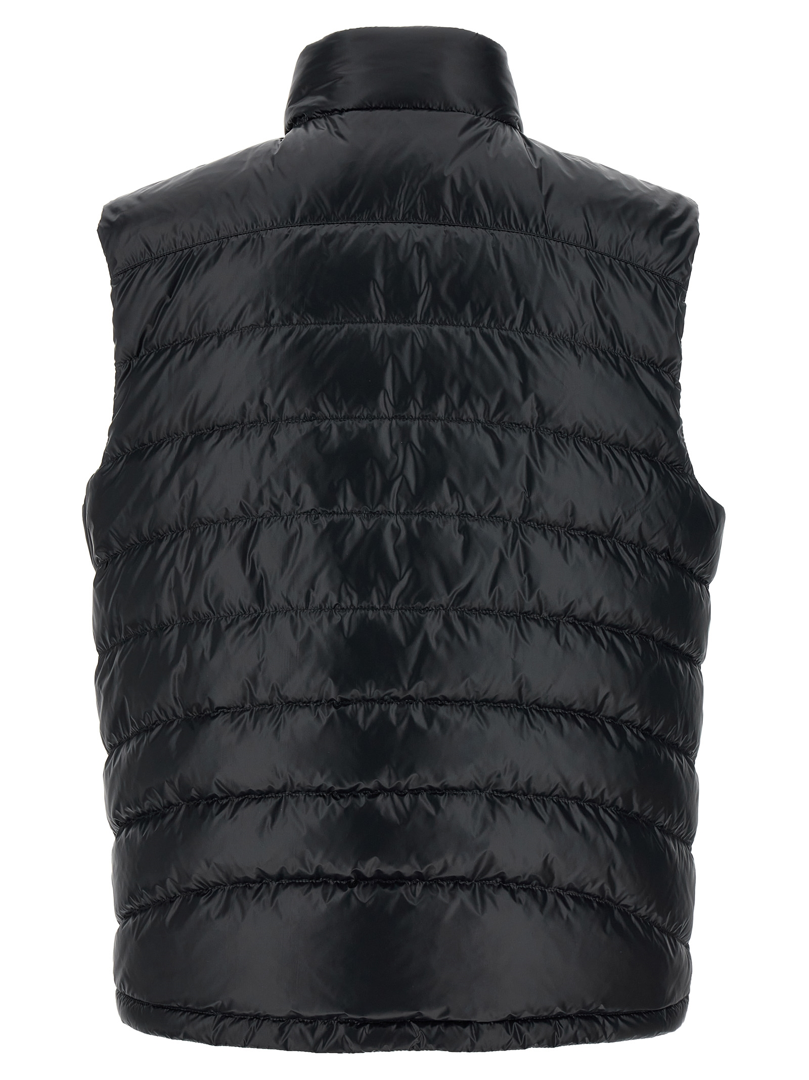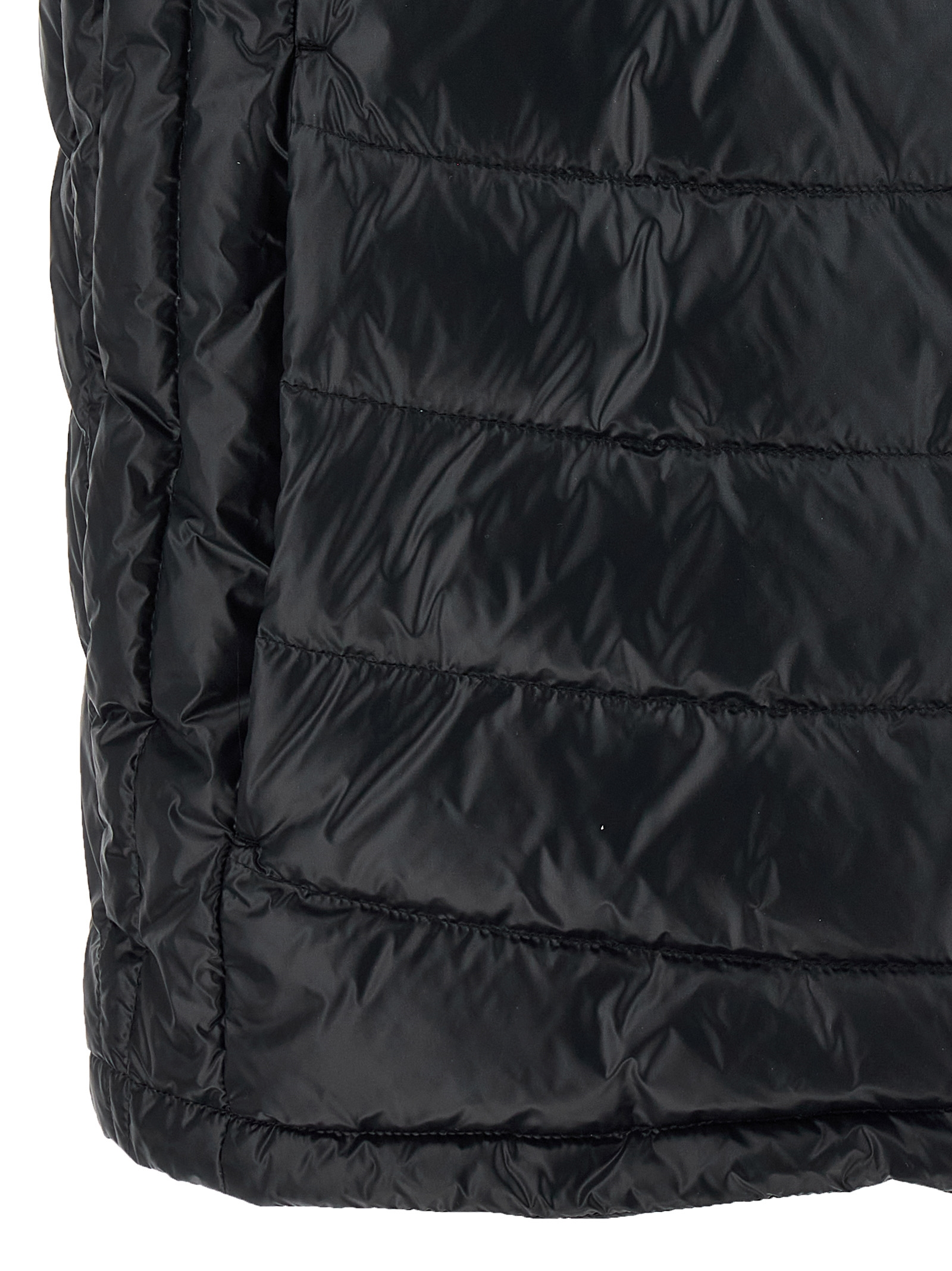 ‘Menelao’ super laqué nylon vest slightly padded with feather, contrast maxi felt logo patch on the front, high neck with removable hood, zip closure, pockets, drawstring on the hem.