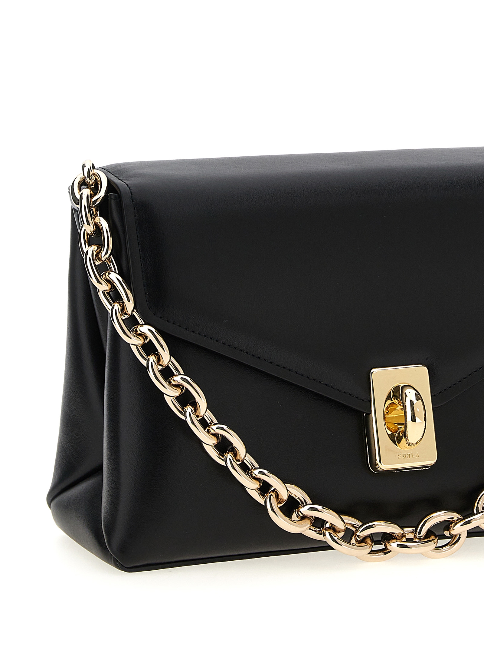 ‘Meridiana’ leather shoulder bag, removable chain handle, flap closure with interlocking metal logo plate, adjustable and removable shoulder strap.