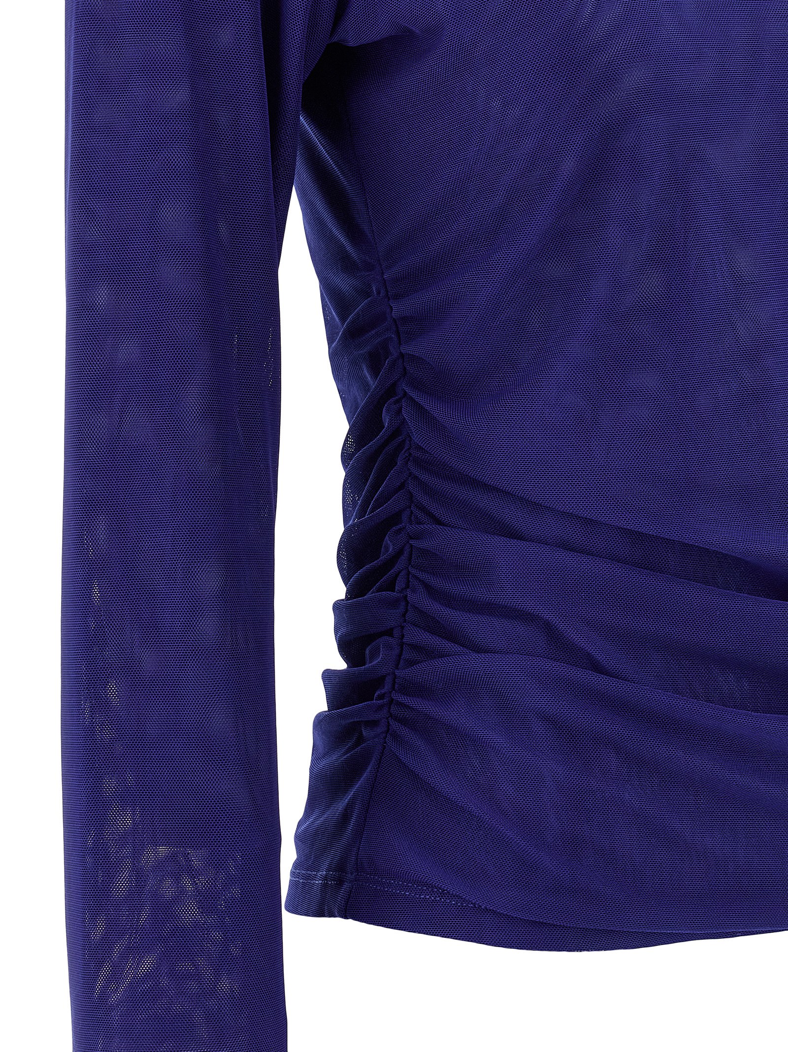 ‘Mesh Rouched’ double layer semi-transparent mesh sweater, high neck, side curls, long sleeves.