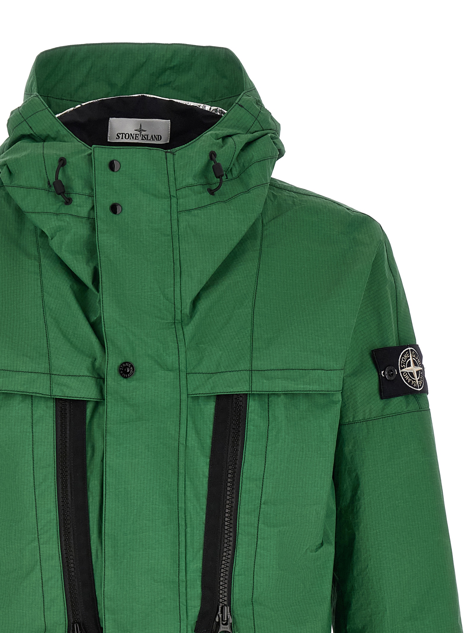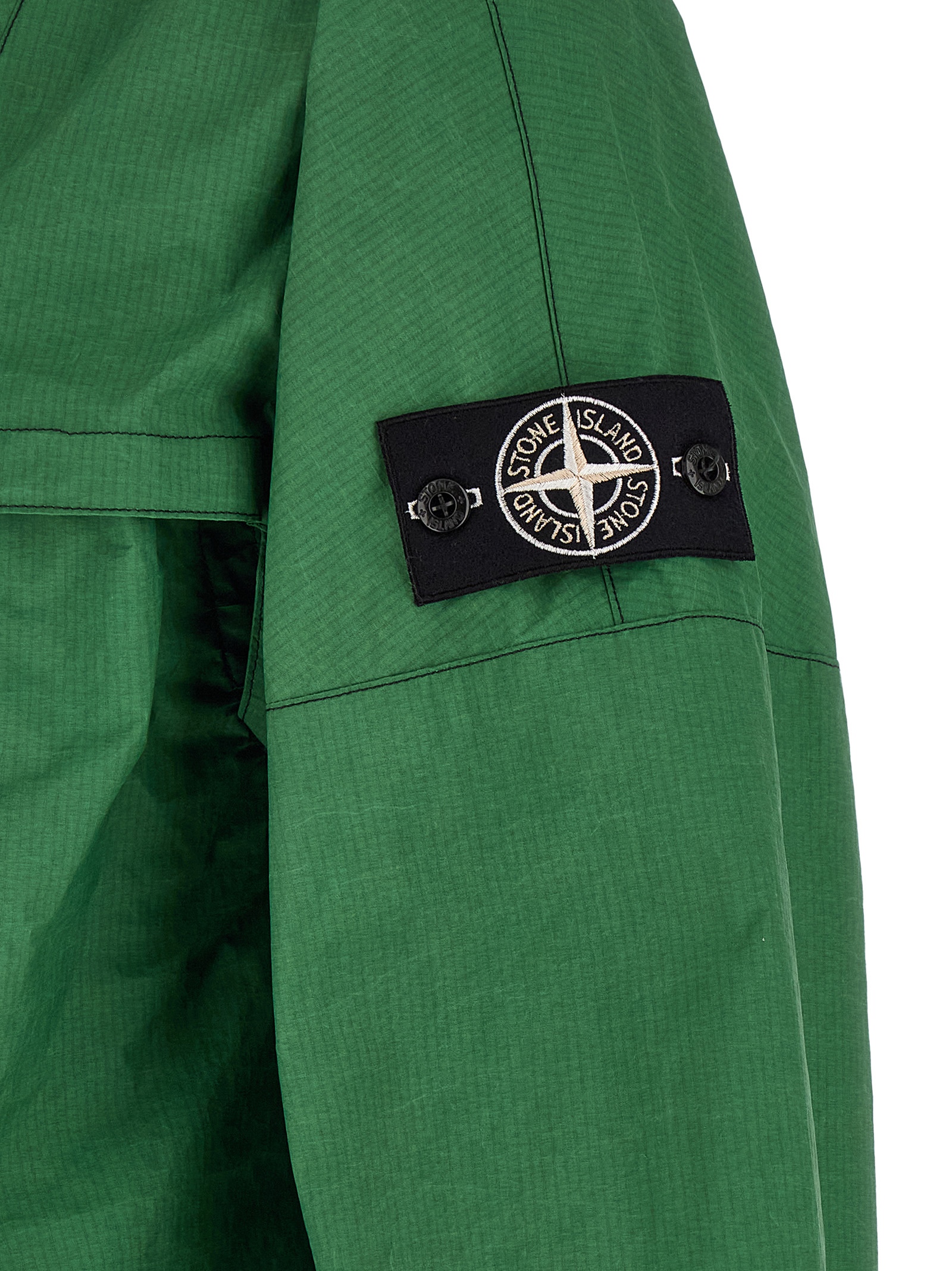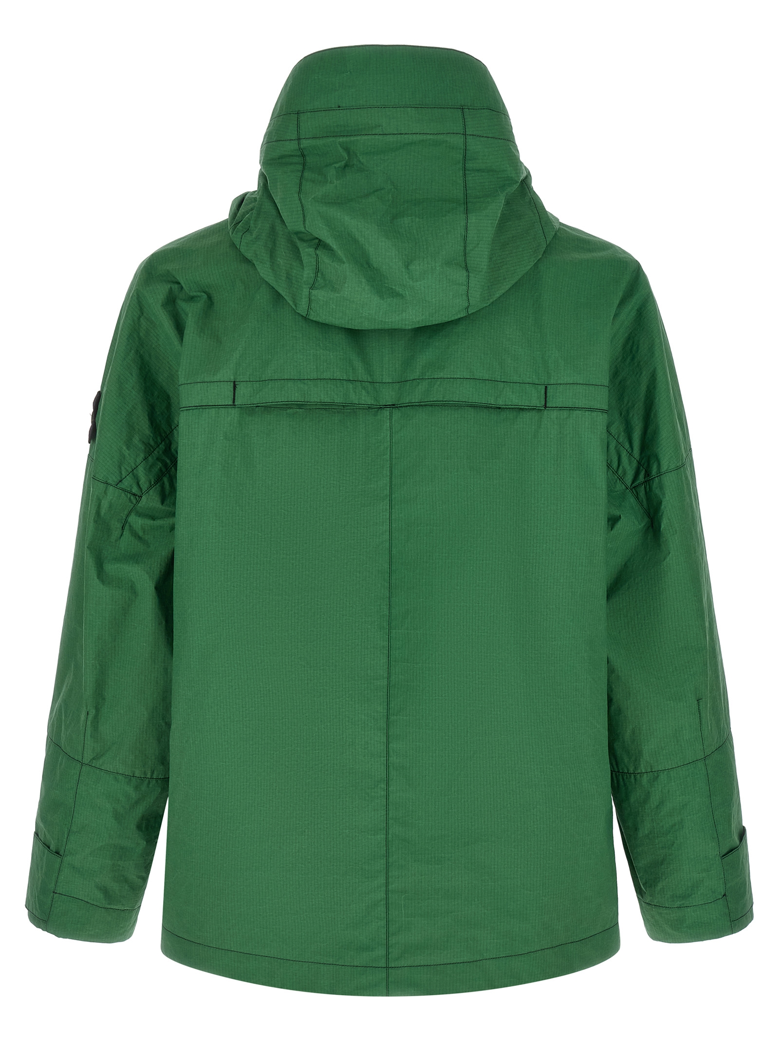 Metal Lamina Ripstop’ water-repellent polyester micro ripstop jacket laminated inside with an aluminum film that gives thermal insulation and a slightly three-dimensional and material appearance, adjustable hood, high neck, zip closure and front snap buttons, pockets, long sleeves with adjustable cuffs and logo badge appliqué, armpit open armpit, ventilation flap mesh lining on the back.