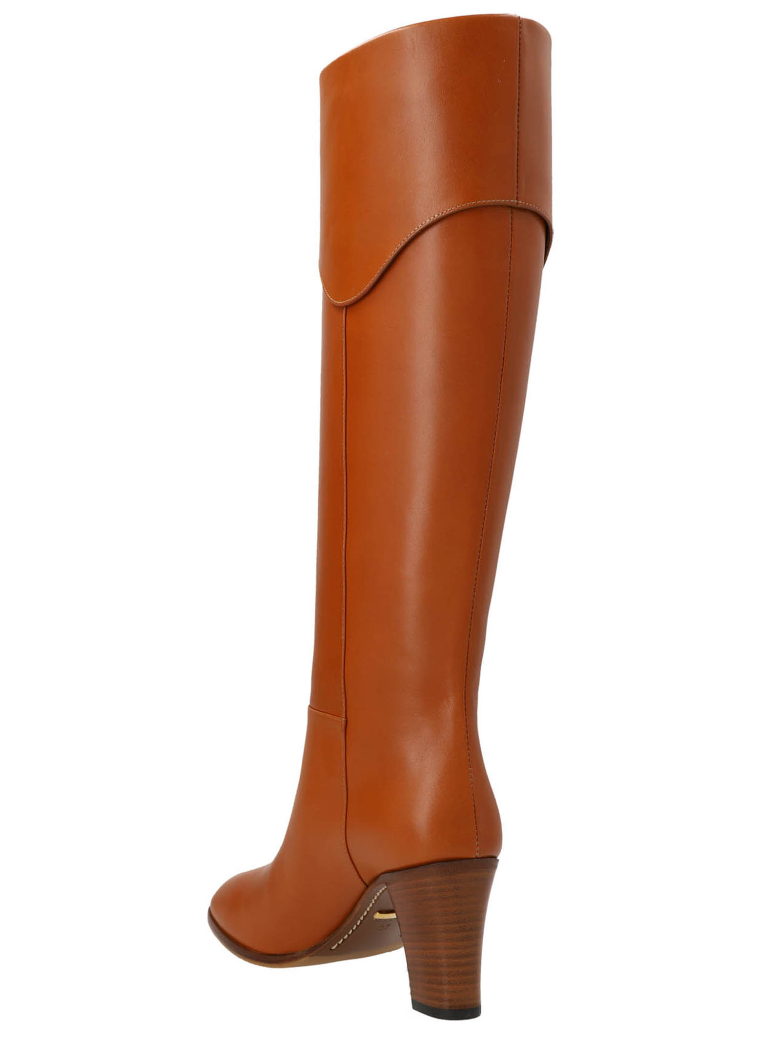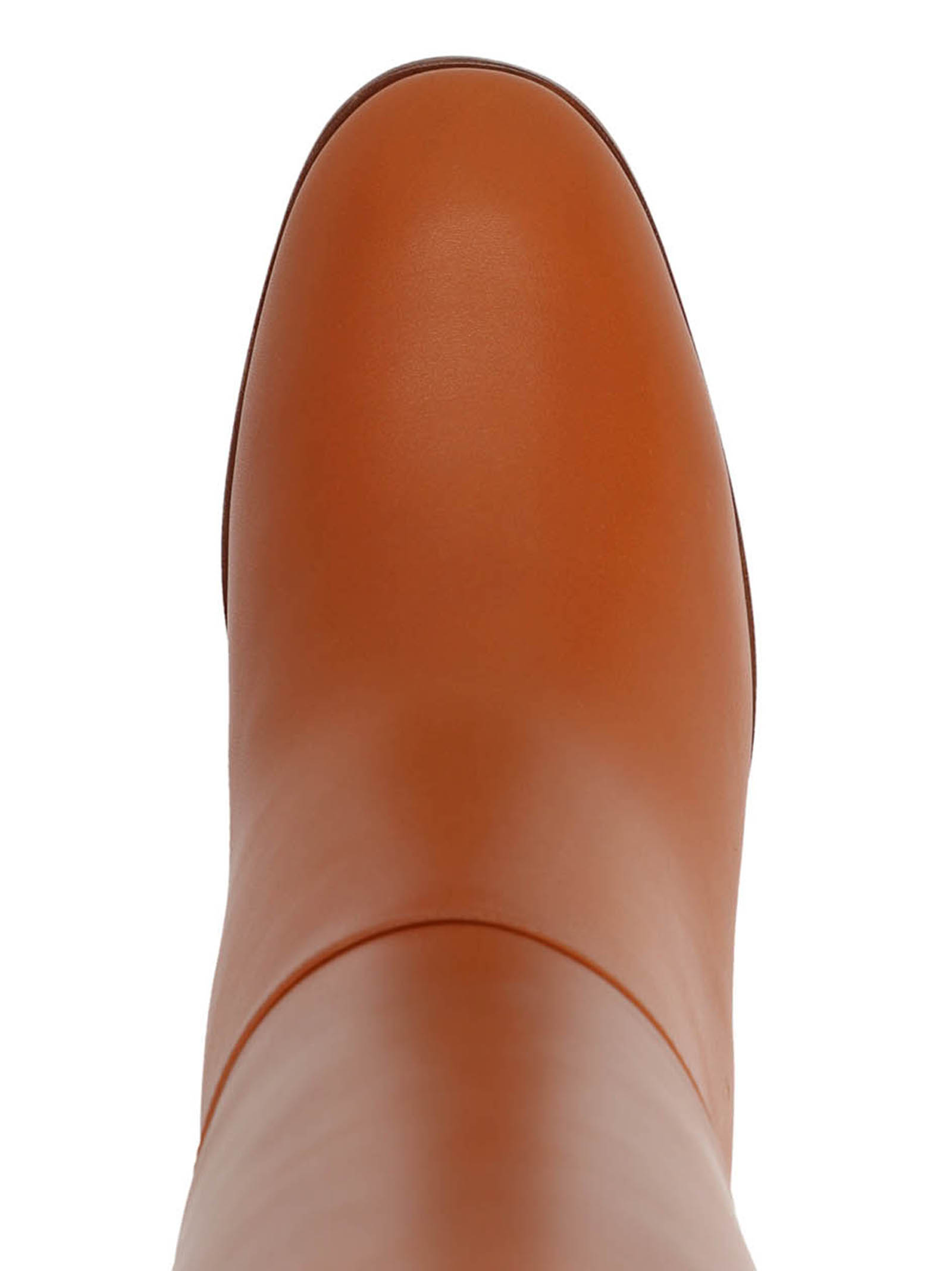 Leather boots with gold color metal detail, ‘half horsebit’ stirrup, smveled toe, leather sole and a midi heel.