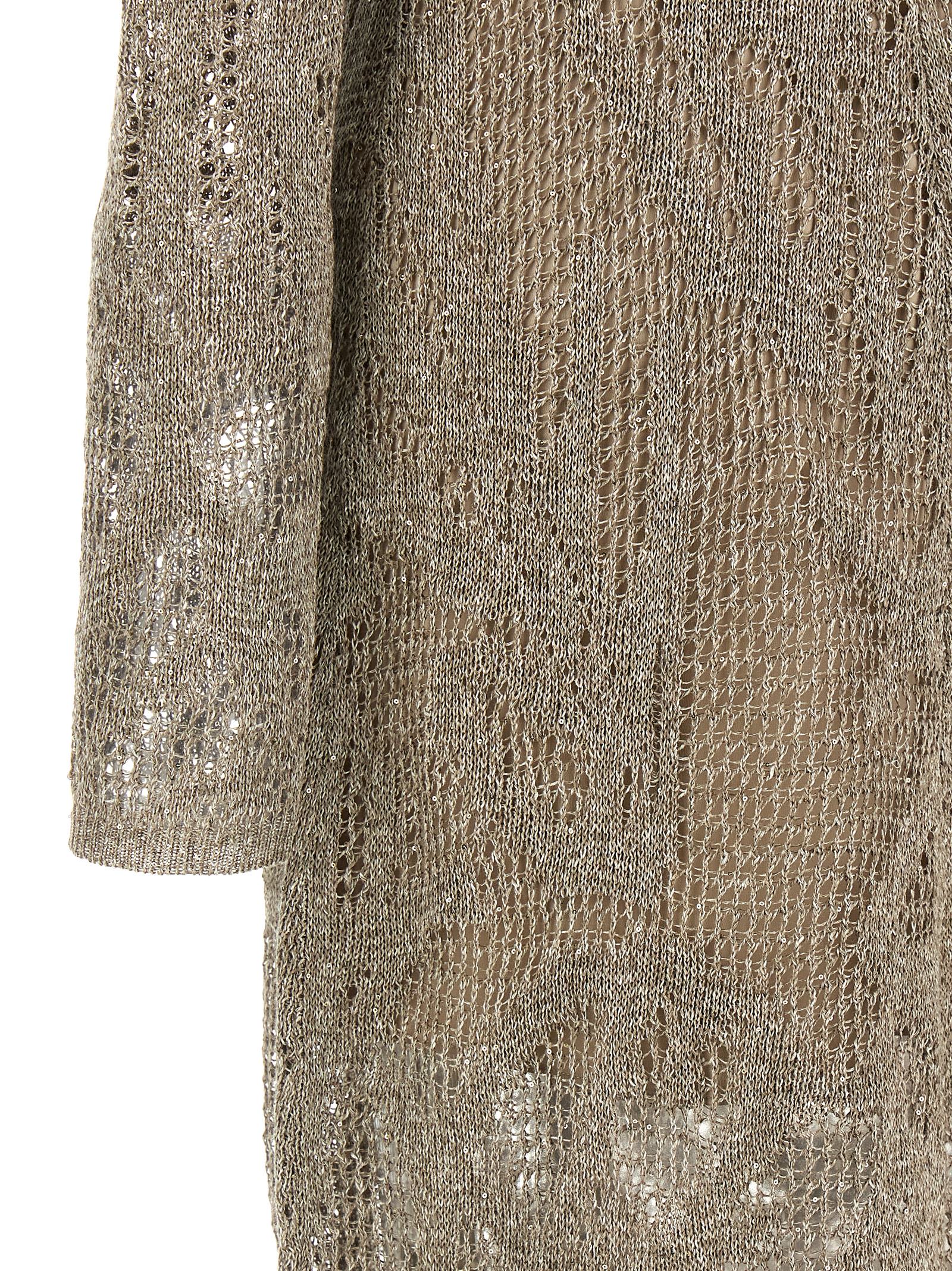 Knitted perforated linen long dress with all-over micro sequin appliqué, V-neck, long sleeves, and removable petticoat.