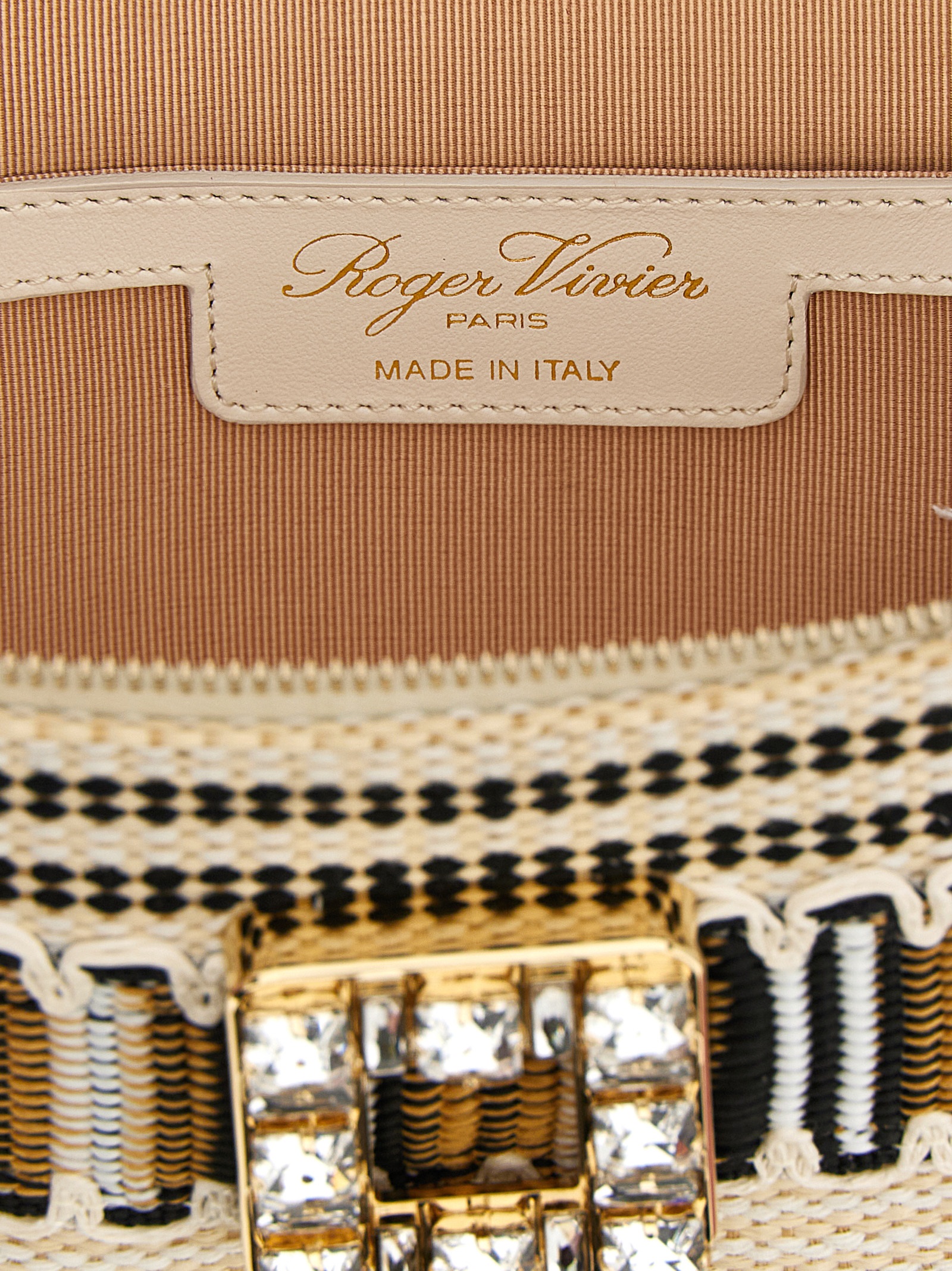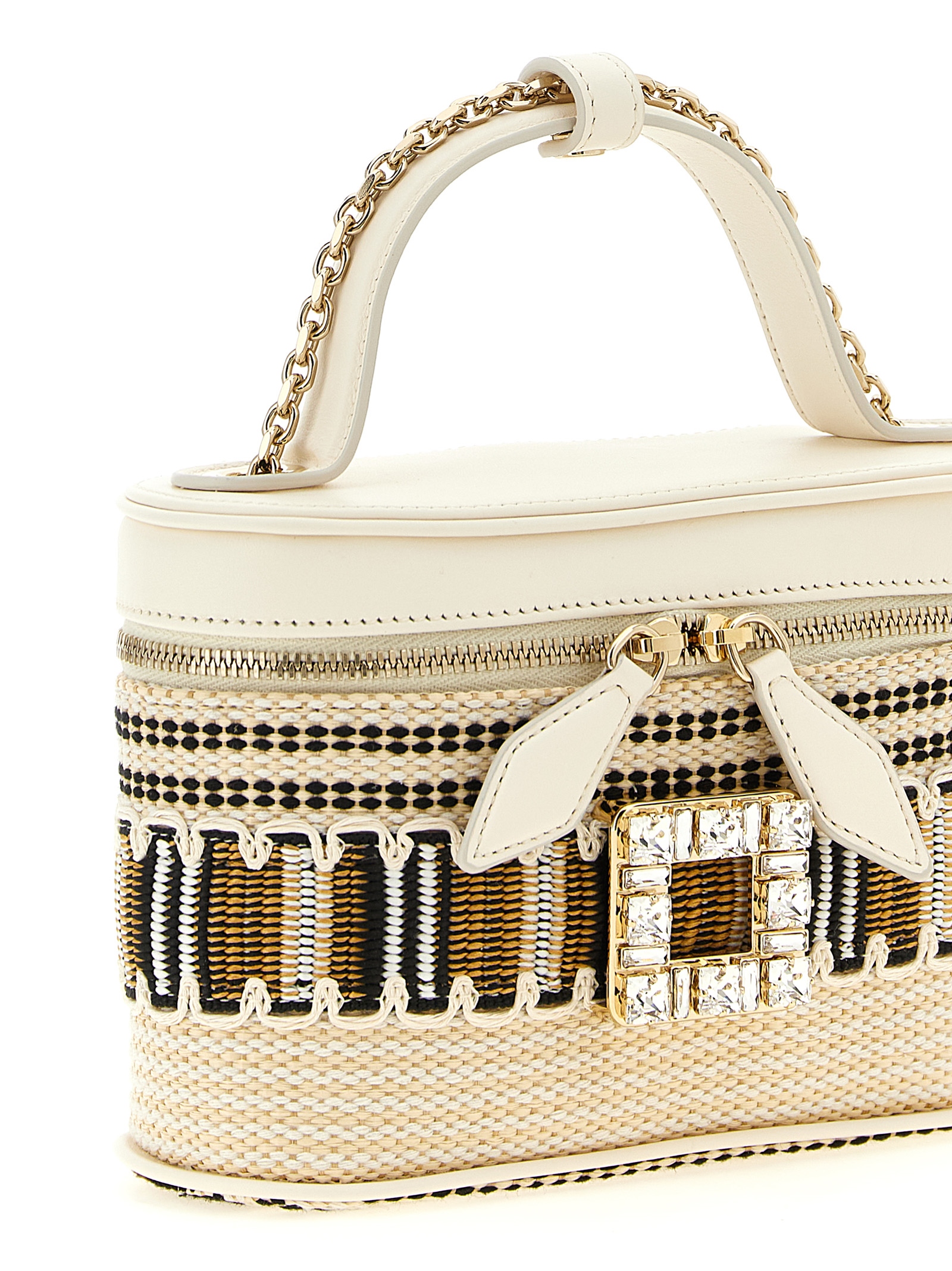 Micro ‘Vanity Très Vivier’ handbag in woven raffia with geometric patterns and smooth leather details, metal ‘Très Vivier’ buckle with front square crystals, fixed handle, zip closure, sliding chain shoulder strap, fabric lining.