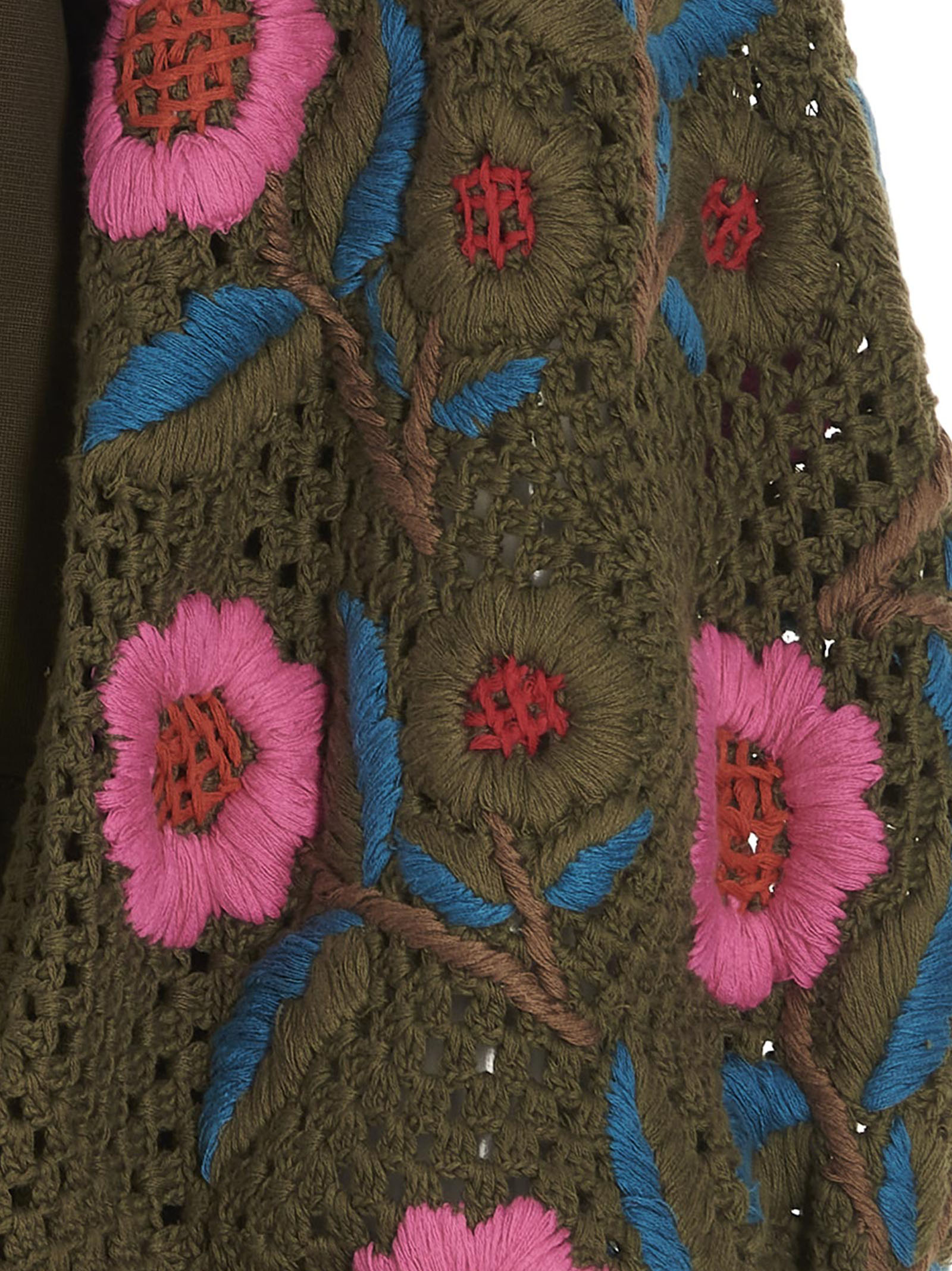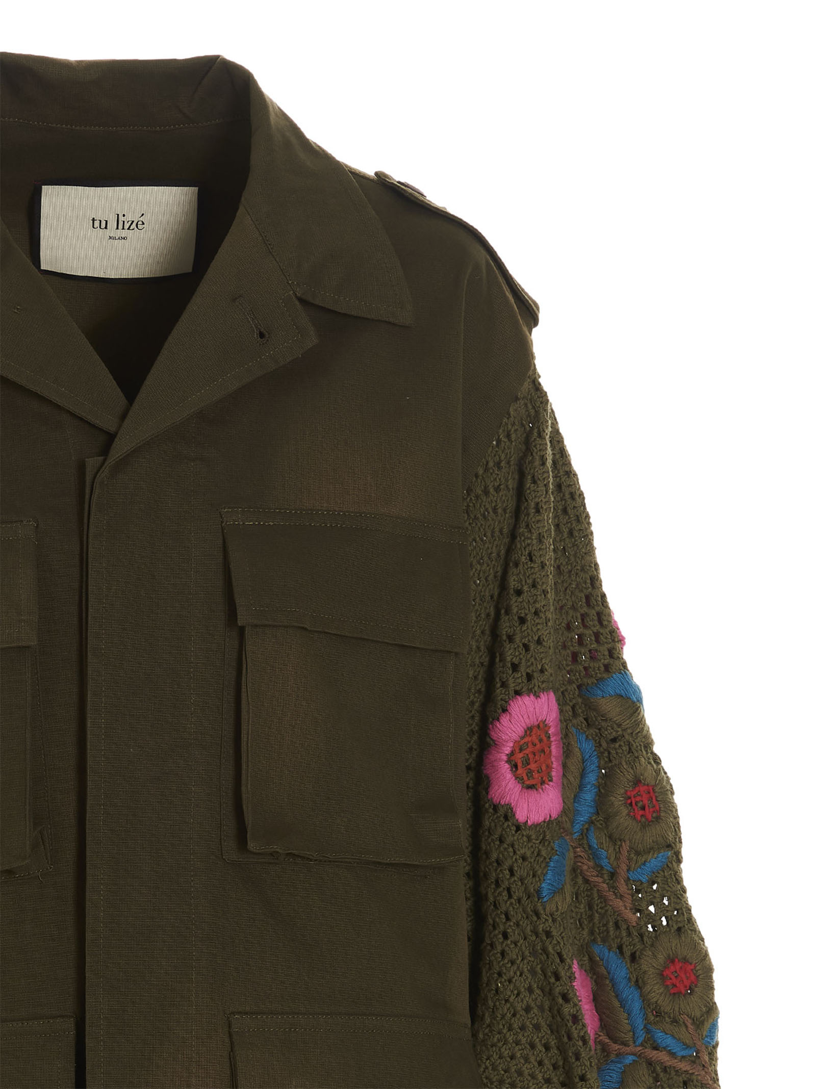 Military Sahara’ cotton jacket with button and pocket closure, crochet knitted sleeves detail with floral intarsia, elastic cuffs and flounces. This product is made using handmade techniques, possible variations between one item and another and small imperfections are to be considered unique characteristics of the product.