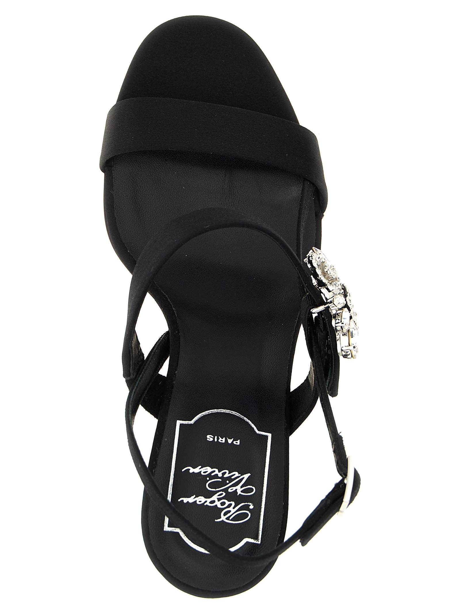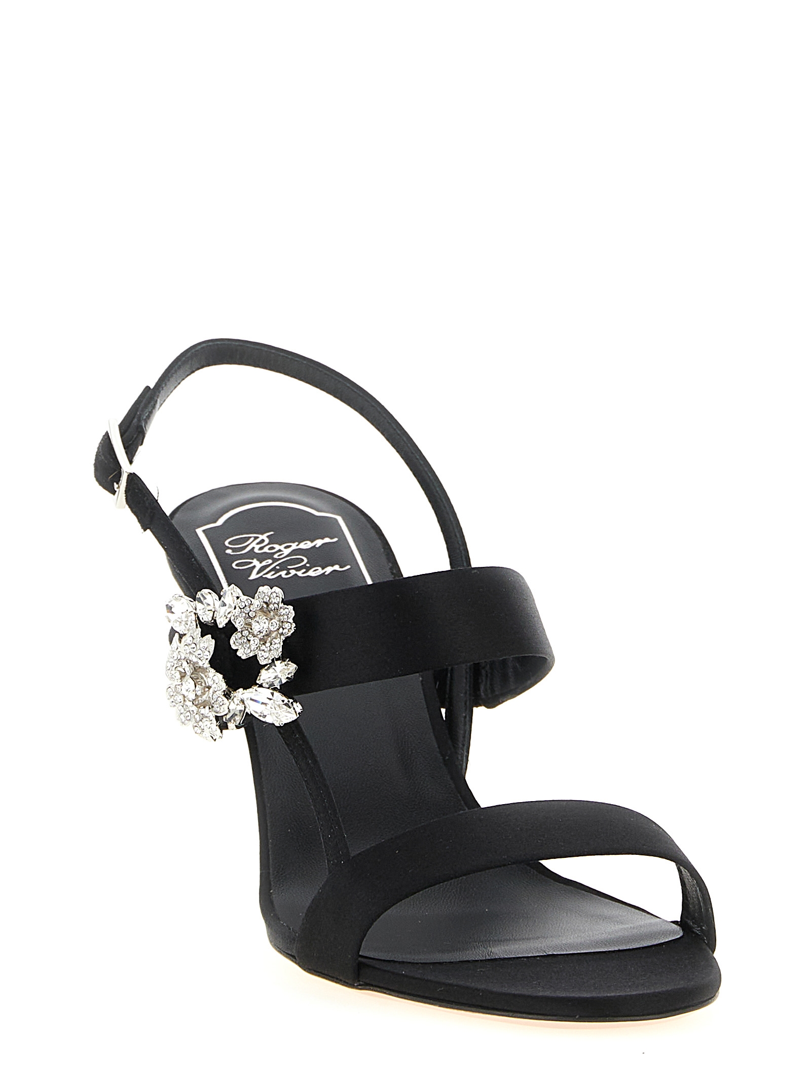 ‘Mini Bouquet’ satin sandals, jewel buckle with crystal flowers, adjustable strap, slim lacquered heel, leather sole.