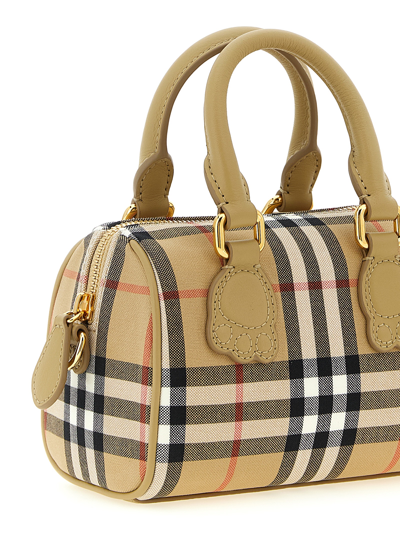 Burberry Check mini handbag in cotton canvas and tone-on-tone leather, bowling style, double fixed handle, top zip closure, adjustable and removable shoulder strap.