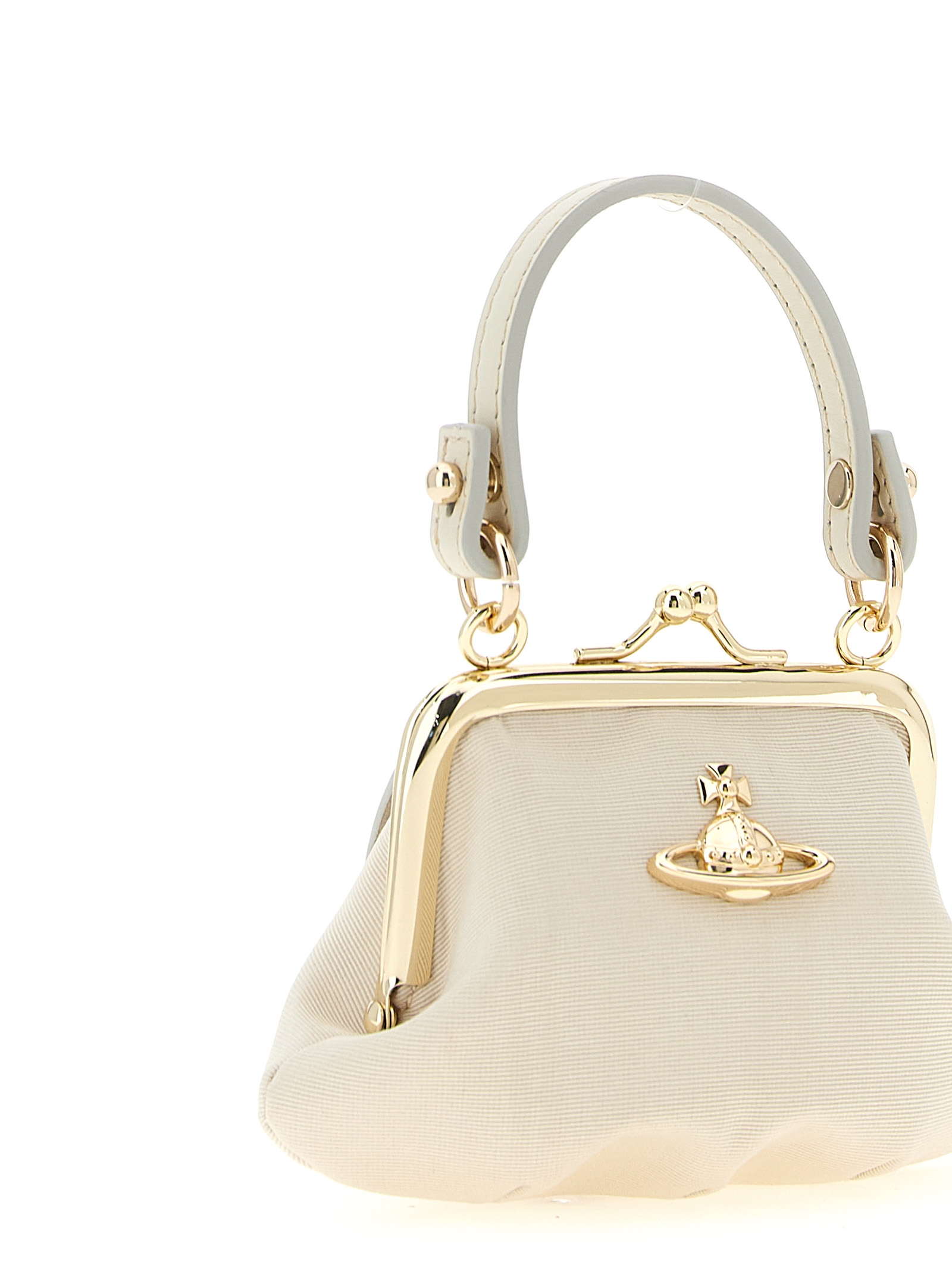 ‘Mini Granny’ handbag in Moiré fabric, front metal Orb logo, snap closure, removable handle, removable chain shoulder strap, back belt loop in tone-on-tone leather-effect fabric with embossed logo.