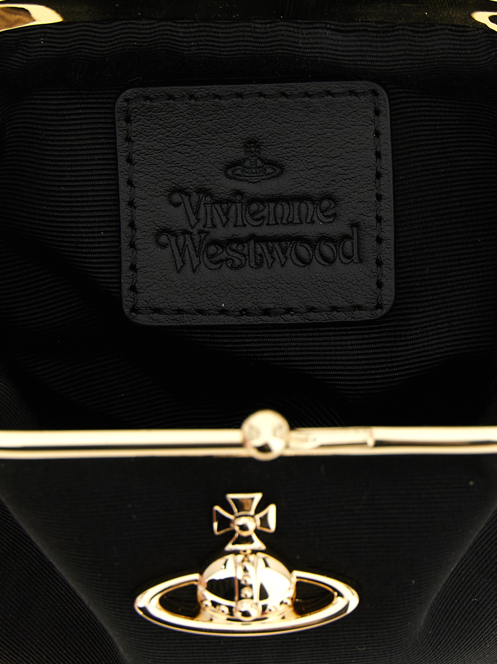 ‘Mini Granny’ handbag in Moiré fabric, front metal Orb logo, snap closure, removable handle, removable chain shoulder strap, back belt loop in tone-on-tone leather-effect fabric with embossed logo.