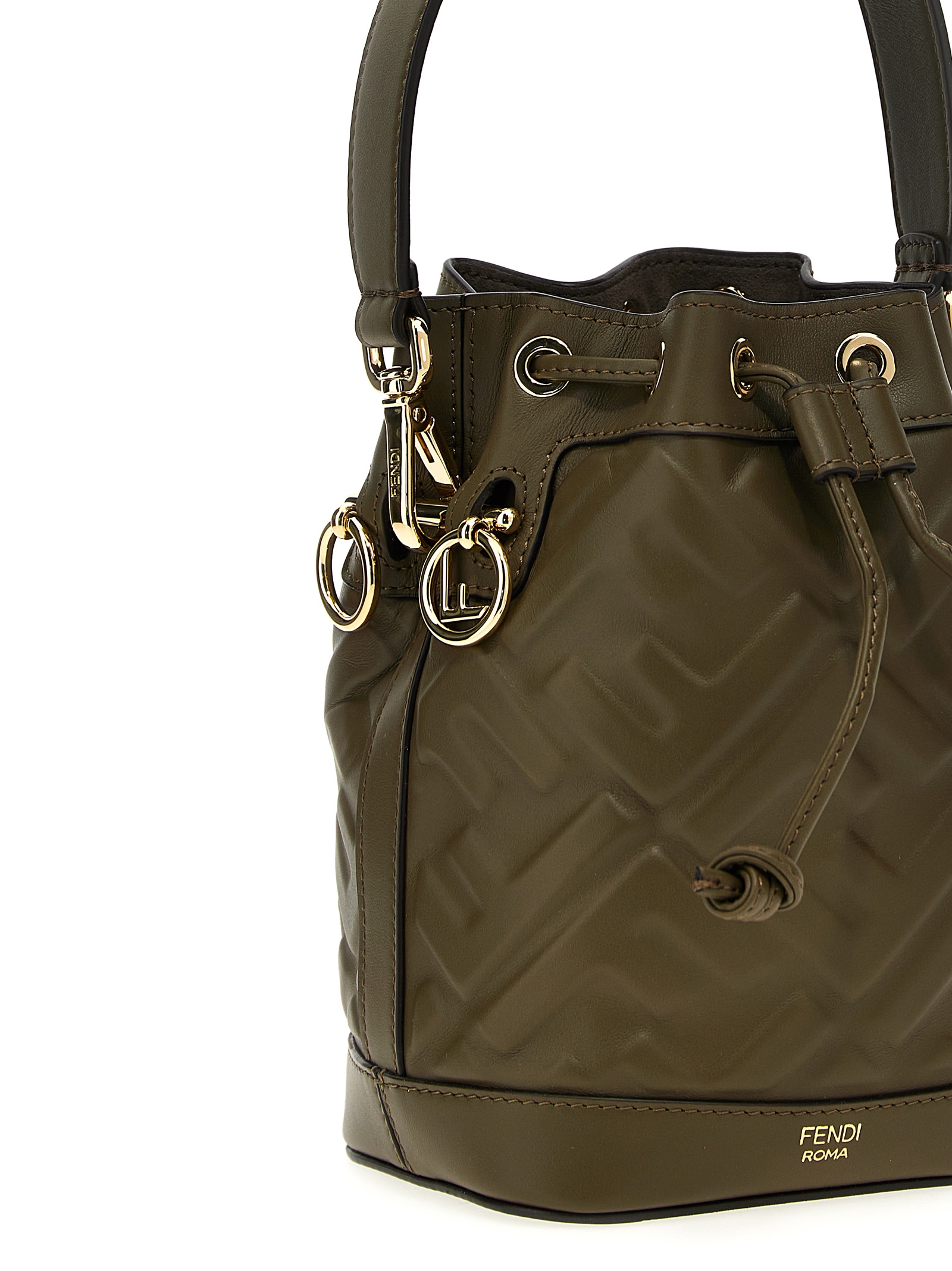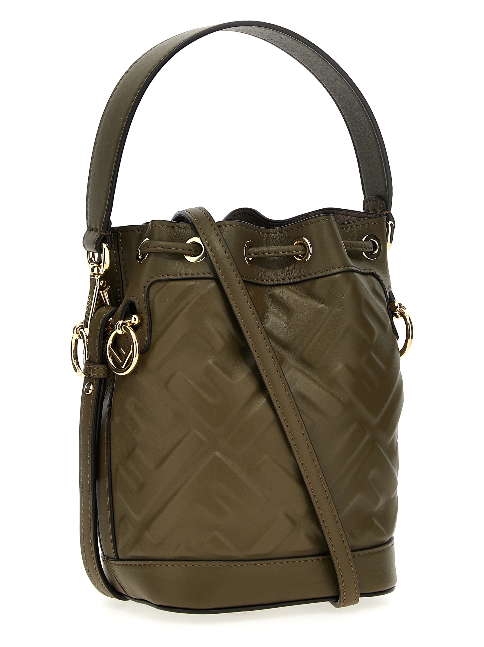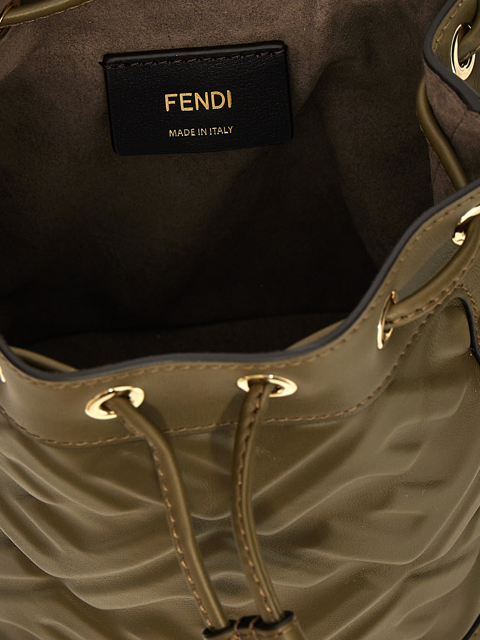 ‘Mon Tresor’ mini leather handbag with all-over FF logo pattern, drawstring closure, removable short handle, removable long shoulder strap.