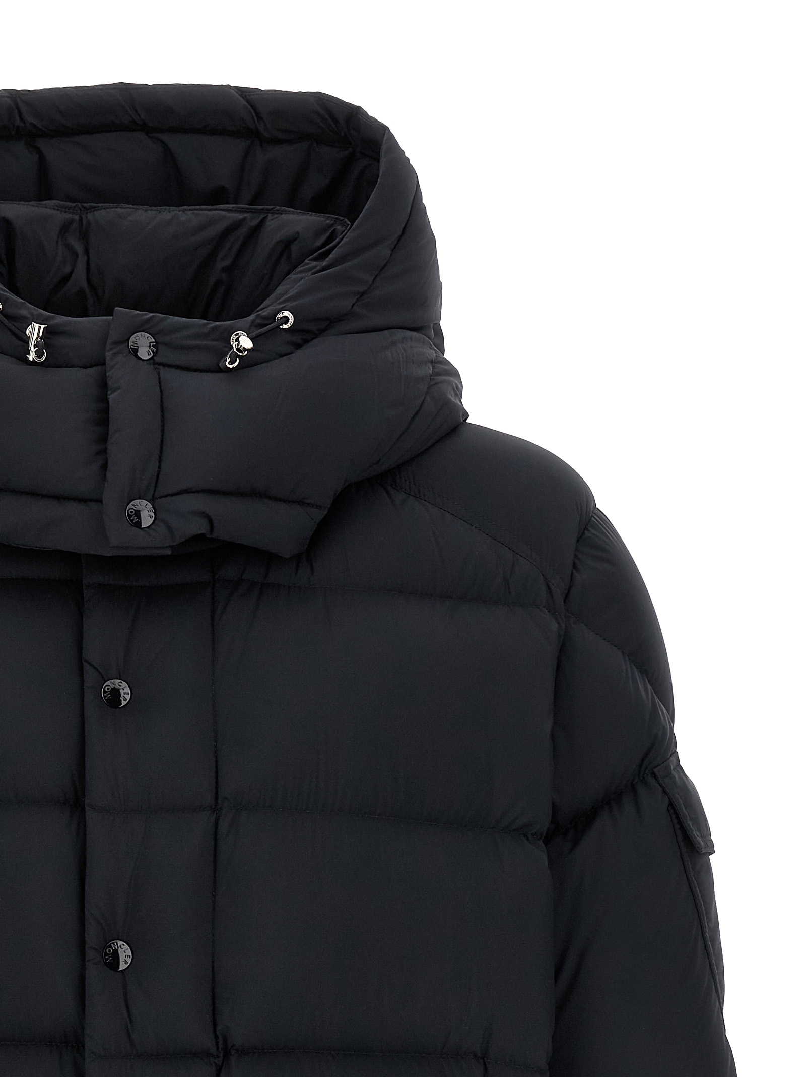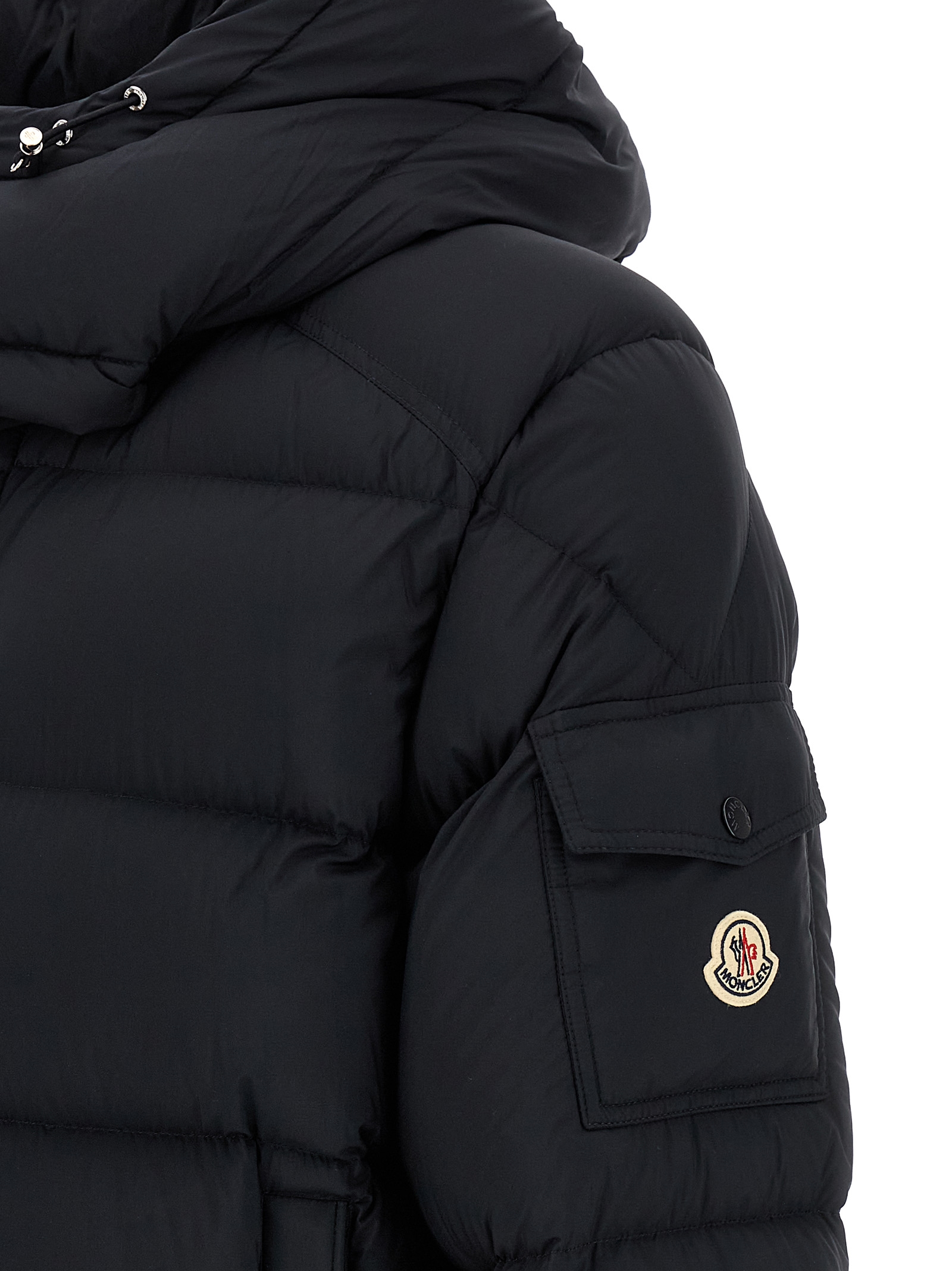 Quilted longue Moncler Maya 70′ down jacket in quilted saison longue with goose down padding, léger nylon lining, adjustable and removable hood, standing collar, front zip closure, pockets, long sleeves with elastic and adjustable cuffs, felt logo patch, drawstring at the hem.