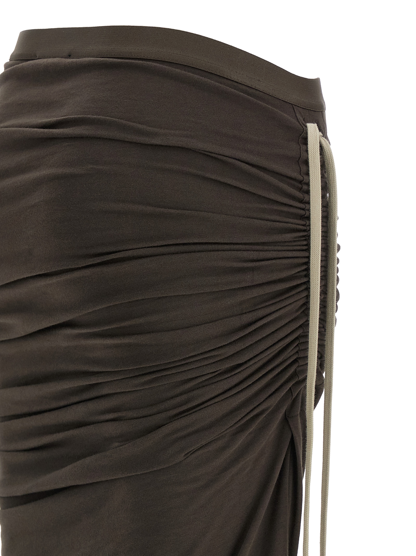 Moncler + Rick Owens ‘Adjustable’ cotton jersey skirt with front logo patch, wide side split with drawstring to adjust its width, elastic waistband, wide train.