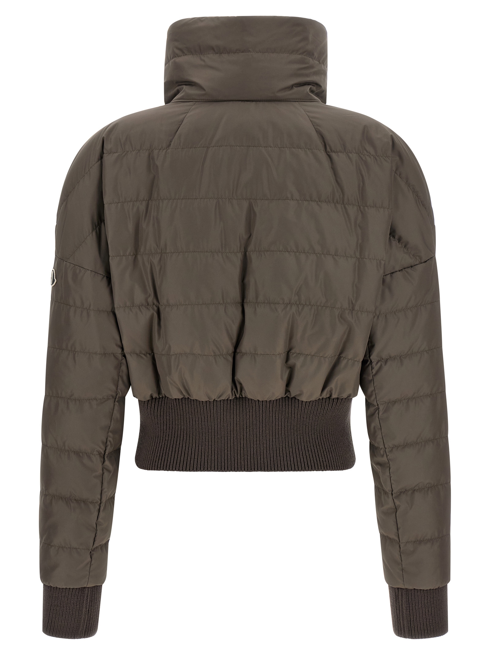 Moncler + Rick Owens ‘Cropped’ down jacket in quilted saison longue with goose down padding, tone-on-tone ribbed stretch knit details, crop style, crater neck, front zip closure, long cuffed sleeves, dropped shoulders and logo patch appliqué, and headband.eadband.