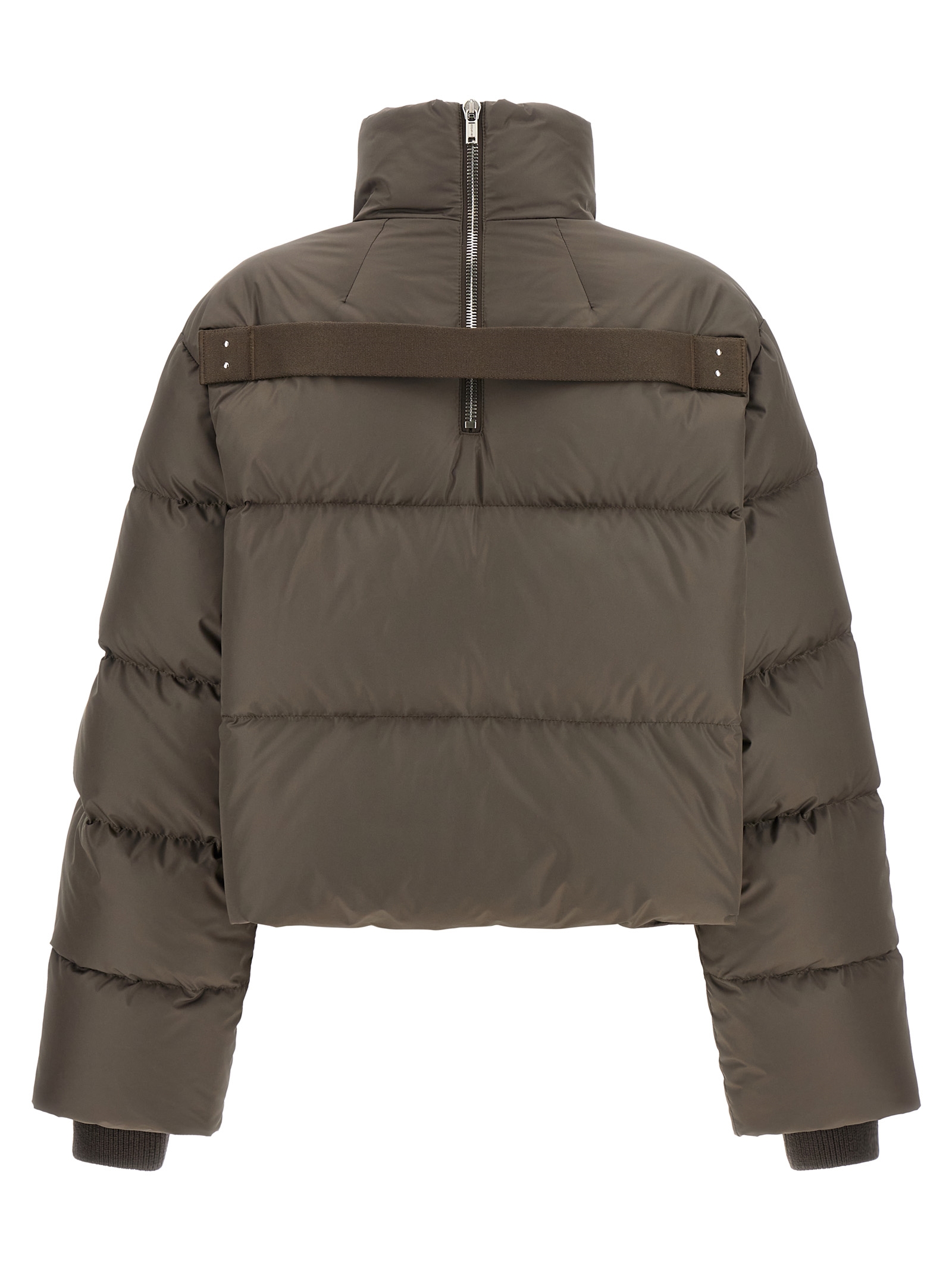 Moncler + Rick Owens ‘Cyclopic Cropped’ down jacket in quilted and goose down padded saison longue, crop model, high neck with back zip, front zip closure, pockets, long sleeves with tone-on-tone stretch ribbed knit cuffs and logo patch appliqué, tone-on-tone cotton tape on the back.he back.