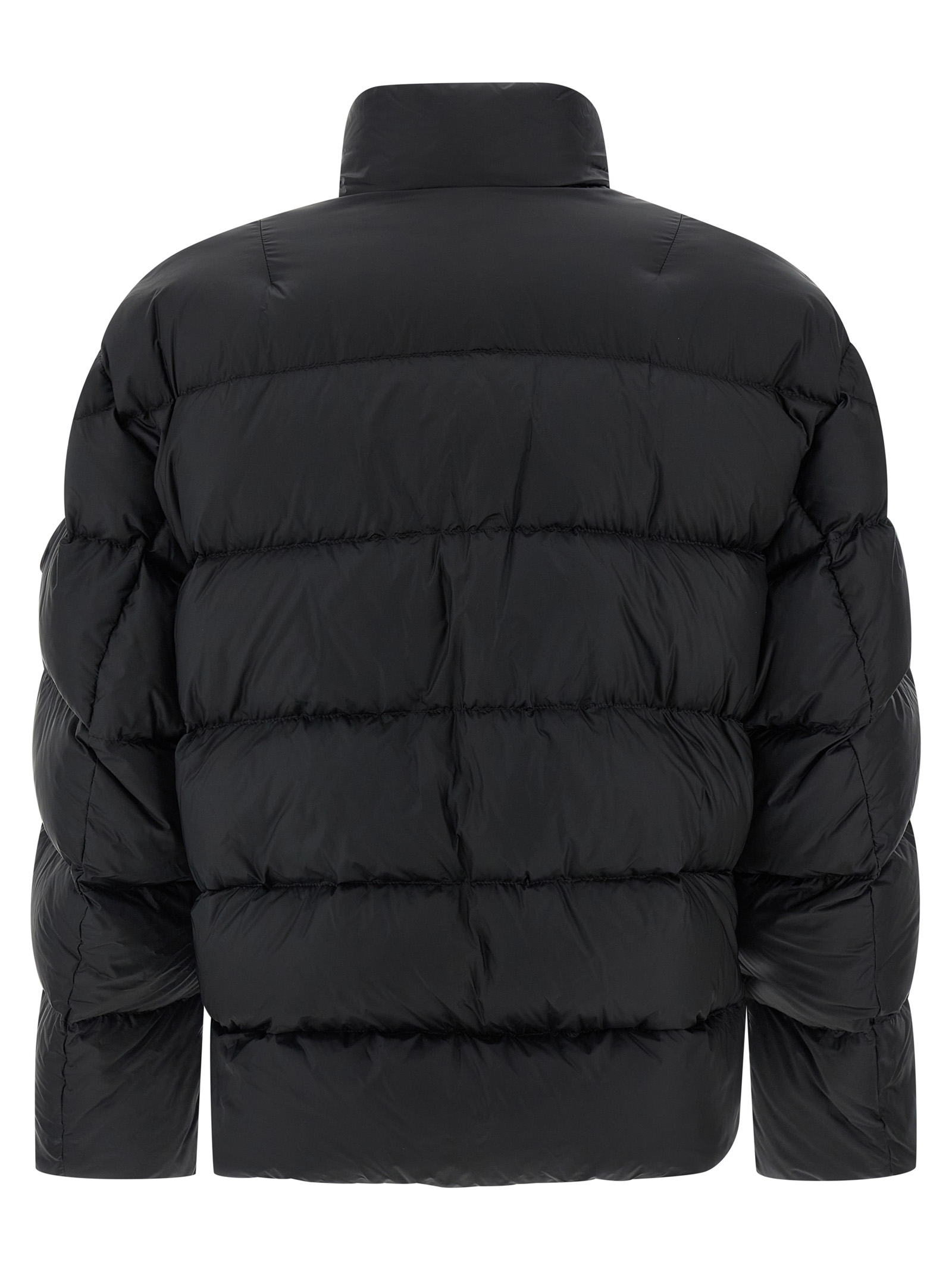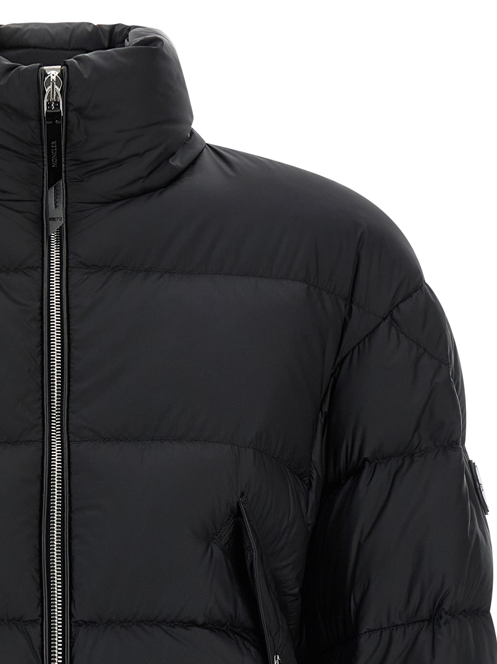 Moncler x Edward Enninful ‘Blas’ quilted nylon jacket with goose down padding, flared silhouette, high neck, front zip closure, pockets, long sleeves with elastic cuffs and tone-on-tone logo patch appliqué, side slits with snap buttons, drawstring on asymmetrical hem.