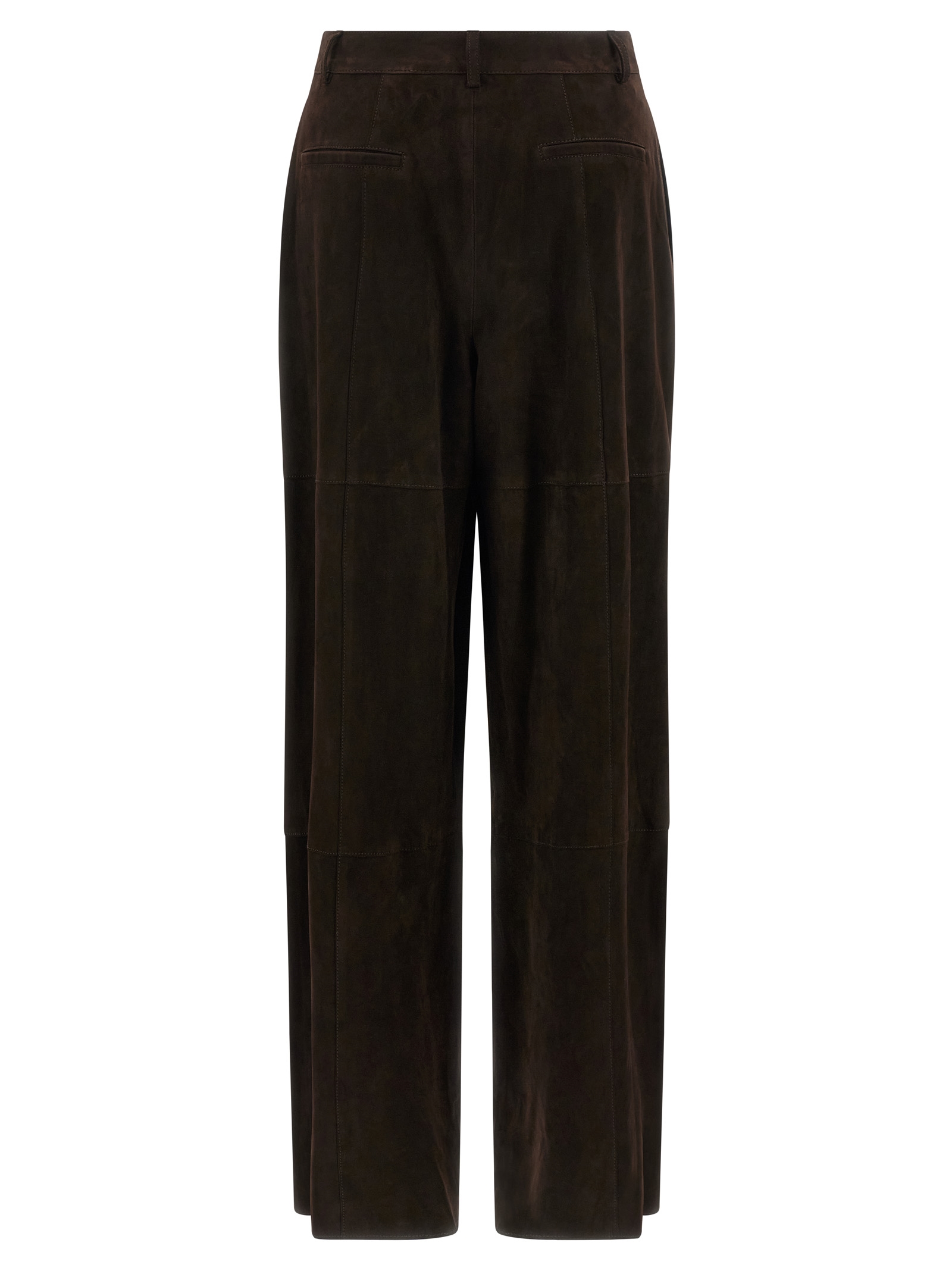 ‘Monet25W’ suede pants, panel construction, pleats, wide and straight leg, zip and button closure, pockets, lining, leg bottoms with raw cut hem.