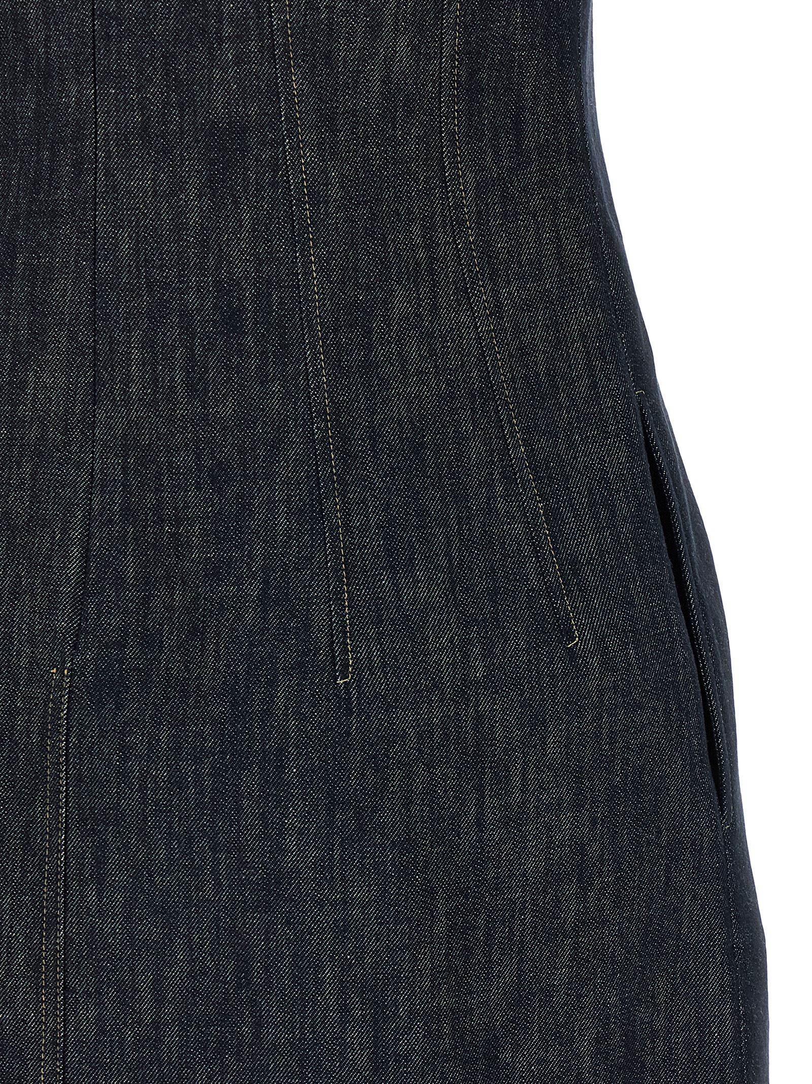 Cotton denim mini dress with contrast stitching, hourglass silhouette, crew neck with Monile detail, pockets, short sleeves, back zip closure.