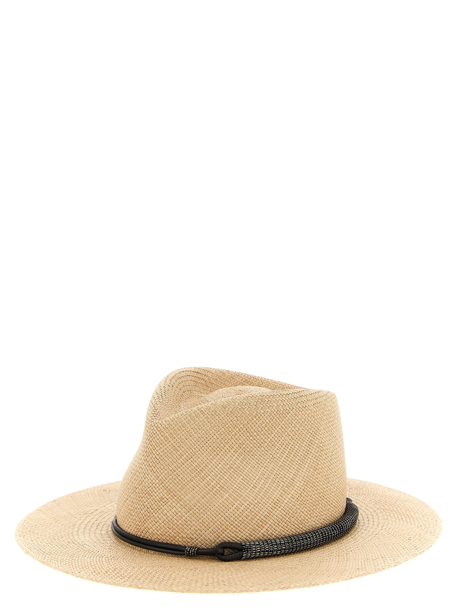 Woven raffia hat, fedora model, tubular leather band and Monile.