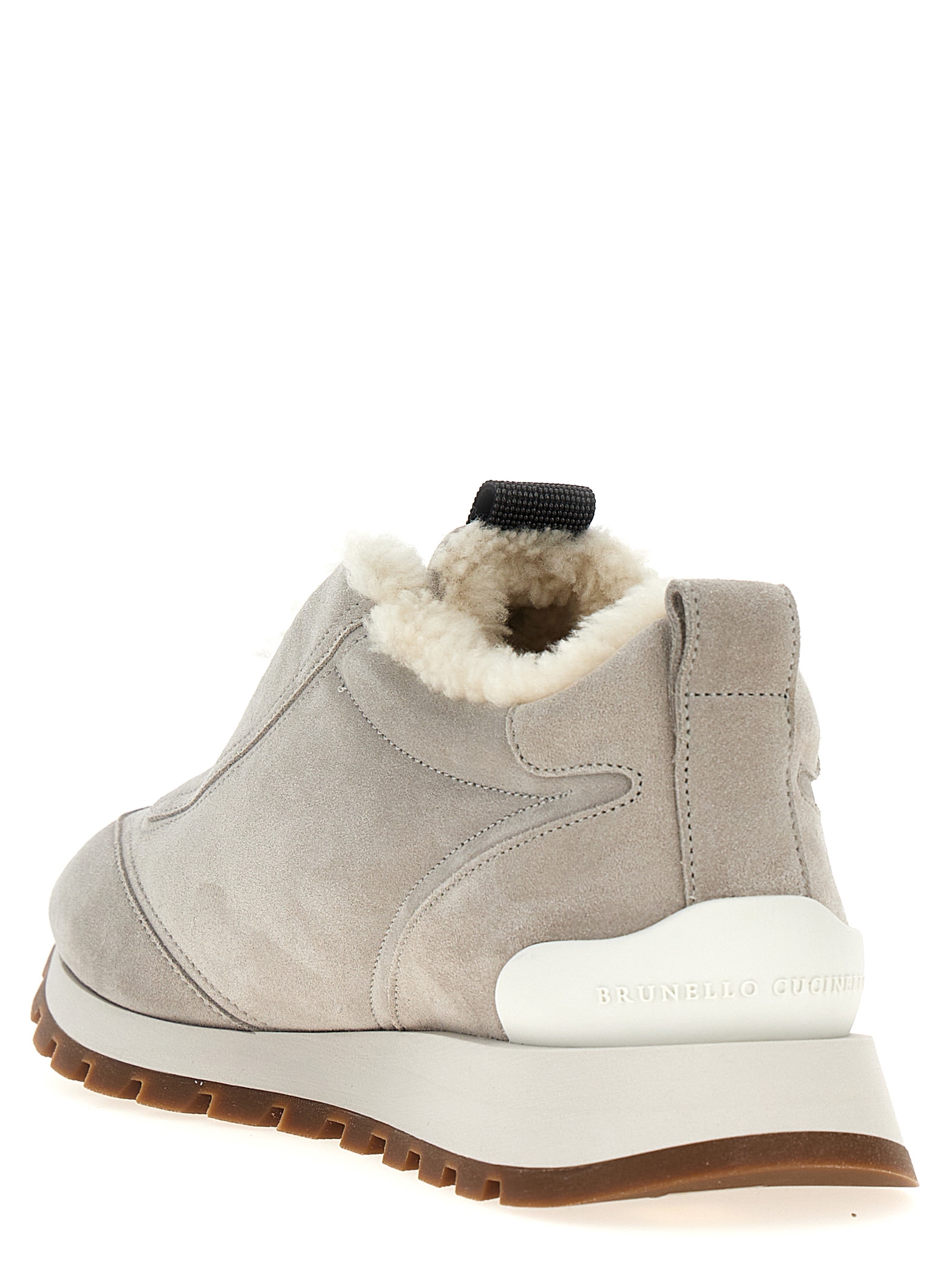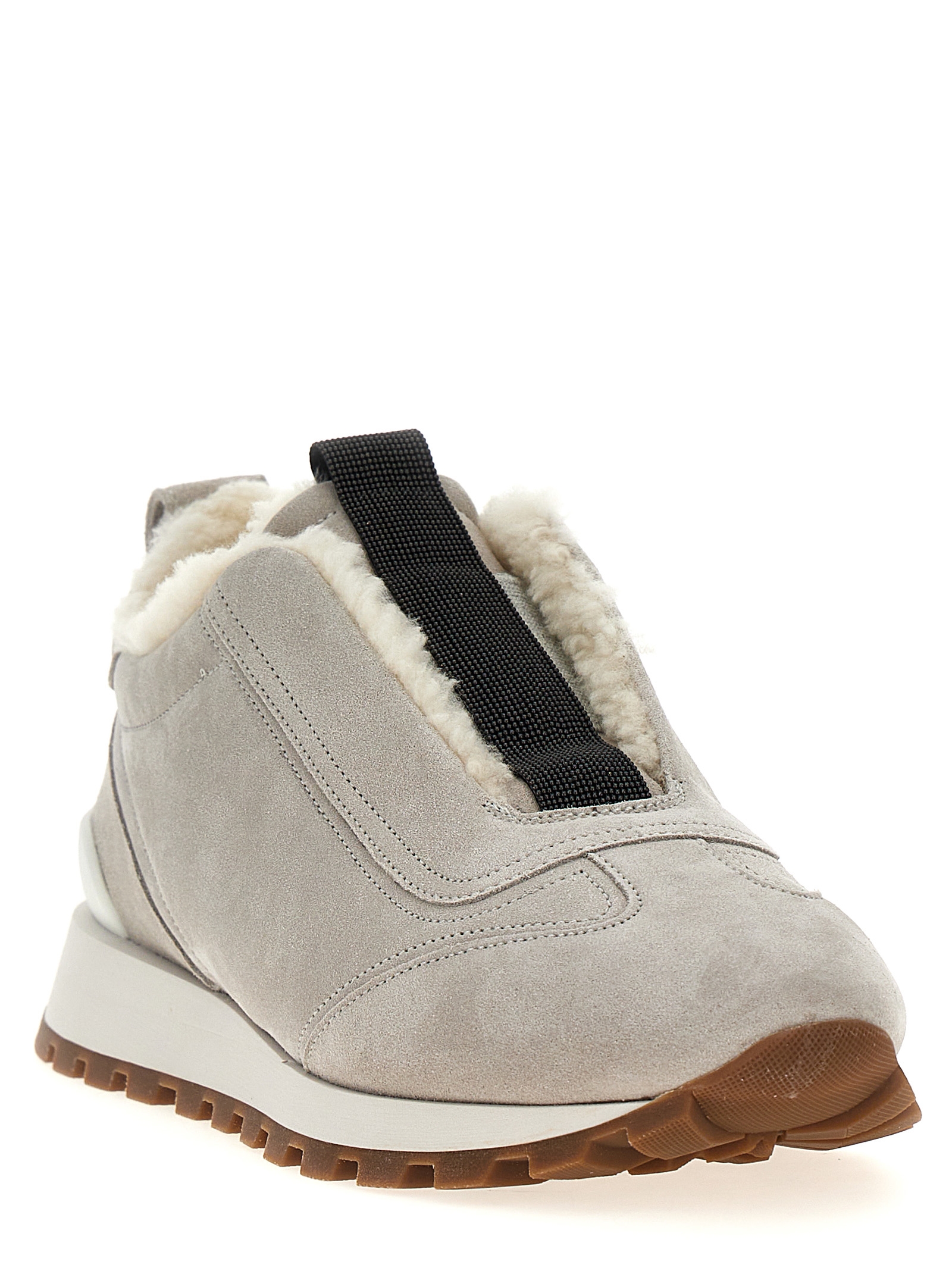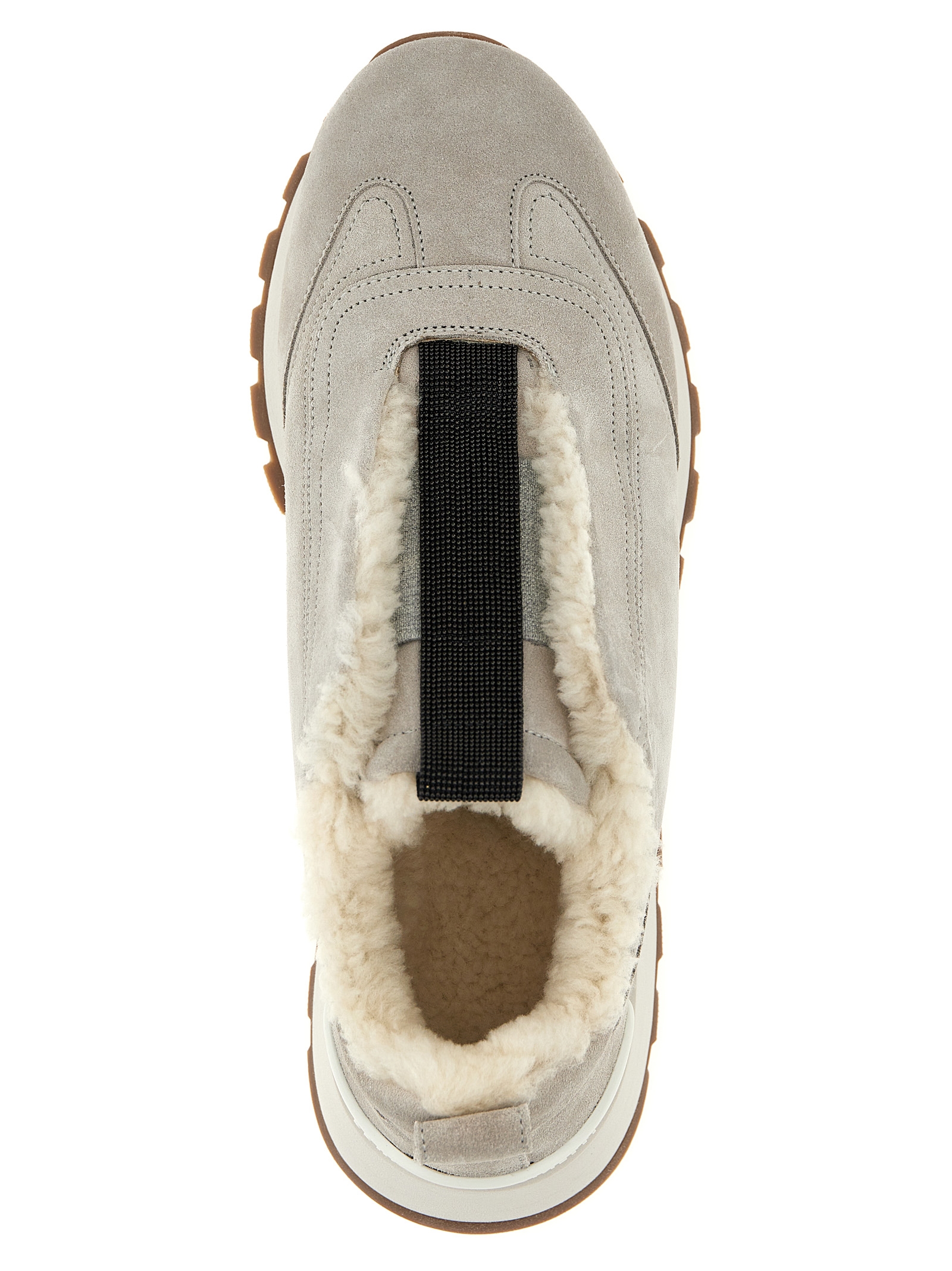 Suede sneakers, fur lining, ‘Monile’ detail at the center, elastic, rubber sole.