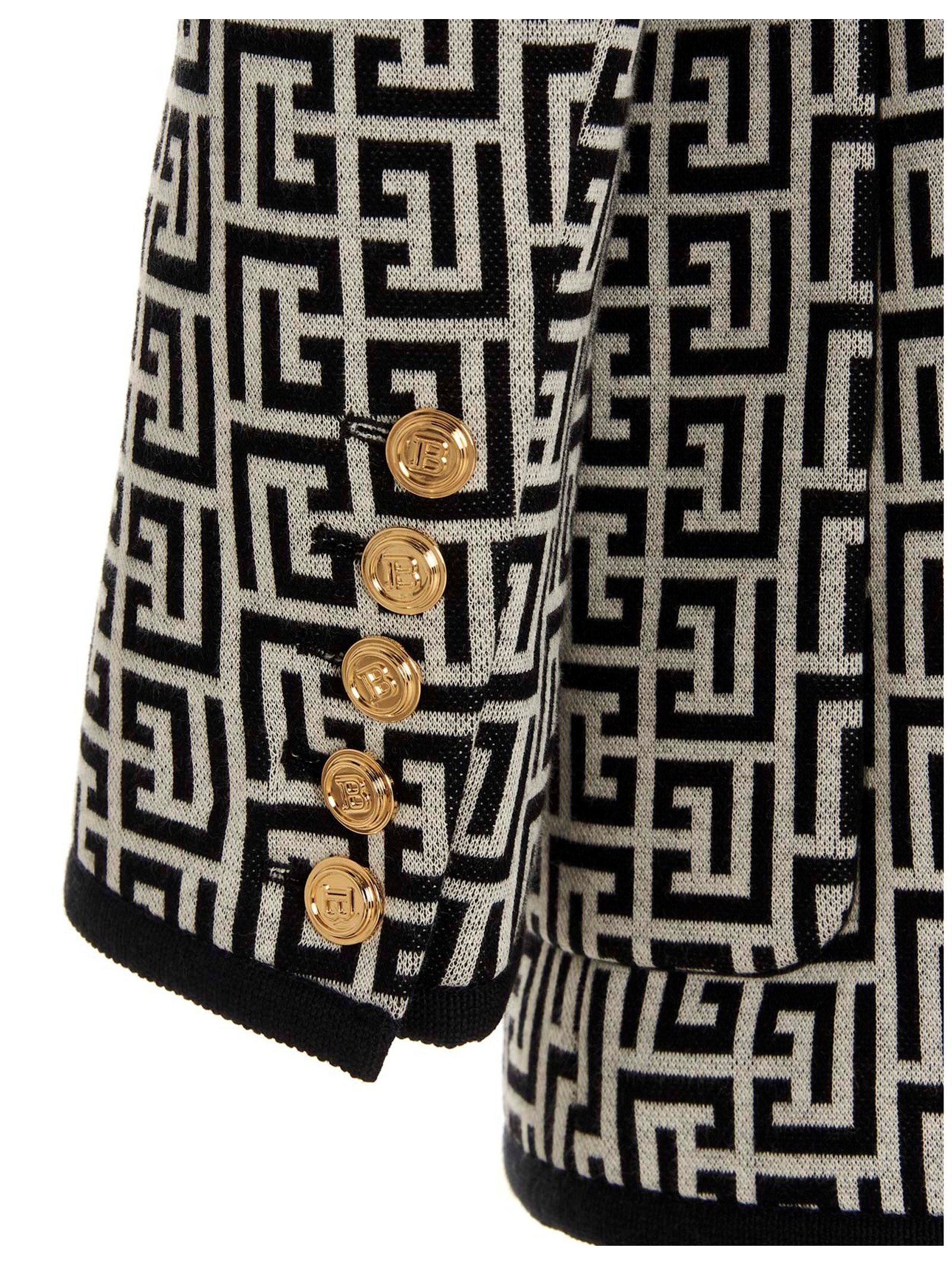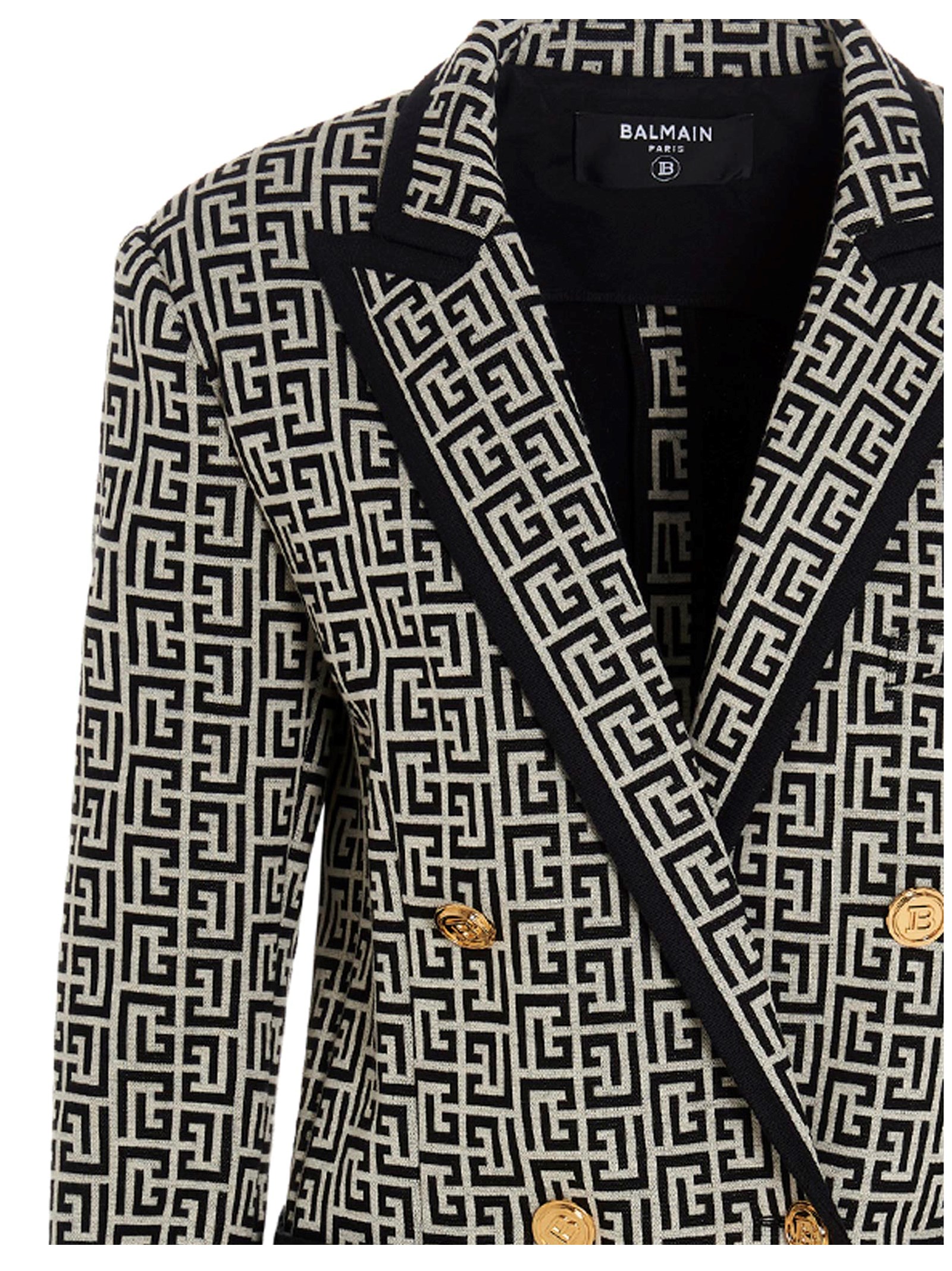 Balmain ‘Monogram’ cotton boyfriend double-breasted blazer with an all over logo, gold logo buttons and peak lapels. Comfort fit.