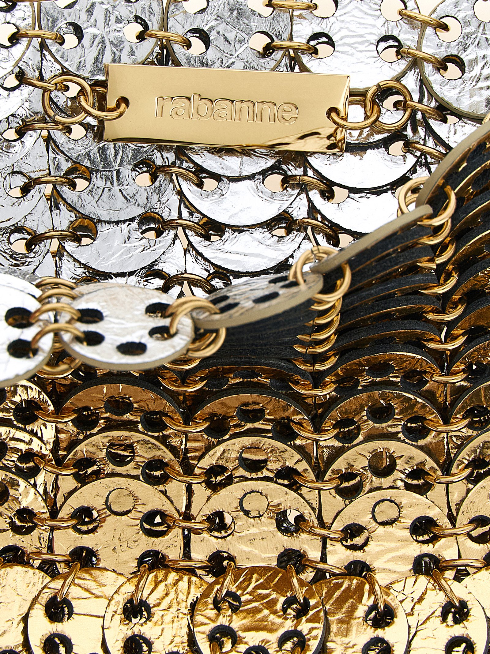 ‘Moon Flip’ reversible shoulder bag in metal mesh with two-tone hand-assembled silver and gold leather patterns, fixed handle.
