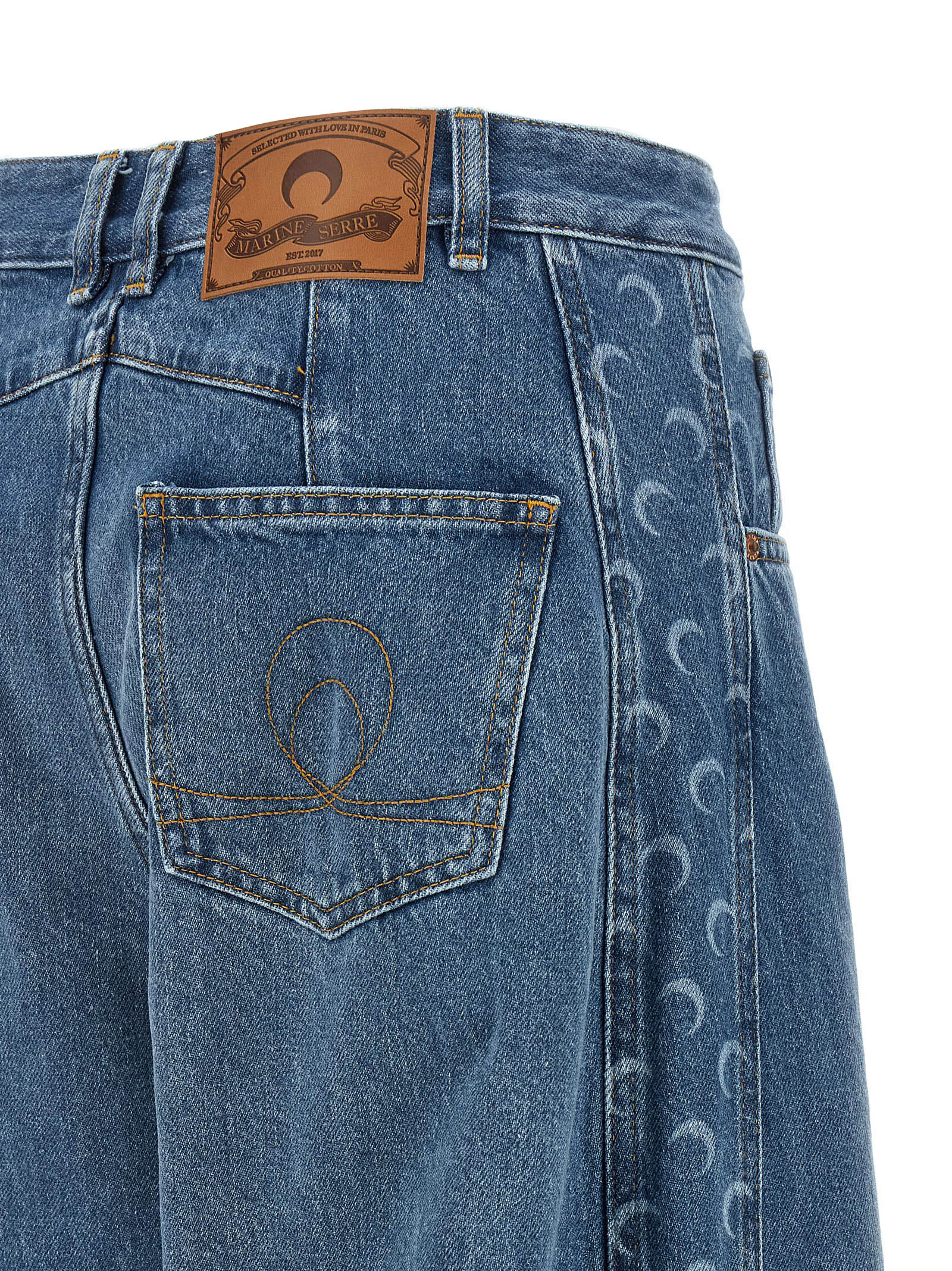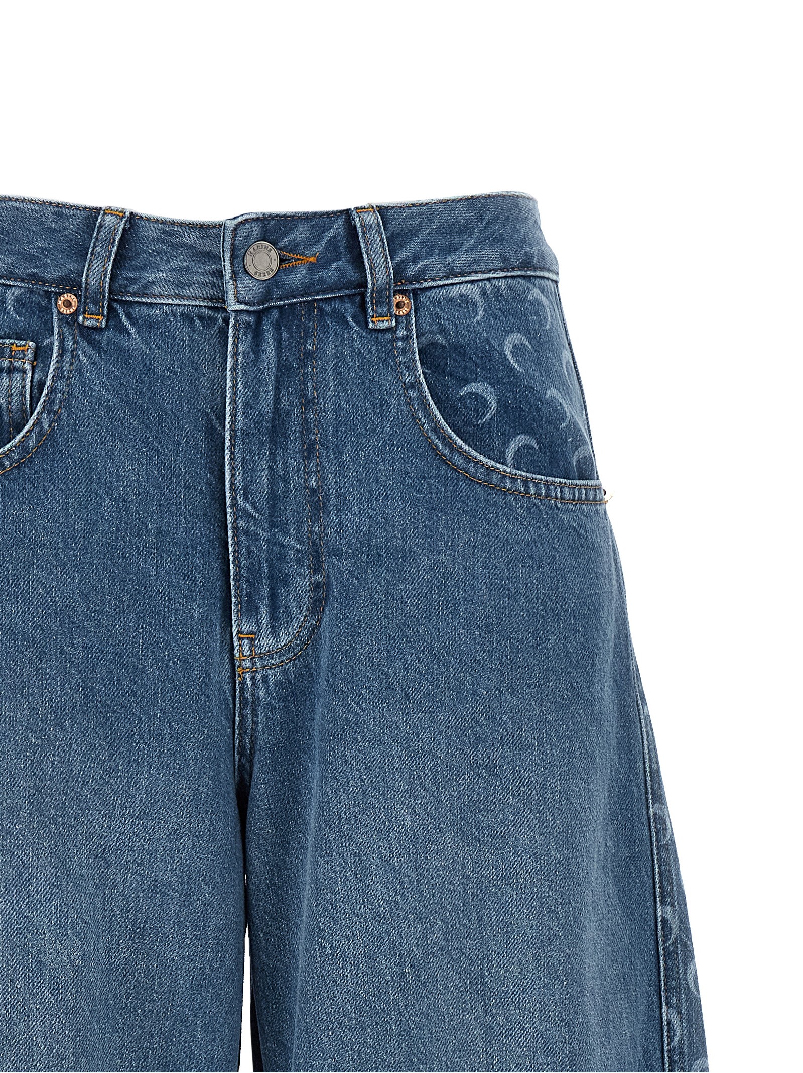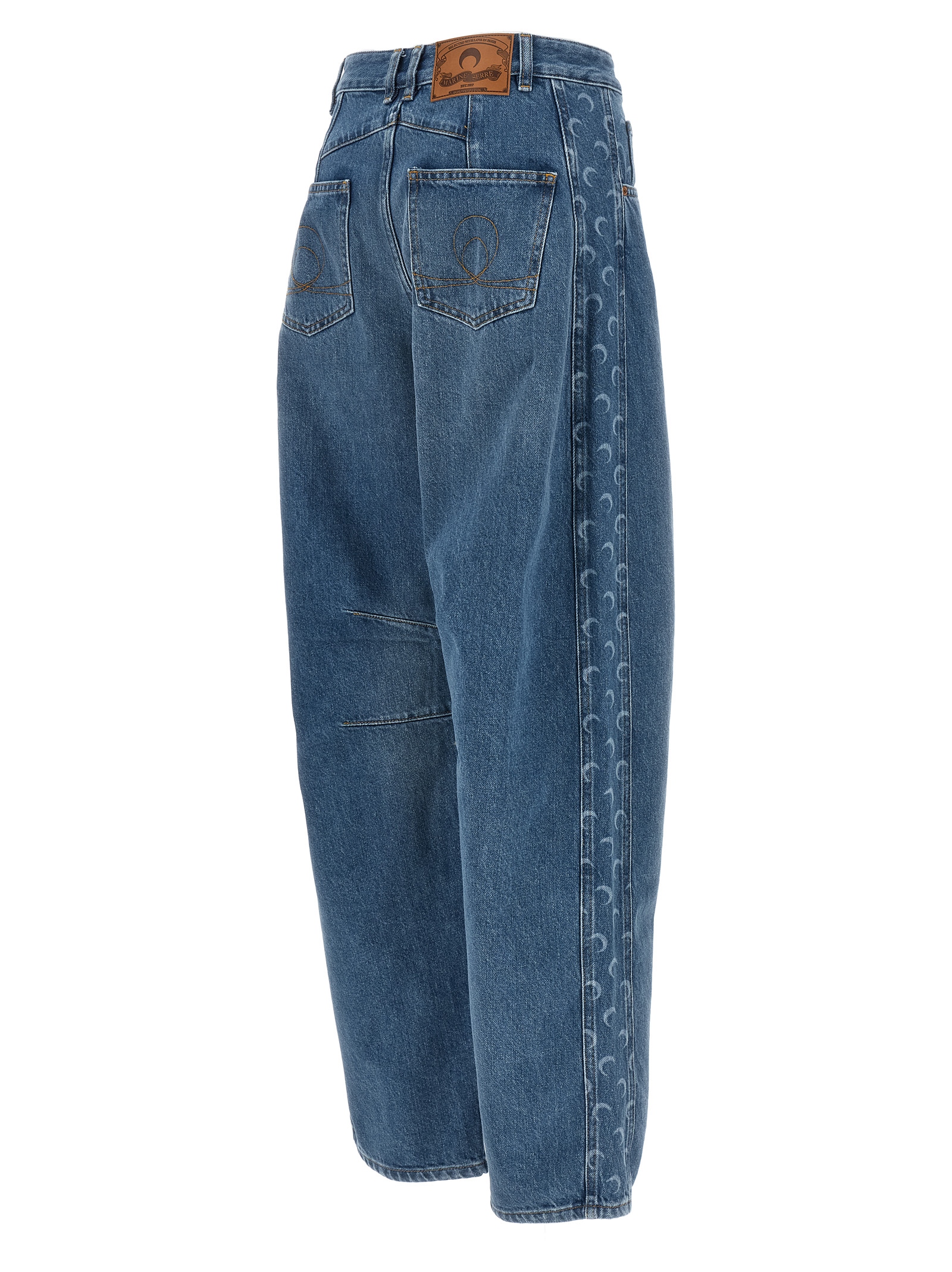 Stone-washed cotton denim jeans, contrast stitching, side inserts and pockets with lasered ‘Moon’ logo, mid waist, wide and curved leg with knee pincer, zip and front button closure, five pockets, and back leather logo tag.