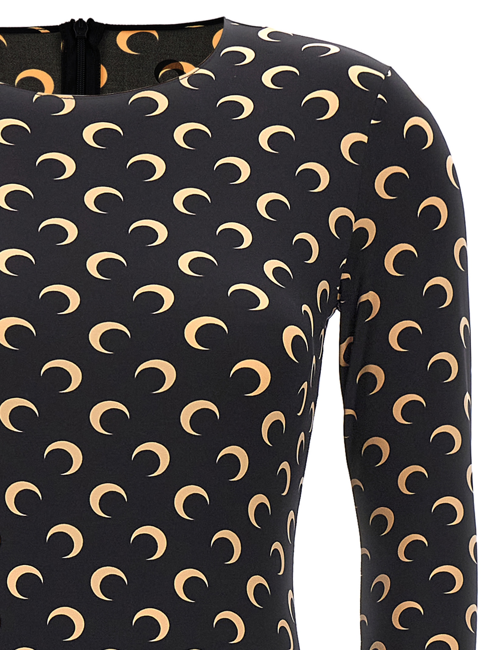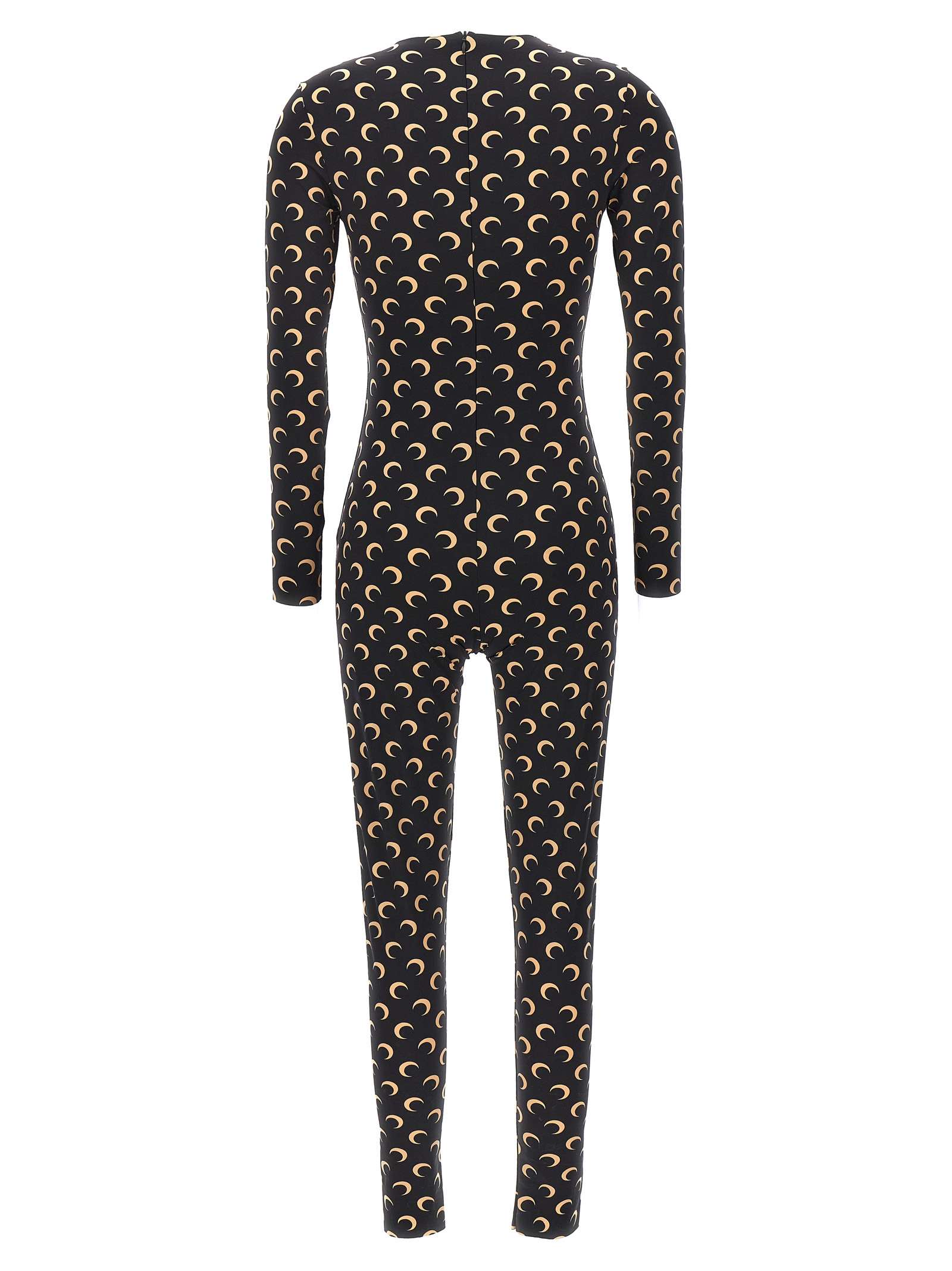 ‘Moon Printed’ stretch fabric catsuit with all-over logo print, crew neck with long sleeves, back zip closure.